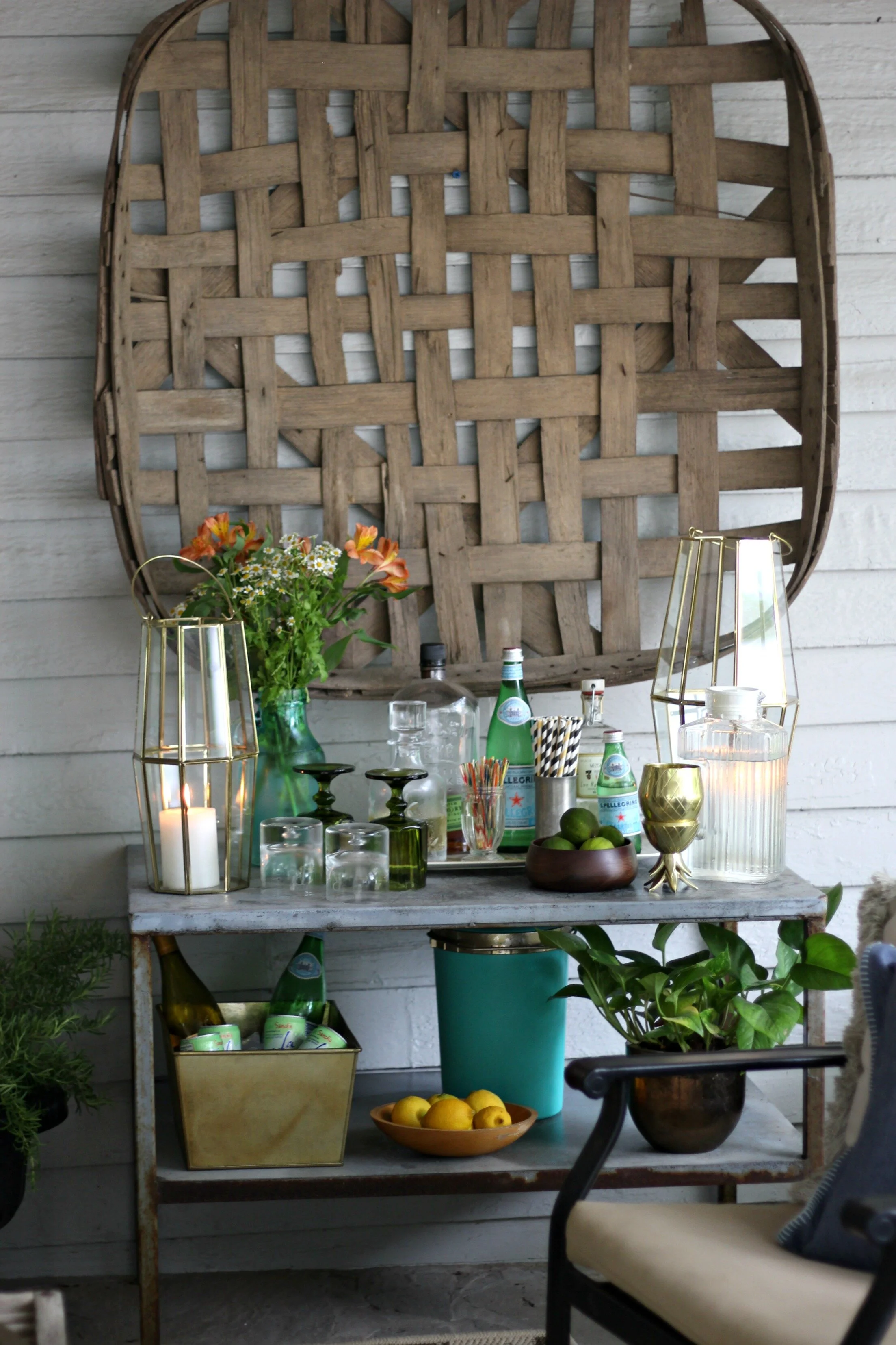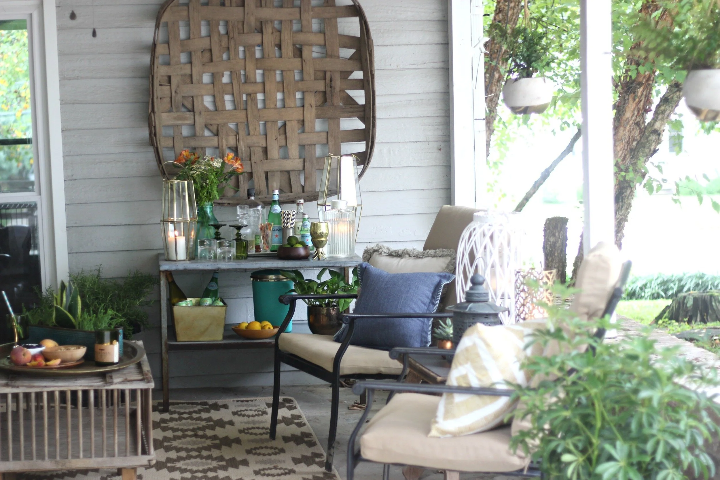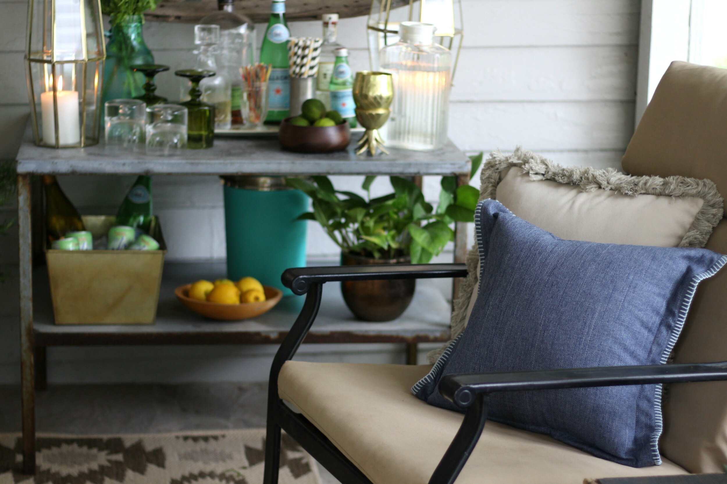 I love the collected look that all these different styles of lanterns adds to the patio. I found all my lanterns at Home Goods and Hobby Lobby (and one is from a yard sale). They also add the most beautiful soft light to your space when all the candles are lit! If you like to entertain, having a little space to serve drinks or food on your porch is a must! You can really use any kind of table and instantly transform it into a bar by the way you style it! Just add some glasses, your favorite drinks, an icebucket, some straws, and any other barware you might have. Just setting out a small bowl of lemons, limes, or fruit adds the perfect pop of color too!