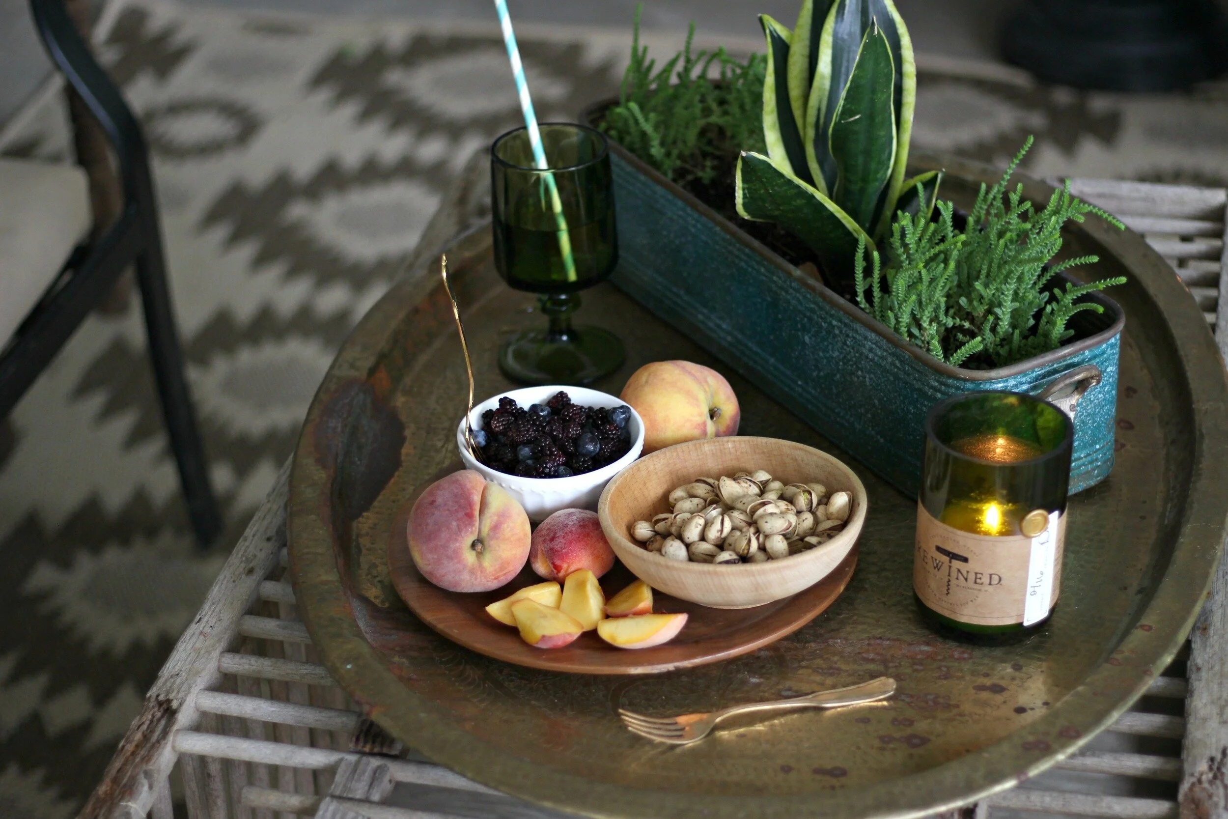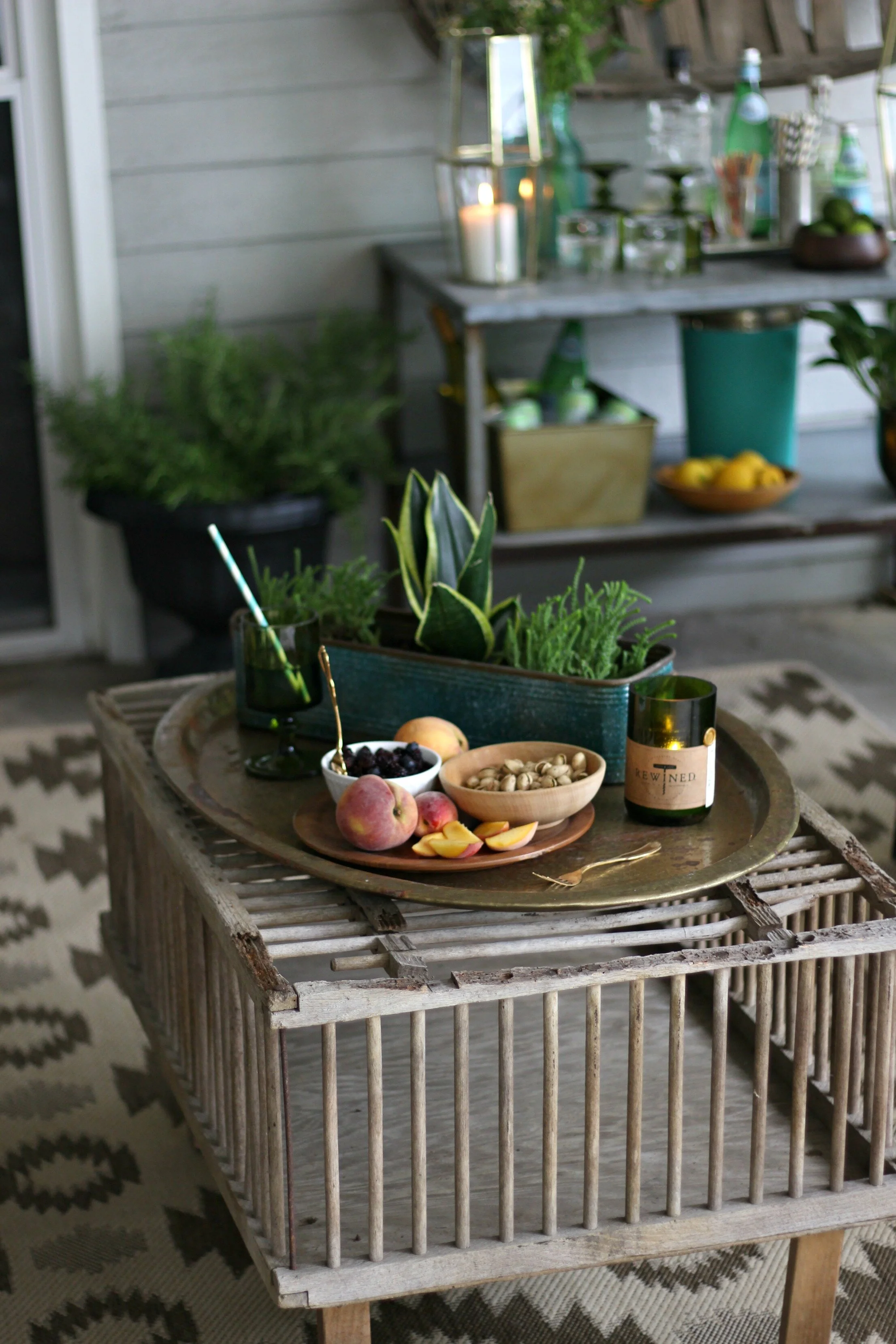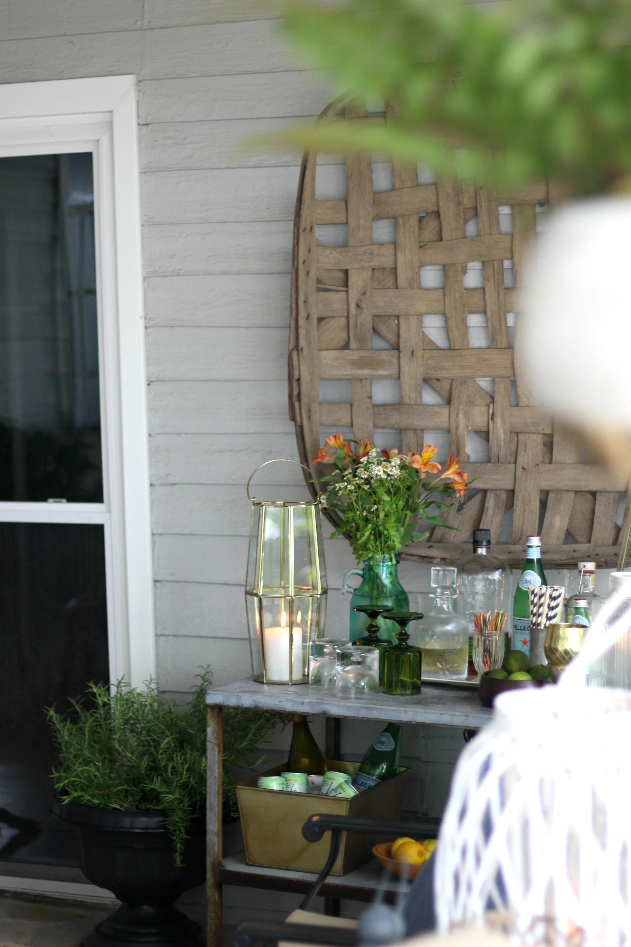 I love the collected look that all these different styles of lanterns adds to the patio. I found all my lanterns at Home Goods and Hobby Lobby (and one is from a yard sale). They also add the most beautiful soft light to your space when all the candles are lit! If you like to entertain, having a little space to serve drinks or food on your porch is a must! You can really use any kind of table and instantly transform it into a bar by the way you style it! Just add some glasses, your favorite drinks, an icebucket, some straws, and any other barware you might have. Just setting out a small bowl of lemons, limes, or fruit adds the perfect pop of color too!
