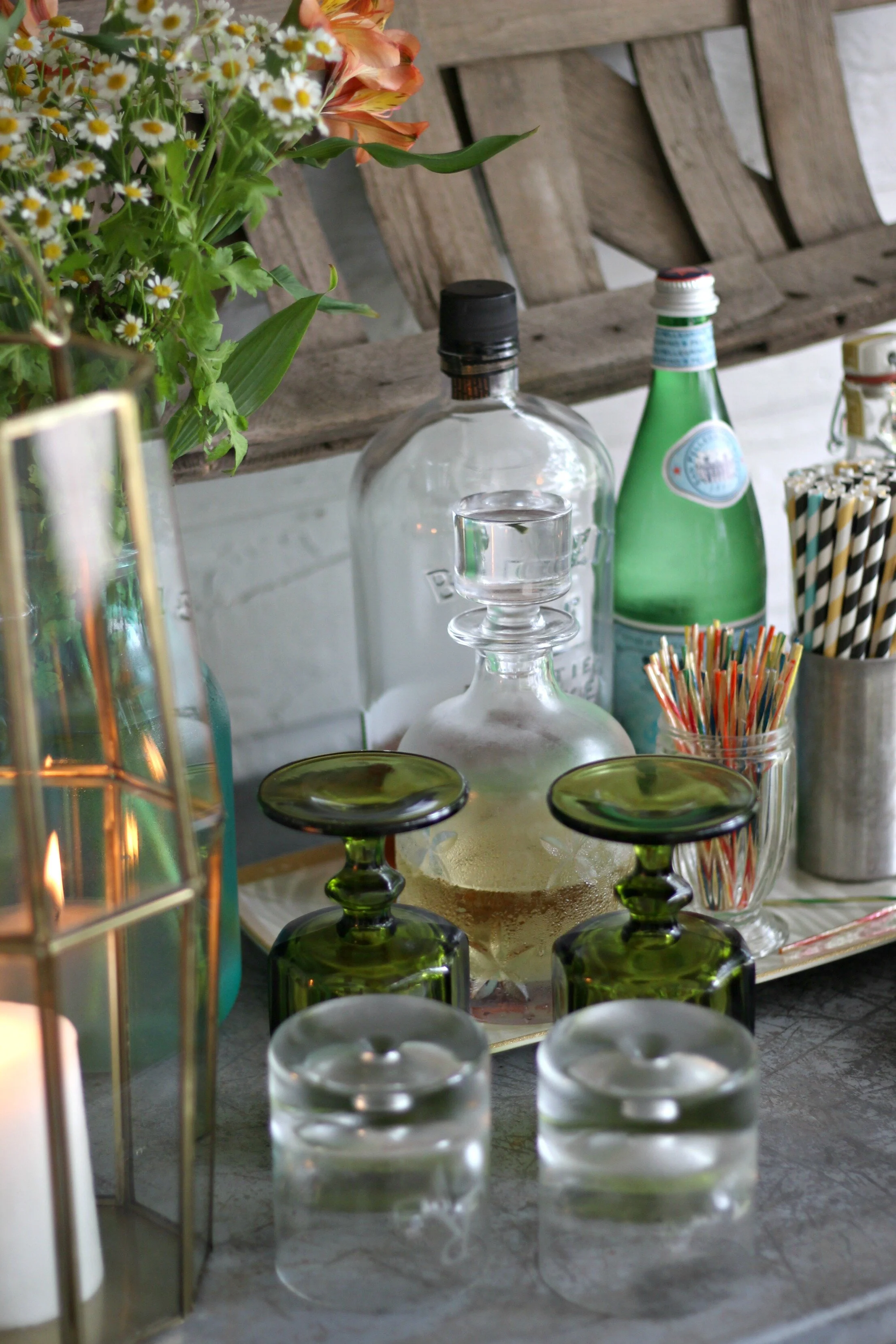 5. Makeshift bar: Every patio needs a little serving space! I used an old metal table (bought at a garage sale for $10) as a sideboard for serving snacks/drinks. All the accessories on it are vintage or from Homegoods.