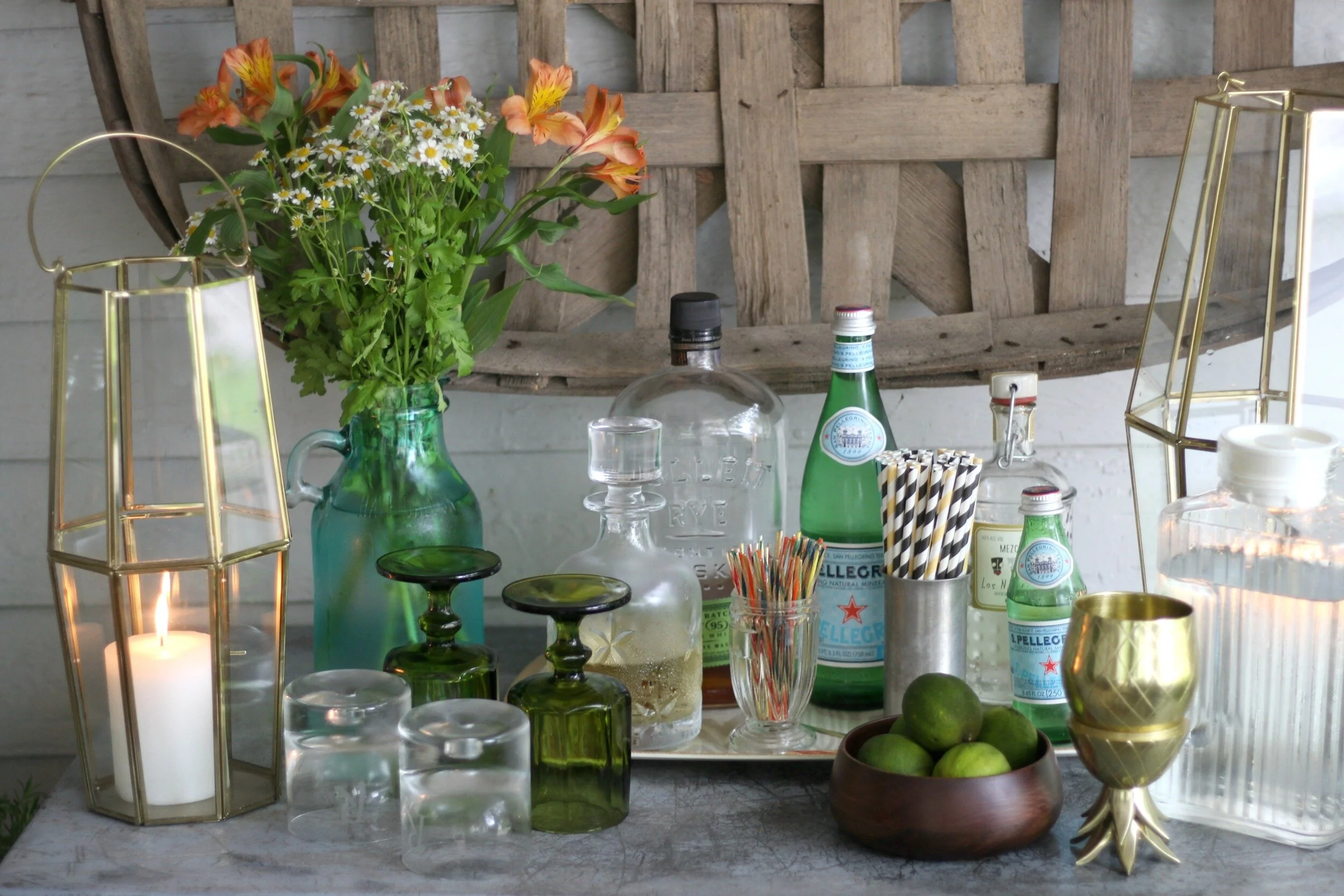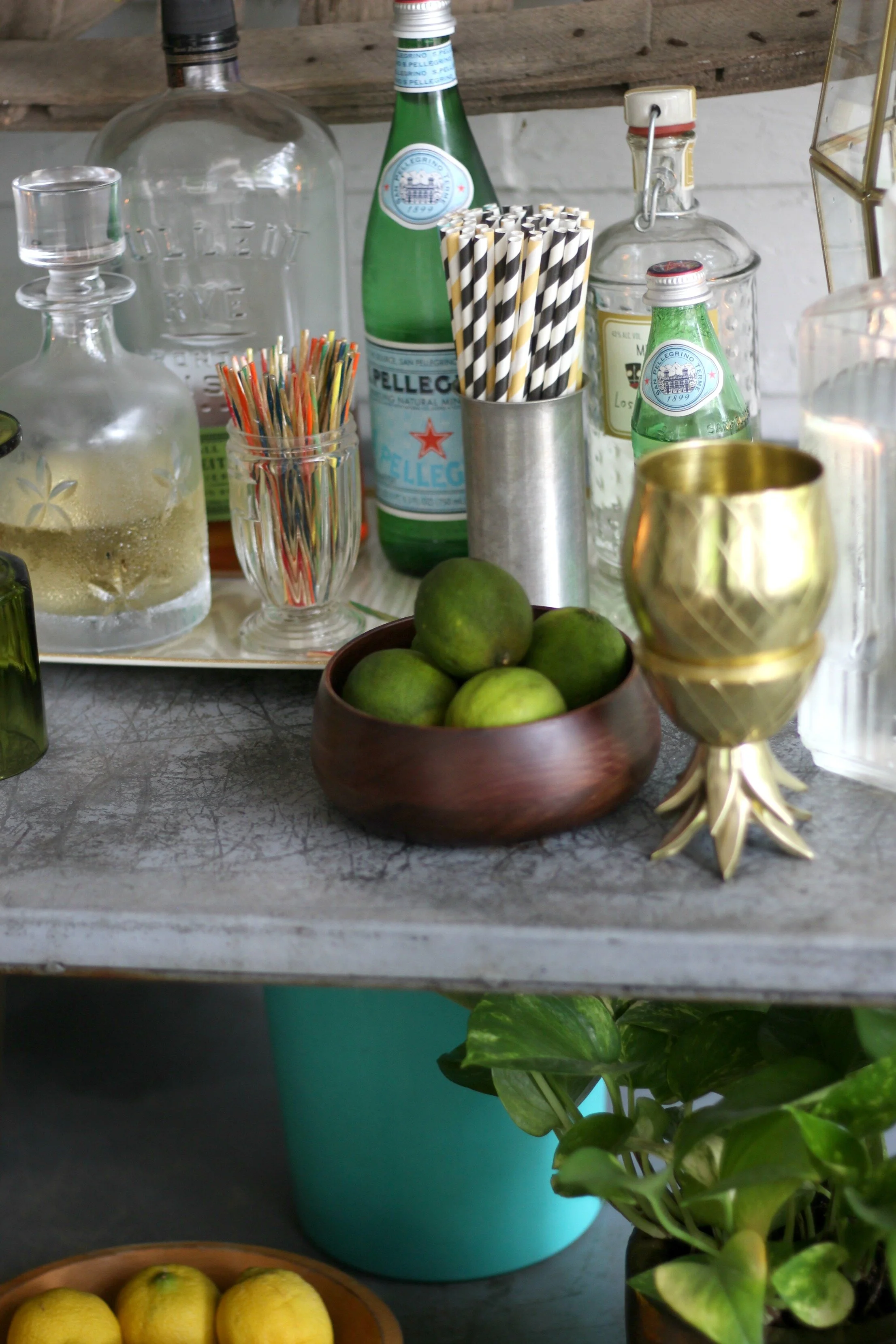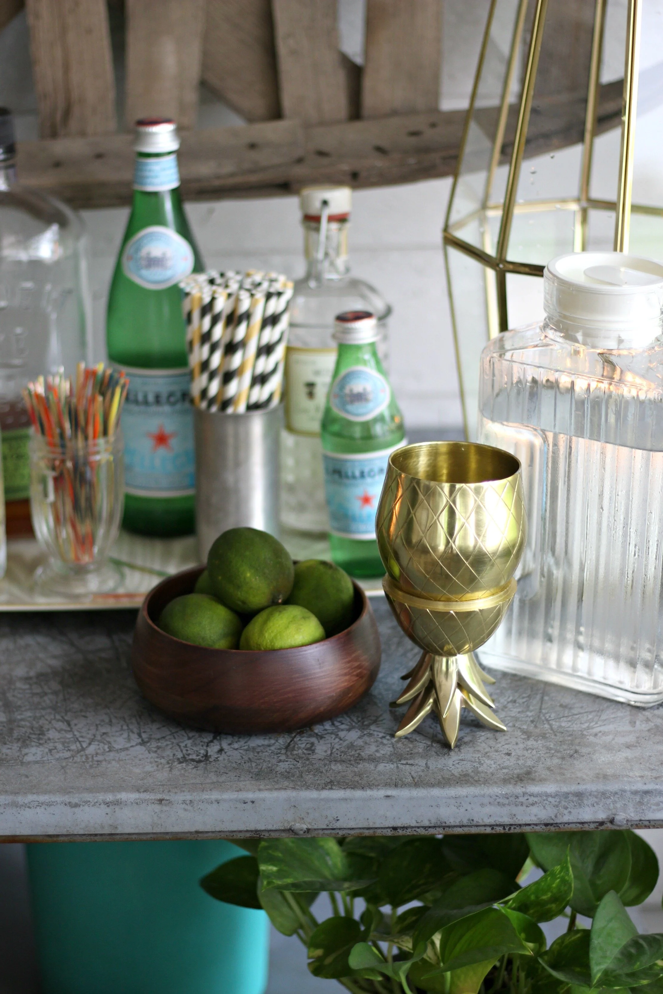 Gold faceted lanterns: Home Goods | Metal table: vintage (thrifted) | all glassware + icebucket: thrifted | Brass bin: Home Goods | Tobacco basket: vintage (thrifted | Pineapple shaker: Miss Molly Vintage