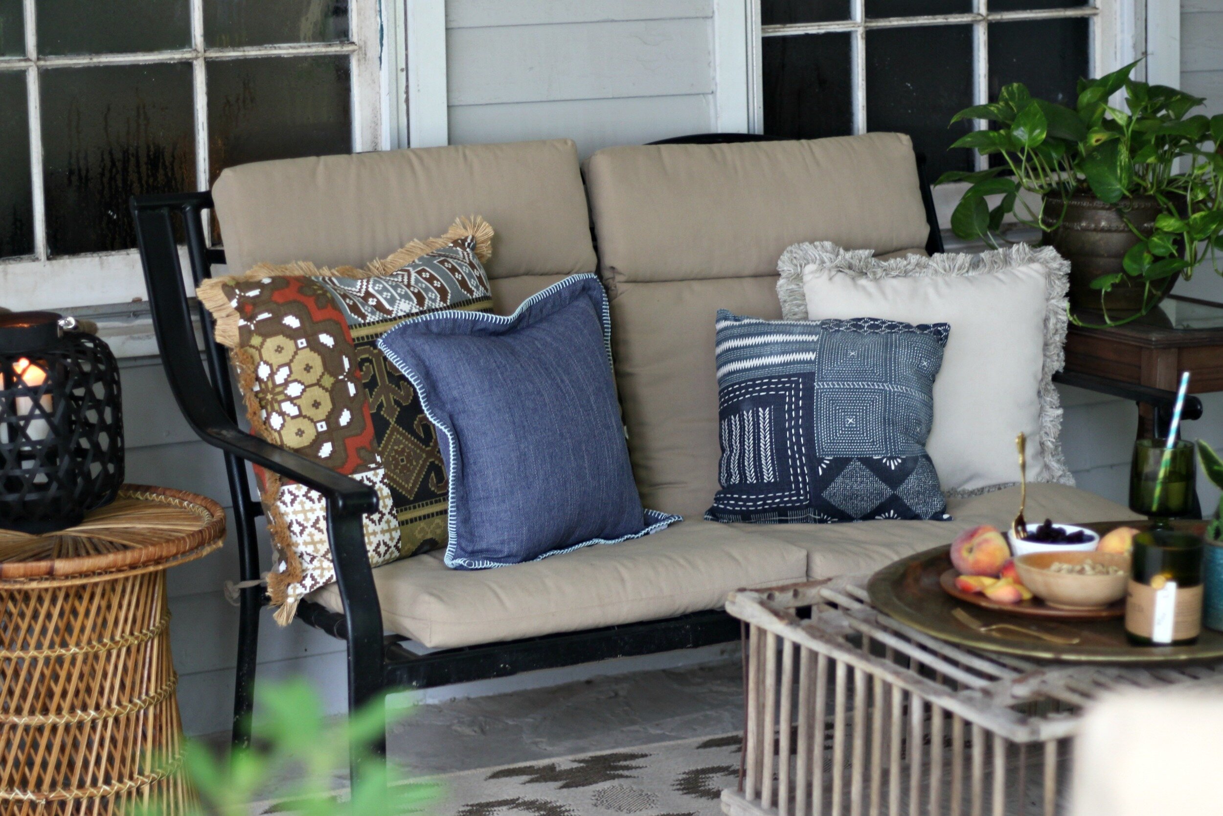 Wicker chair: Craiglist find | Festival blanket: Miss Molly Vintage | Dip-dye pillow: Pier 1 (old) | Wicker table: vintage (thrifted) | Wicker lantern: Home Goods | Denim outdoor pillow: Target | Printed pillow: Home Goods