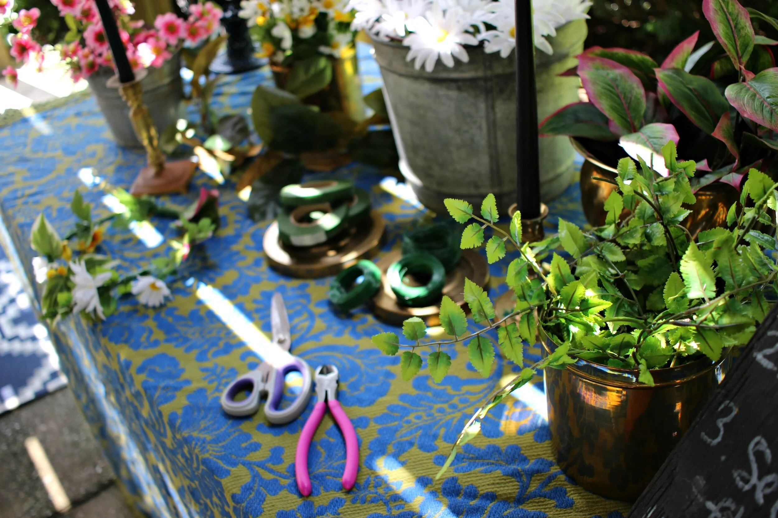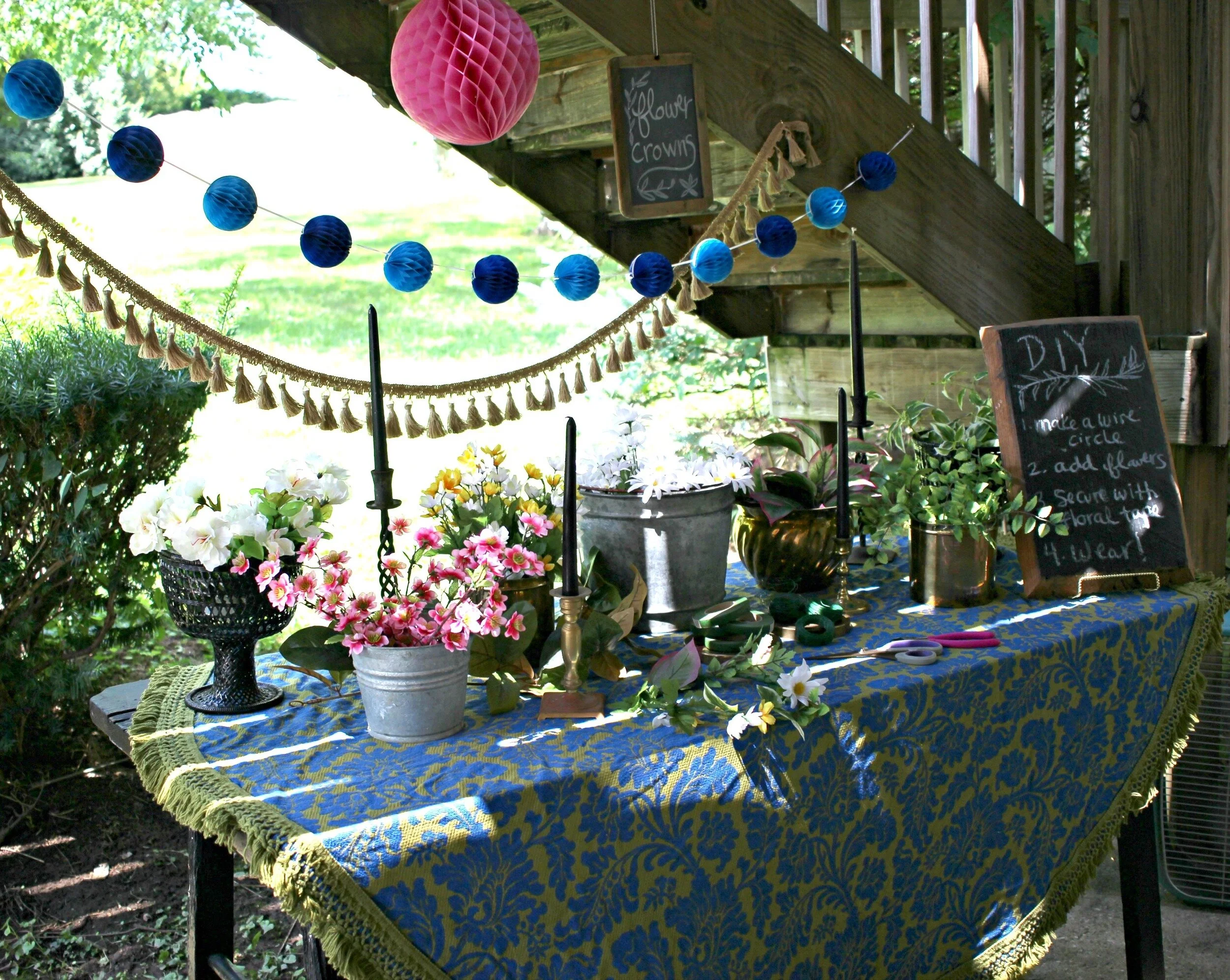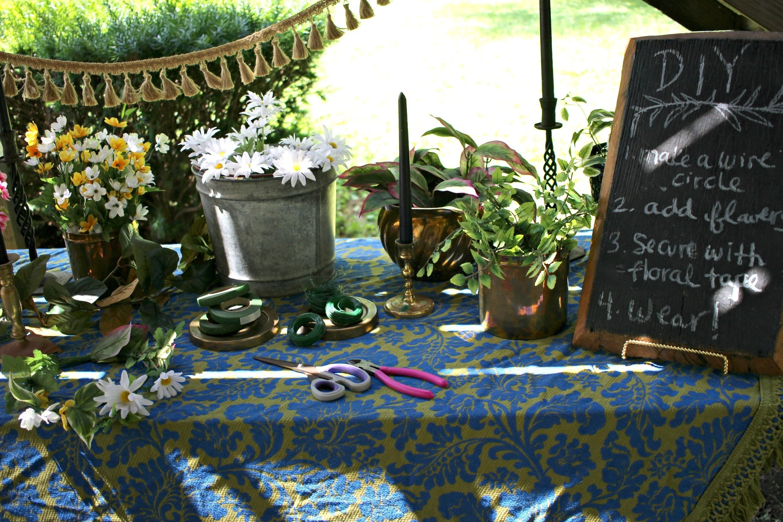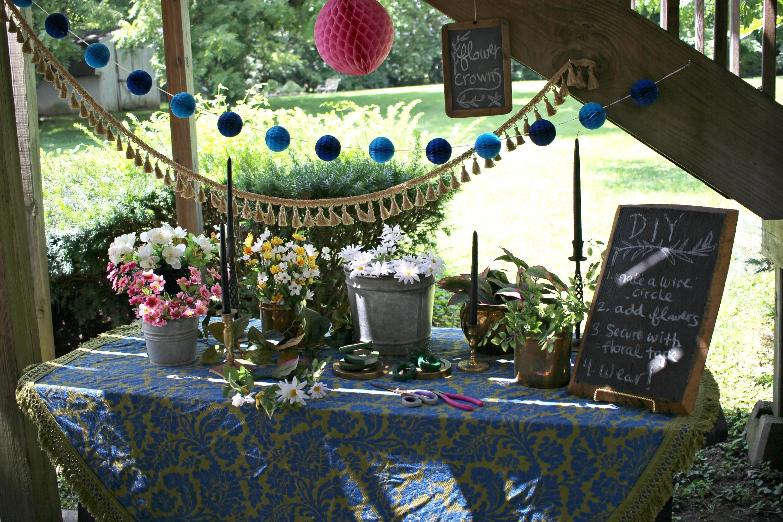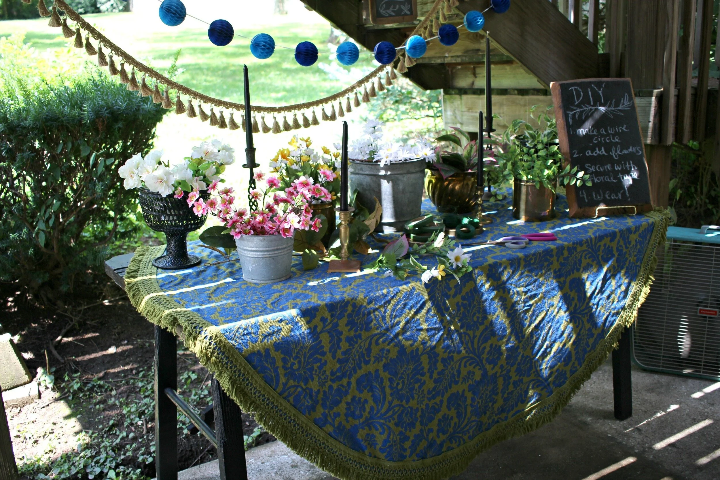 The flower crown bar was easy to set up with just a few items: floral tape, wire cutters, floral wire, and some fake flowers. I just purchased a couple of the larger bunches of fake flowers from Hobby Lobby (they were 50% off that week too!) and then I trimmed them and separated each bunch so that they were all individual stems. I used old buckets or canisters I had to hold each different bunch and made a chalkboard sign with basic instructions. I used yet another vintage tablecloth (my collection is out of control) and I decorated above the table with some honeycomb garland (they have all colors + sizes now at Target) and tassel trim (found in the upholstery section at Hobby Lobby).