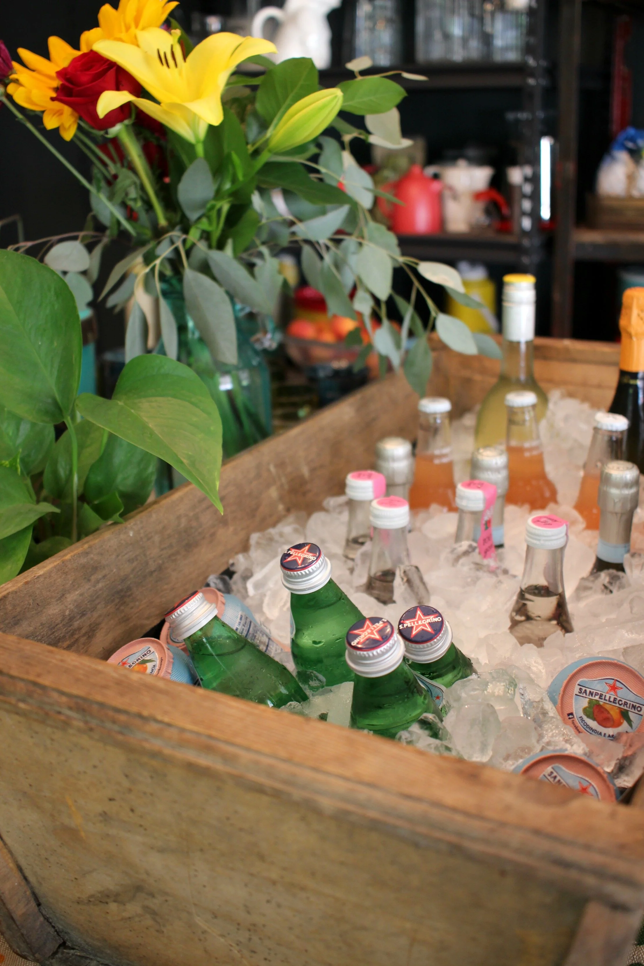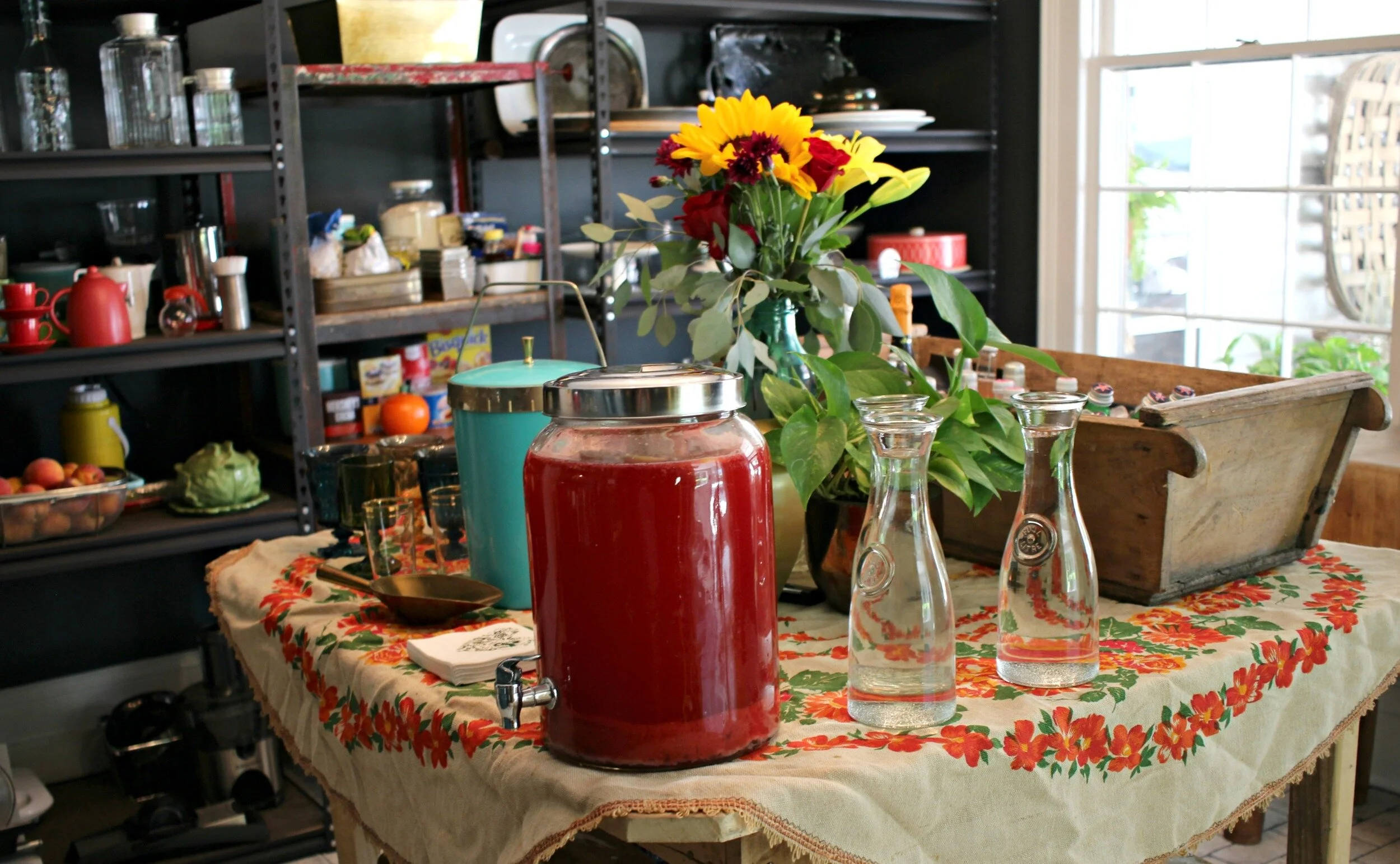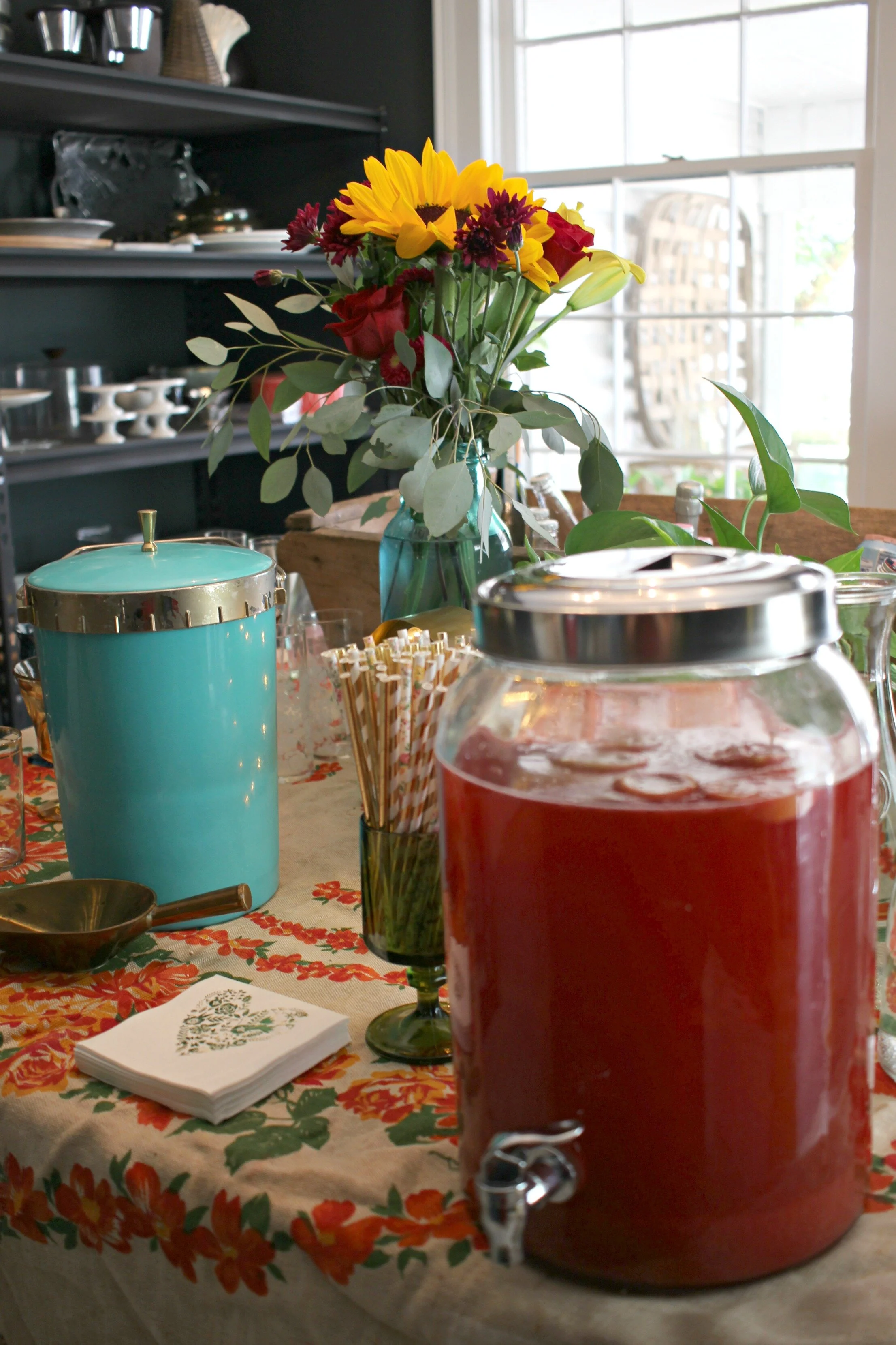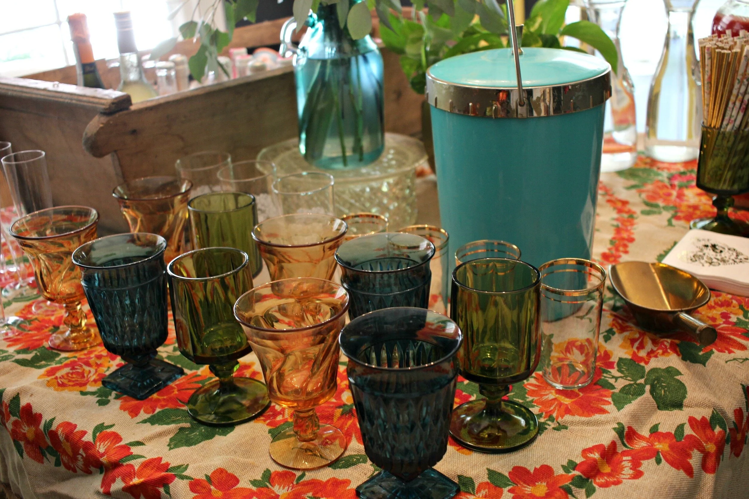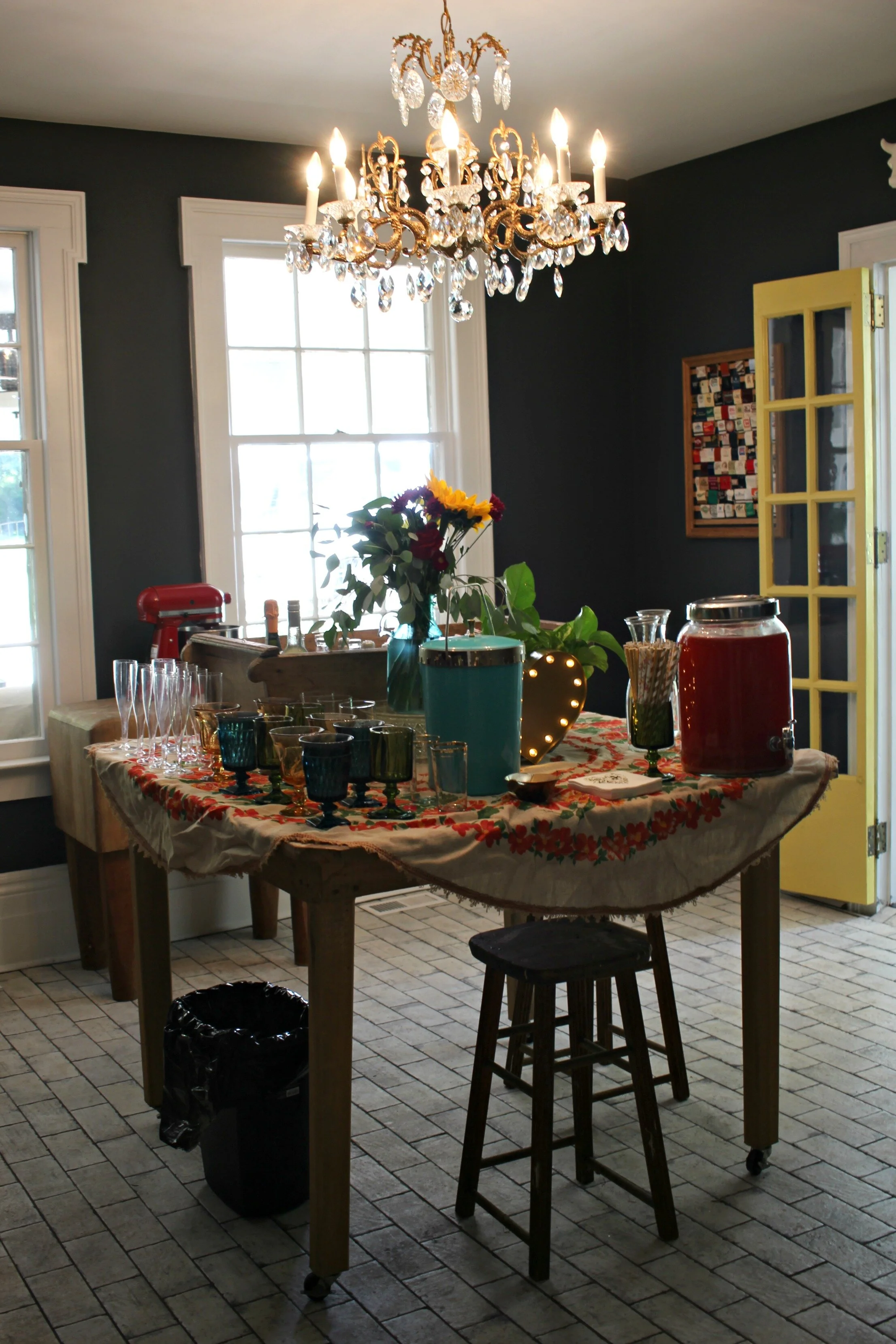 We set up a drink station in the butler's pantry which worked well and kept the kitchen from being too overcrowded. I set up jewel-toned mismatched vintage glasses, an ice bucket, a trough of iced bottled drinks, carafes of water, and a dispenser with punch. I also set out cocktail napkins and some cute patterned paper straws! I used another vintage tablecloth on the table underneath that had a bright floral pattern and played off of all the bright glasses and colors.