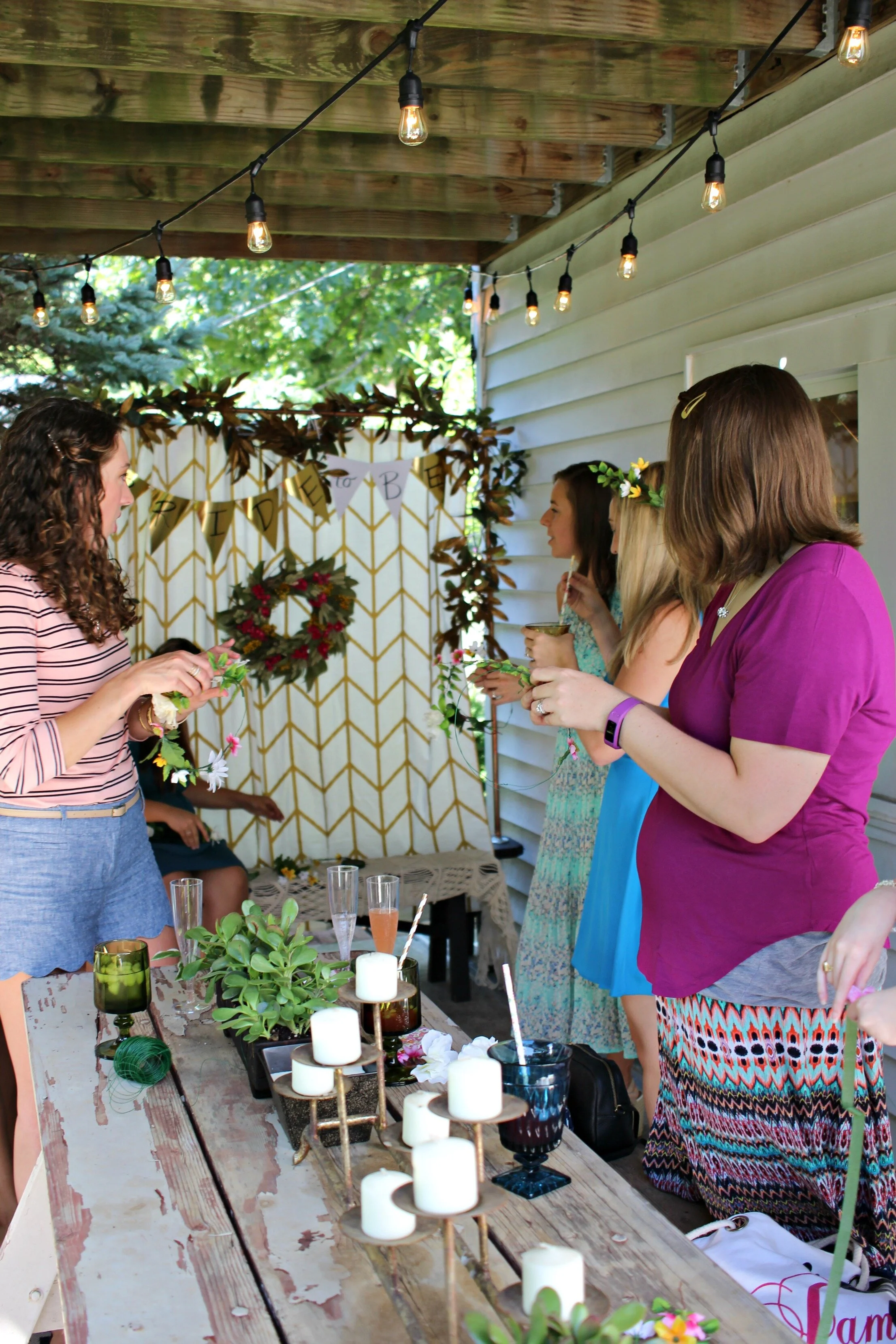I'm not much for shower games so instead I set up some fun activities outside: a photo booth and a flower crown bar! The photobooth was pretty easy because I use this same backdrop set up for all my markets (it's made from copper pipes and attached to a bench)! I just switched out my normal "Miss Molly Vintage" logo backdrop for a gold patterned shower curtain (originally from Target but found on super sale at Bargain Hunt!), and then added some greenery at the top with a banner (found blank at Hobby Lobby and I wrote on it). I also found this cute bright wreath at Bargain Hunt (also originally from Target) and just hung it in the middle.