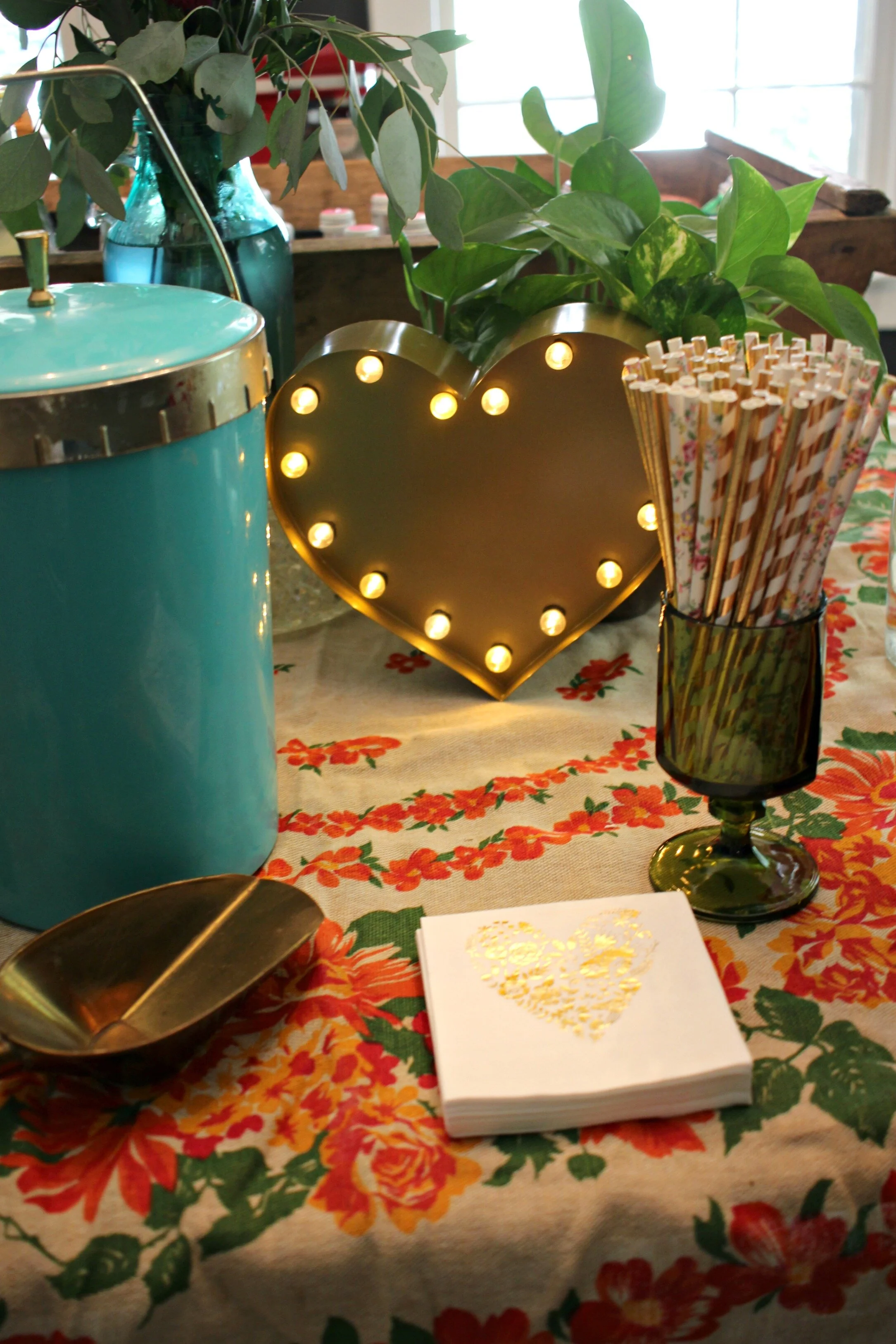 I set up an extra small table in the kitchen so that all the desserts could be showcased separately. I used a vintage tablecloth for color and a mixture of cake plates, pedestal dishes, and trays to fill the table and make it feel like it was overflowing with sweet treats! Behind the table I did a little chalkboard art and made a hanging "heart wreath" by attaching some faux greenery to a metal heart I found at Hobby Lobby. I also found the prism shaped gold candle holders at Hobby Lobby and filled the table with more vintage candlesticks that I already had in my collection. I used mismatched colored dessert plates and gold silverware (vintage) for an extra pop of pattern and color.