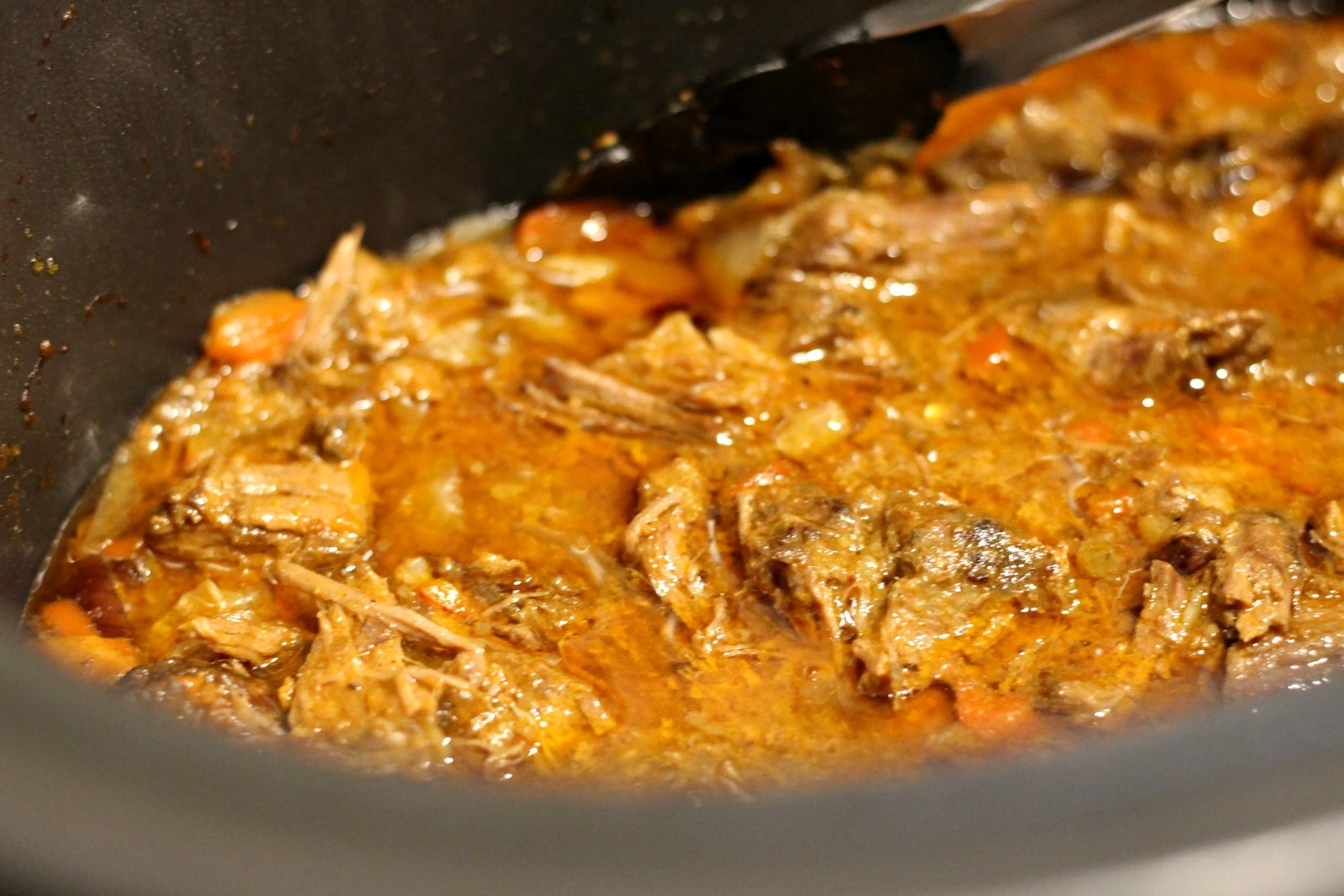 5. When the beef is finished cooking you can shred it with a fork while still in the crockpot (carefully- it's hot!).