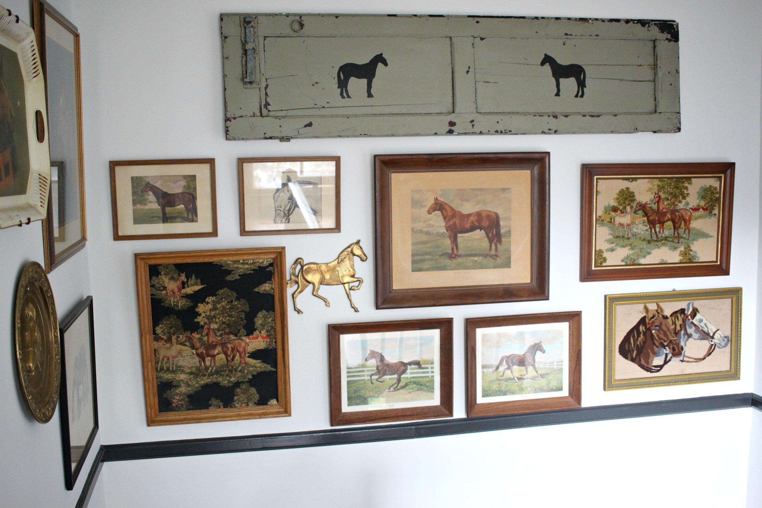 All of my horse pictures came from garage sales or peddler malls. I've been collecting them for several years and most of them cost $10 or less! I like how they all have slightly different styles, textures, and frames. I think the most interesting gallery walls look truly collected and less planned.
