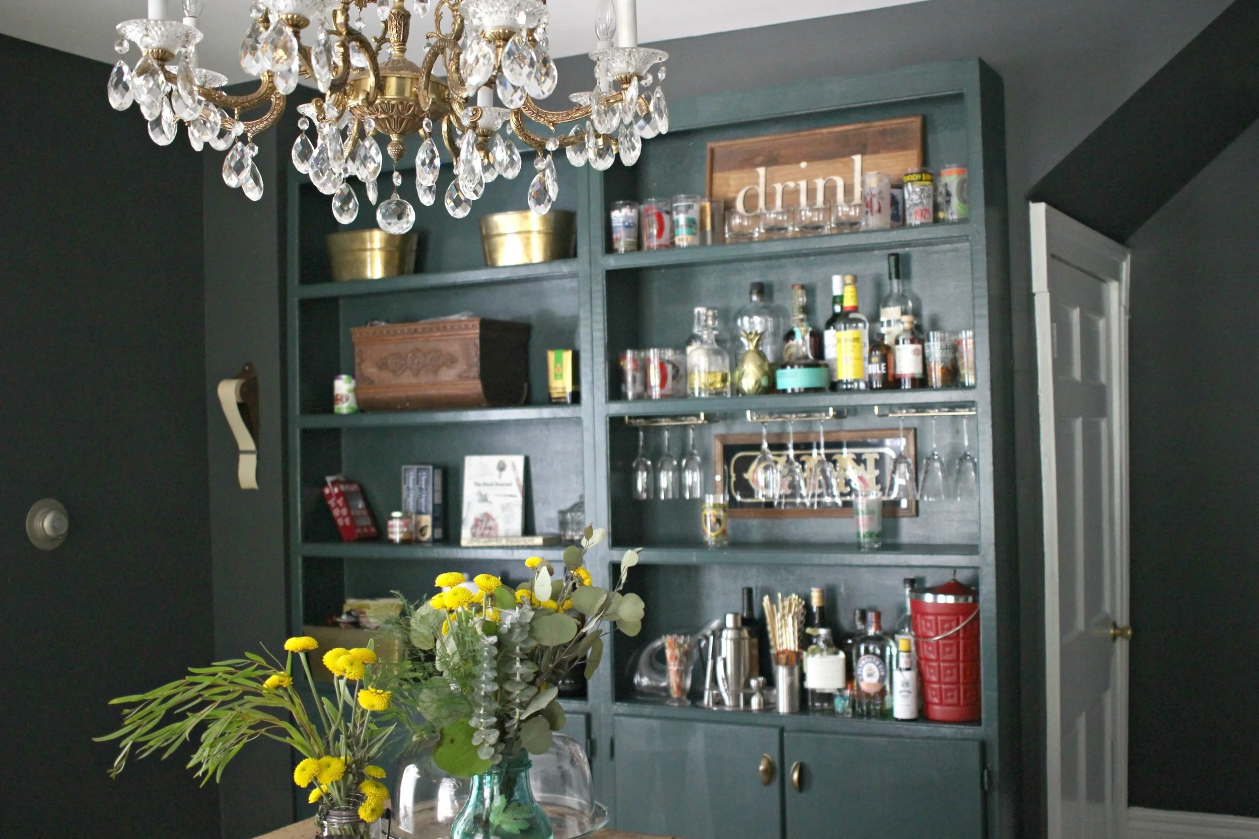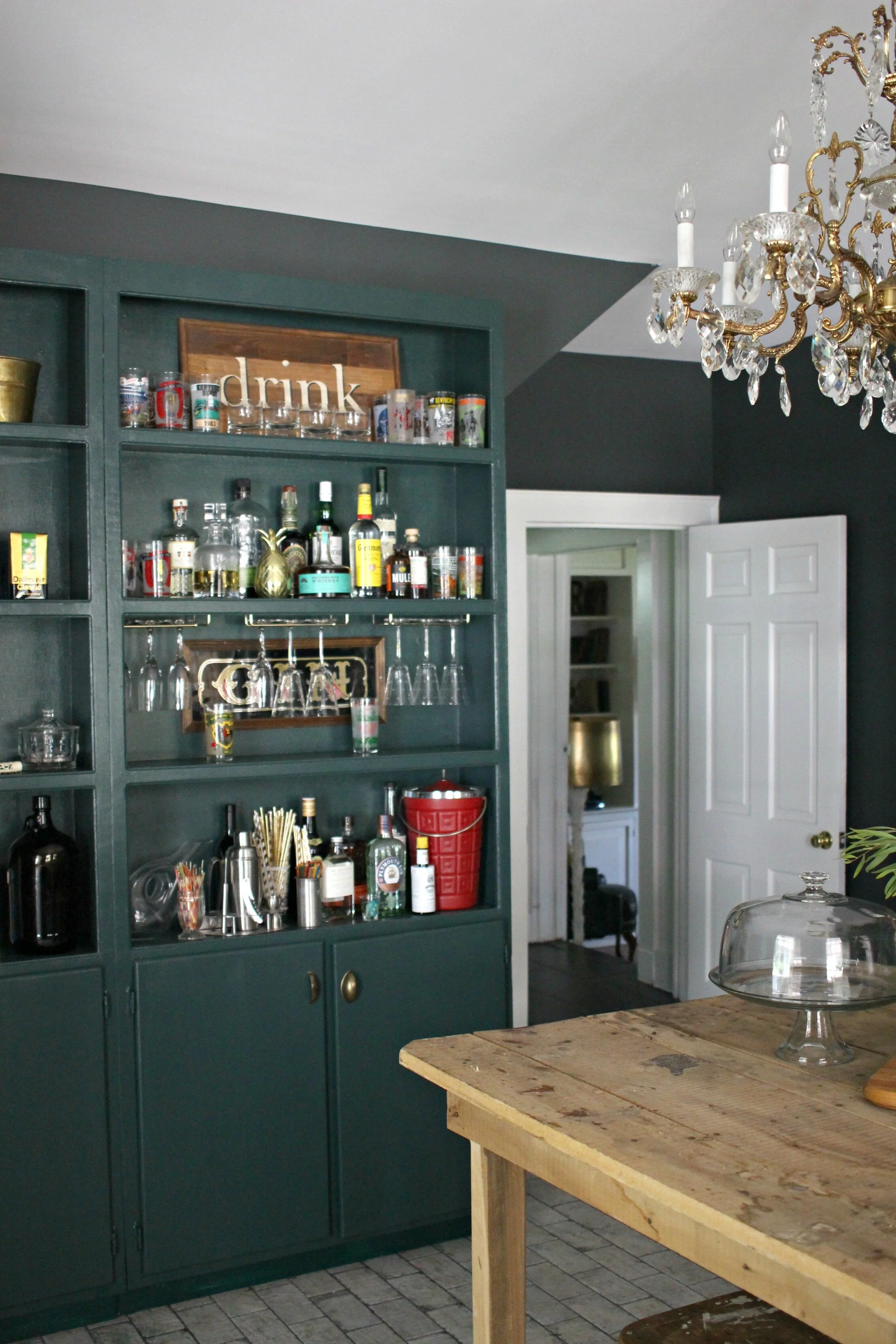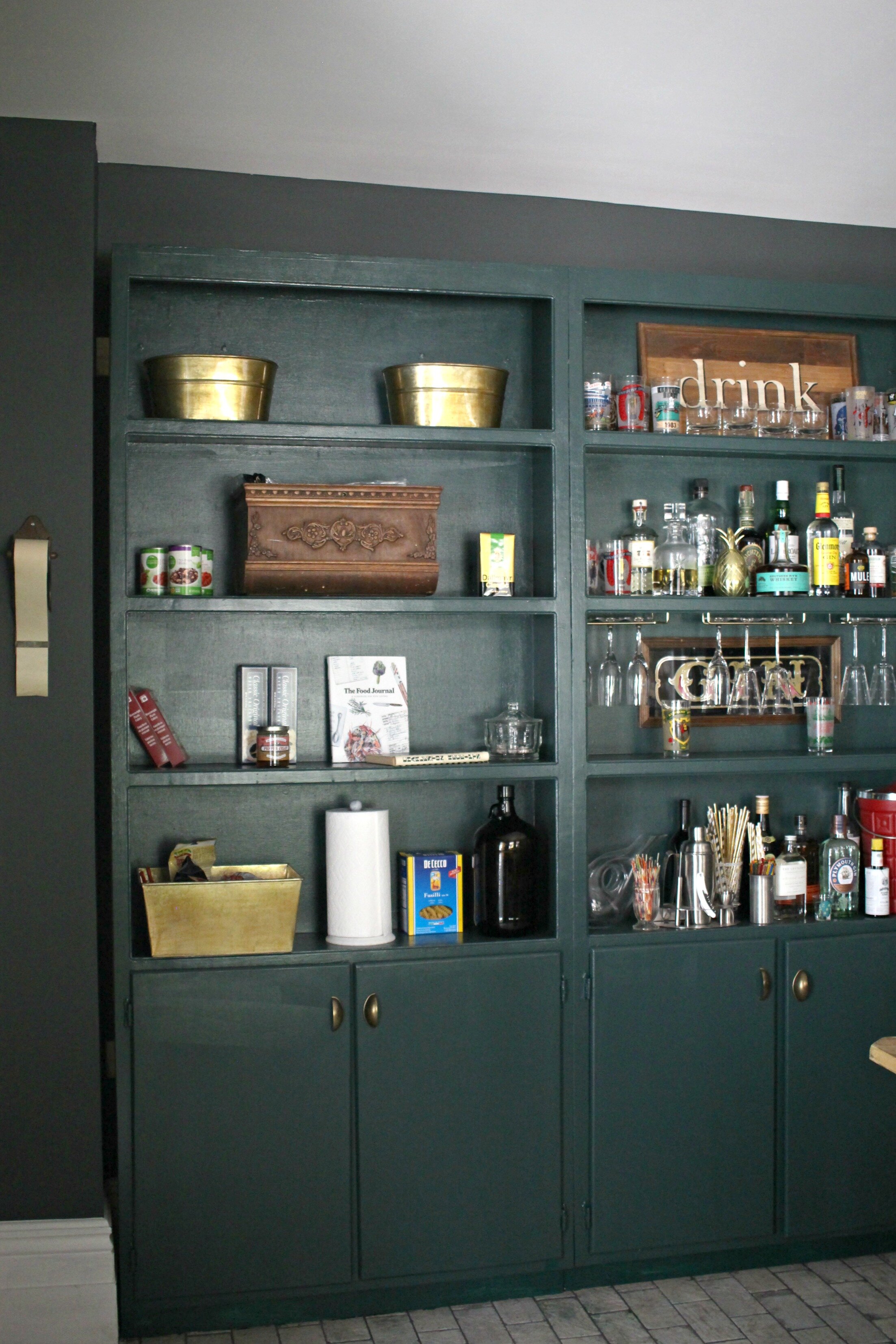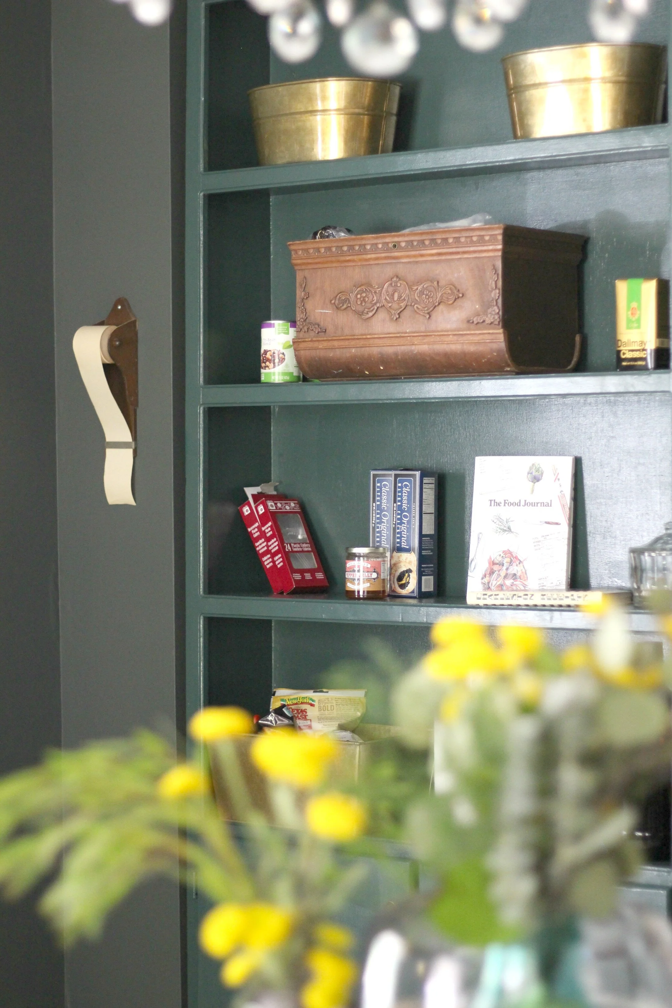 Another lucky find we picked up along the way for this space were these cabinets. I spotted these at the Restore and was immediately drawn to them because they had such unique dimensions- very tall but shallow, and they wouldn't stick out very far from the wall (another steal at $45 each). I originally thought we would put them on either side of the double glass doors that go into the mudroom, but they were just a little too big. Luckily they just happened to fit so perfectly on this other wall, so much so that they look like they are actually built-in! We attached them to the wall and then I freshened them up with a coat of paint- Black Evergreen by Behr. I love this sophisticated but unexpected dark emerald color and was inspired by this gorgeous kitchen to incorporate it into this room. These are perfect cabinets for this space because they have also have plenty of closed storage at the bottom for food or items that I don't want to display on open shelves. I also was able to get brass cabinet pulls that match my kitchen cabinet hardware to tie everything together.