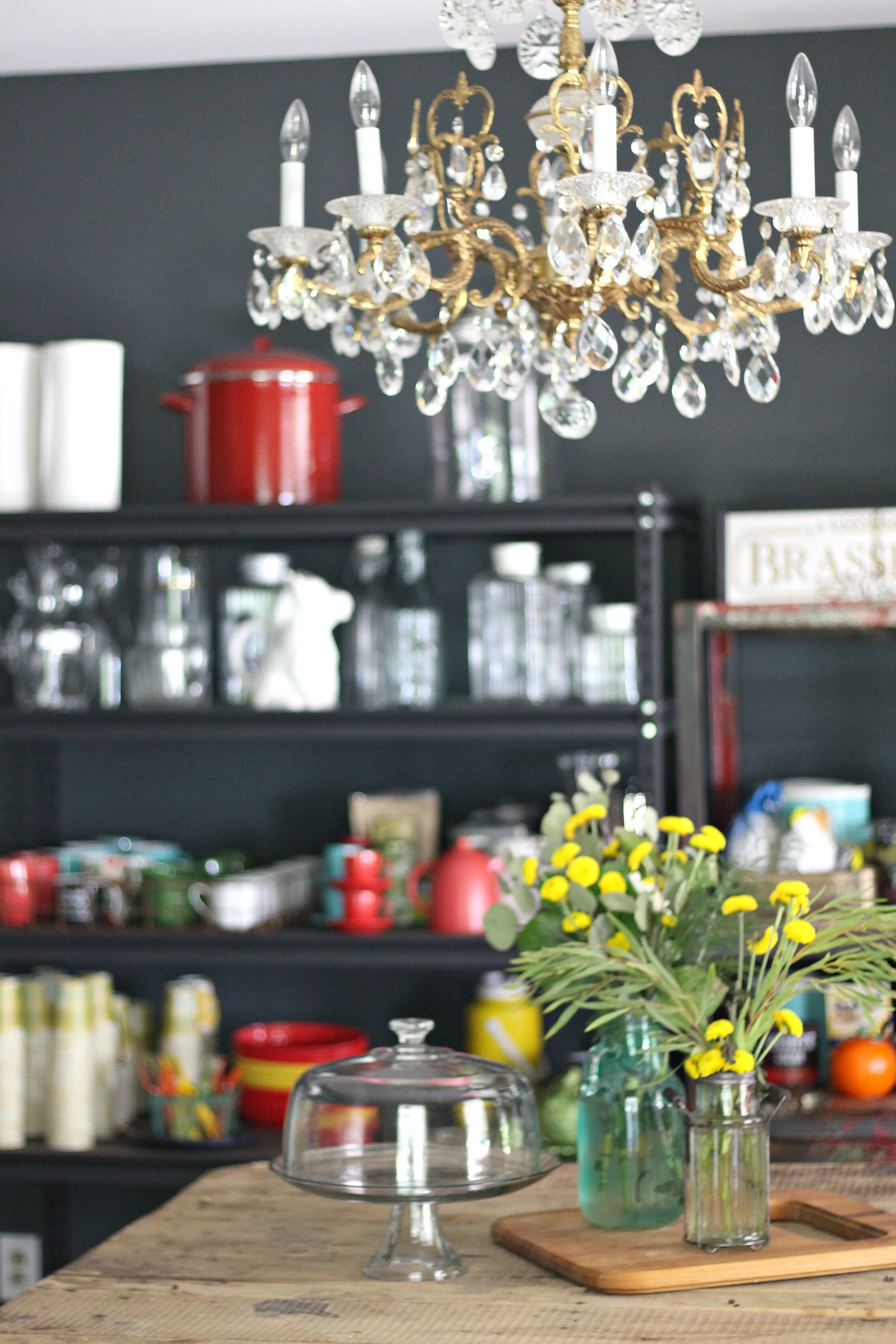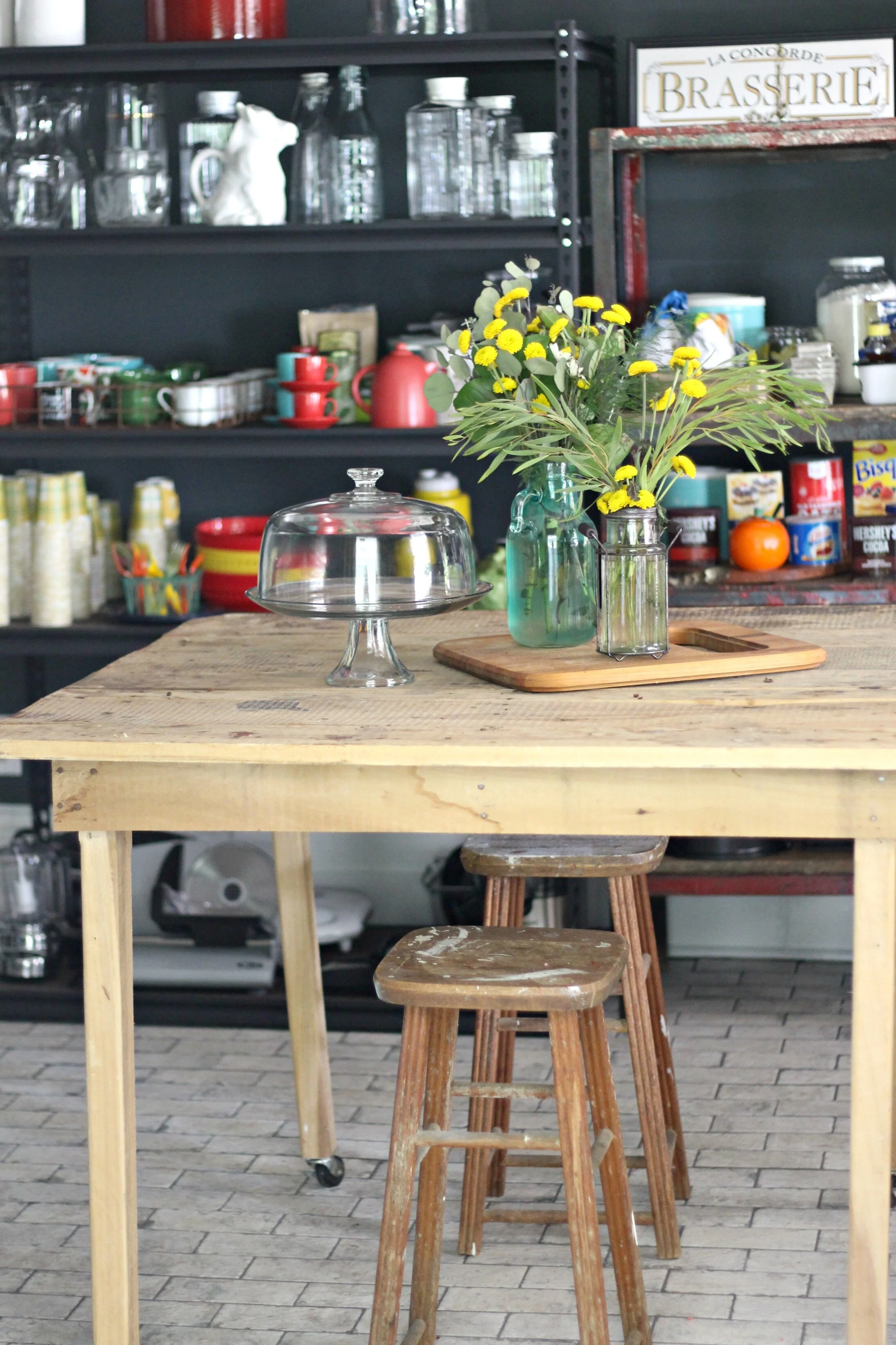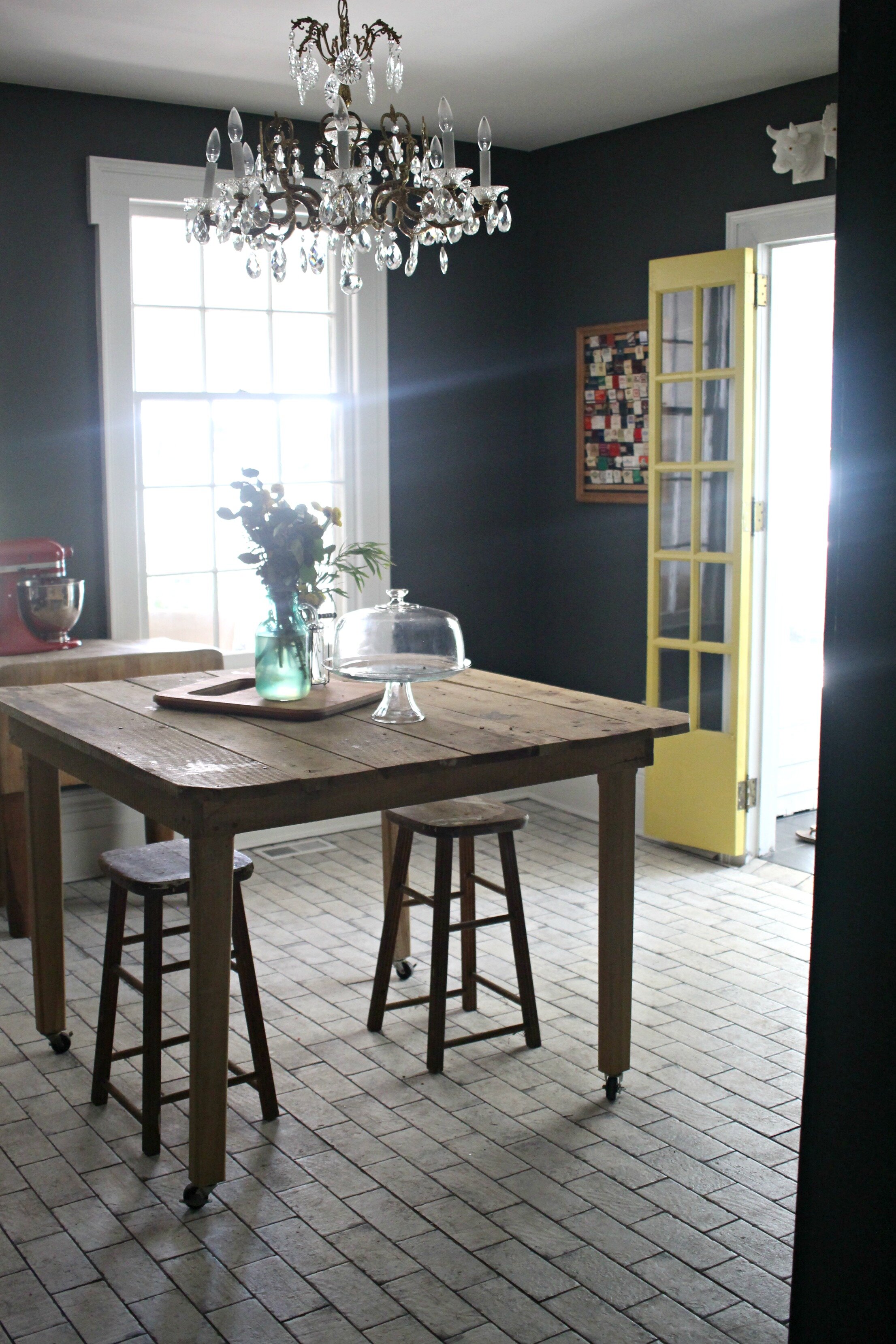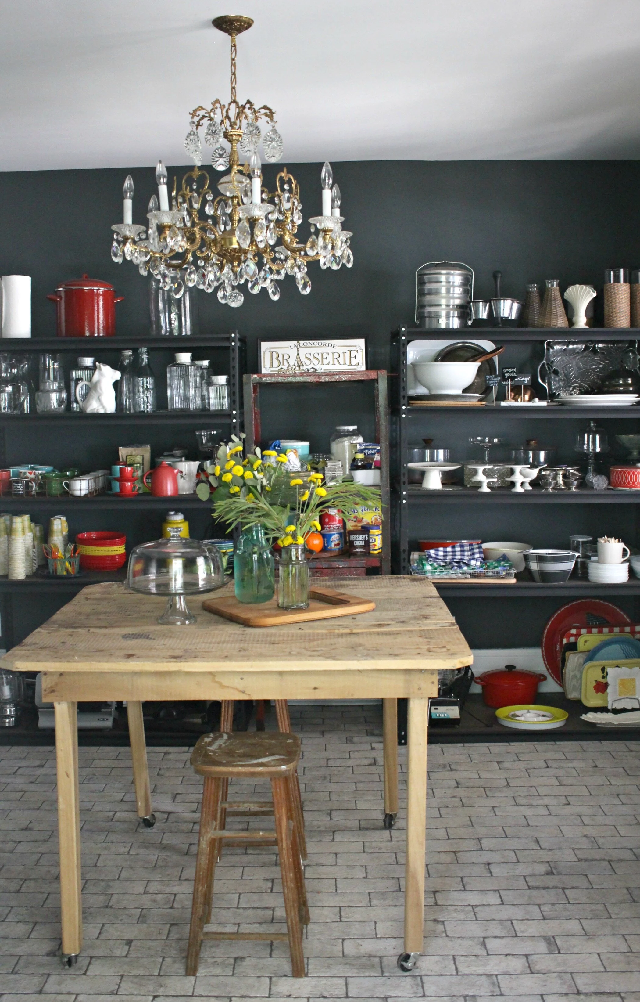 A lot of paint, some flooring, and a vintage chandelier completely transformed this room into the pantry of my dreams! We have lucked out in finding a few of the furniture pieces for this room that happened to fit perfectly. The old table in the center is counter-height, so it's a perfect prep space or serving table AND it's on rollers making it easy to move around! This was another find from the Habitat for Humanity ReStore and I got it for $45! The best part is that it was already perfectly distressed and I didn't need to paint it or touch it up at all!