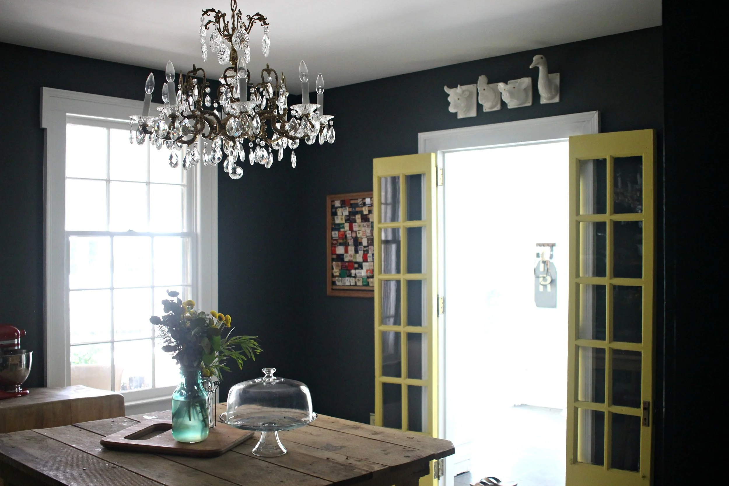 I really love the old original glass doors that were on the doorway leading into the mudroom from this room. I wanted to paint them a bright color ("Crisp Ginger Ale" by Glidden) to really pop against the dark walls and tie in with the French industrial look we were shooting for in this pantry. I even found the perfect spot to place my vintage animal head collection right above them!