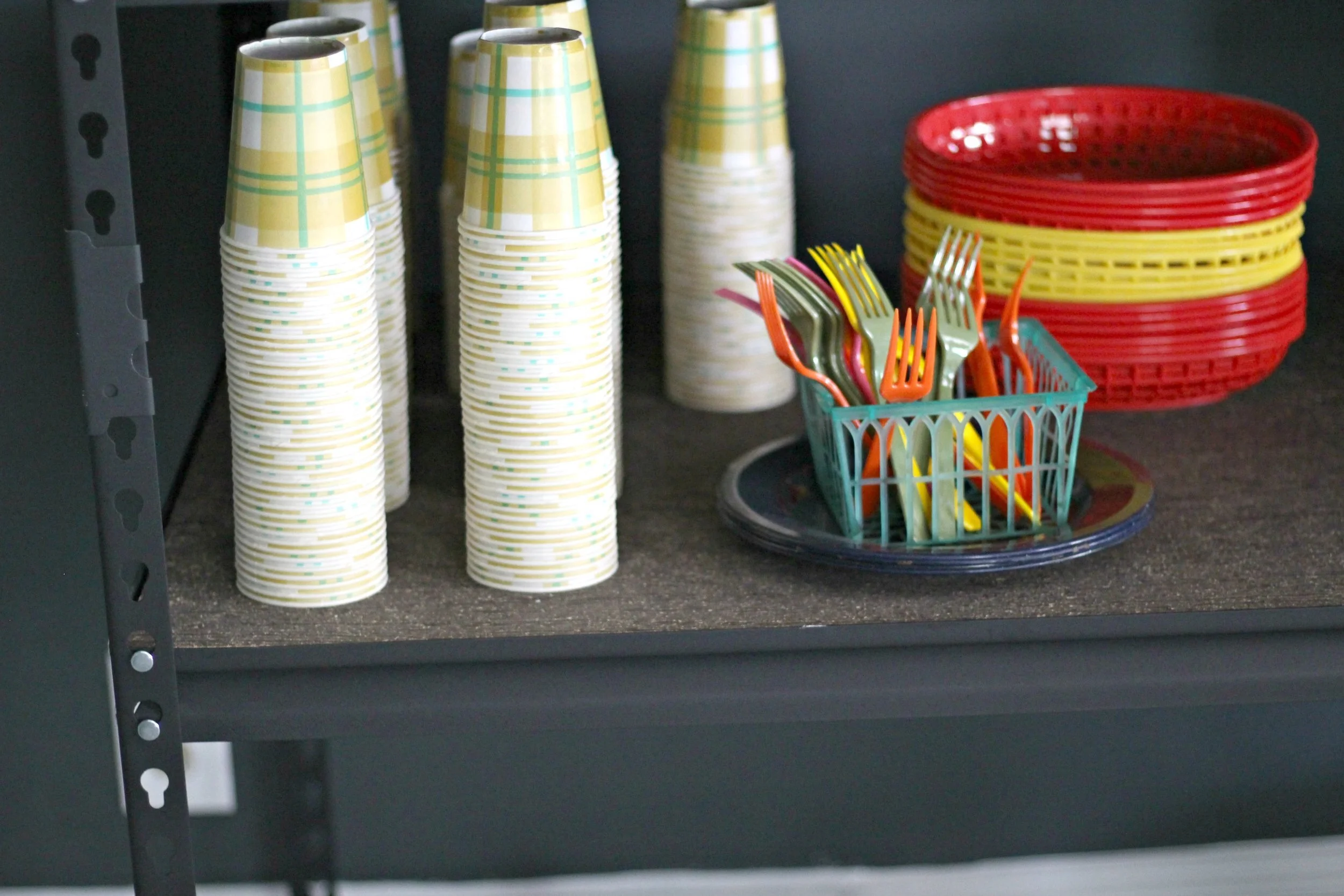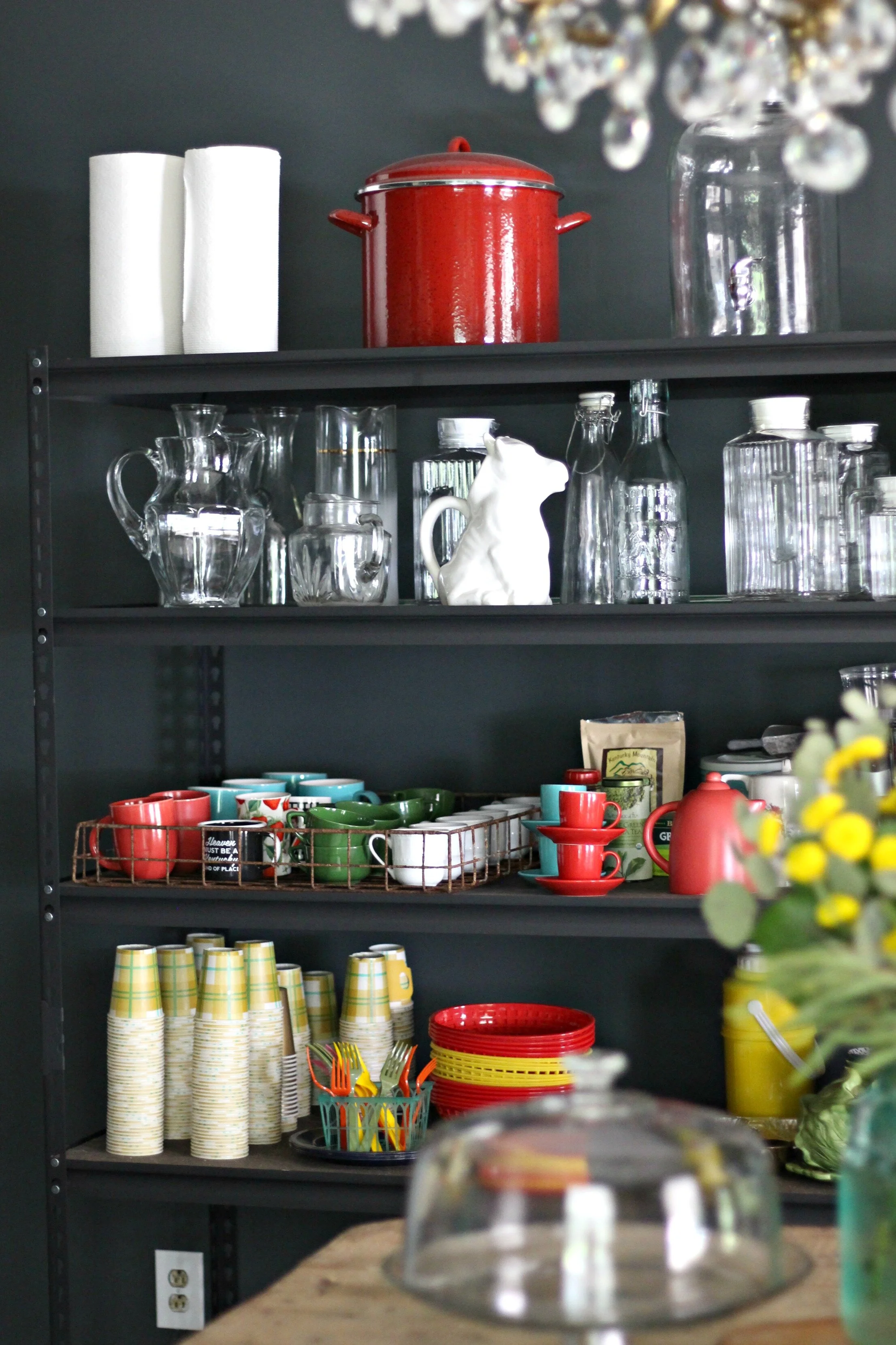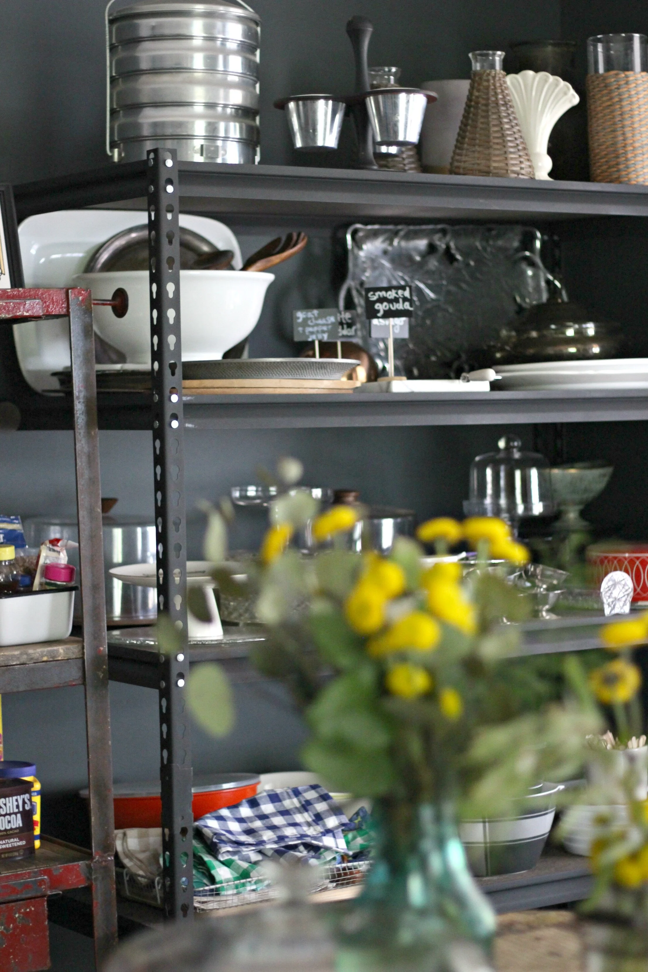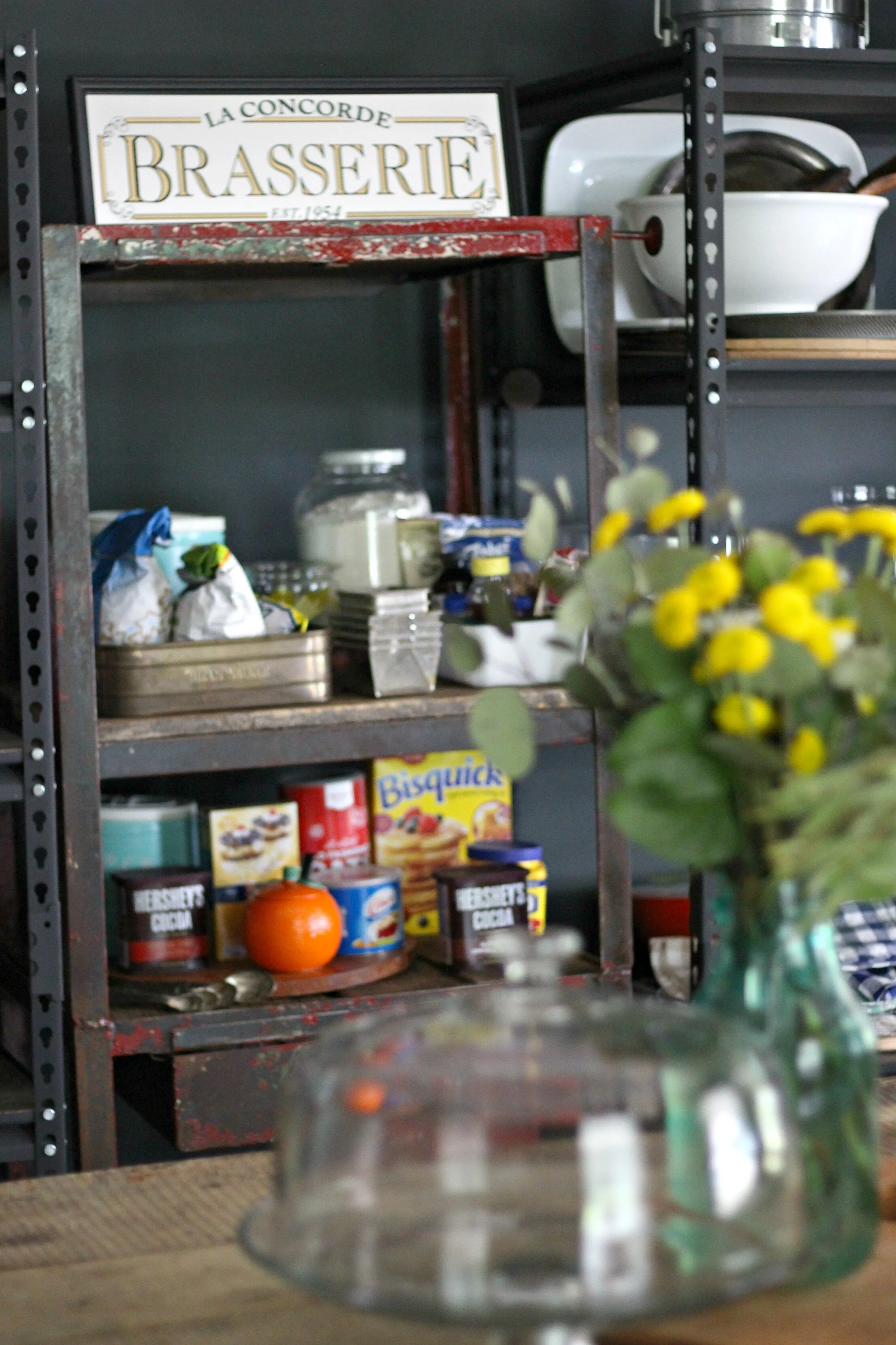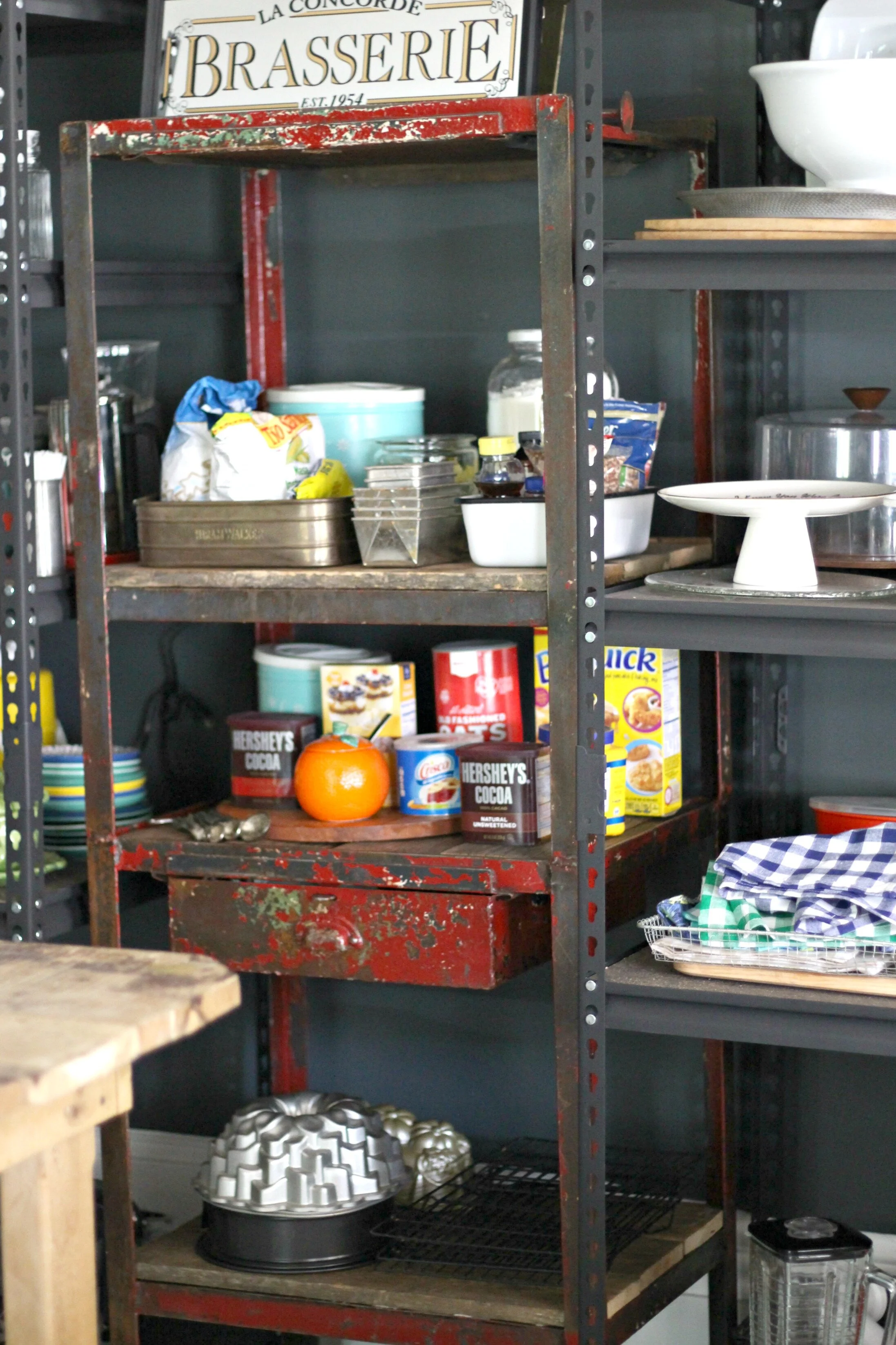 The back wall of our pantry holds two large metal shelves (from Home Depot) that flank a smaller vintage industrial shelf. These shelves house all my dishes, serving ware, baking supplies, and any small appliances that I don't need in the kitchen. We're not in love with the metal garage shelves and would like to replace them with something old with a little more character. For now they are an inexpensive option that we can use to hold everything (and later use in our garage when we find something we like better for in here).