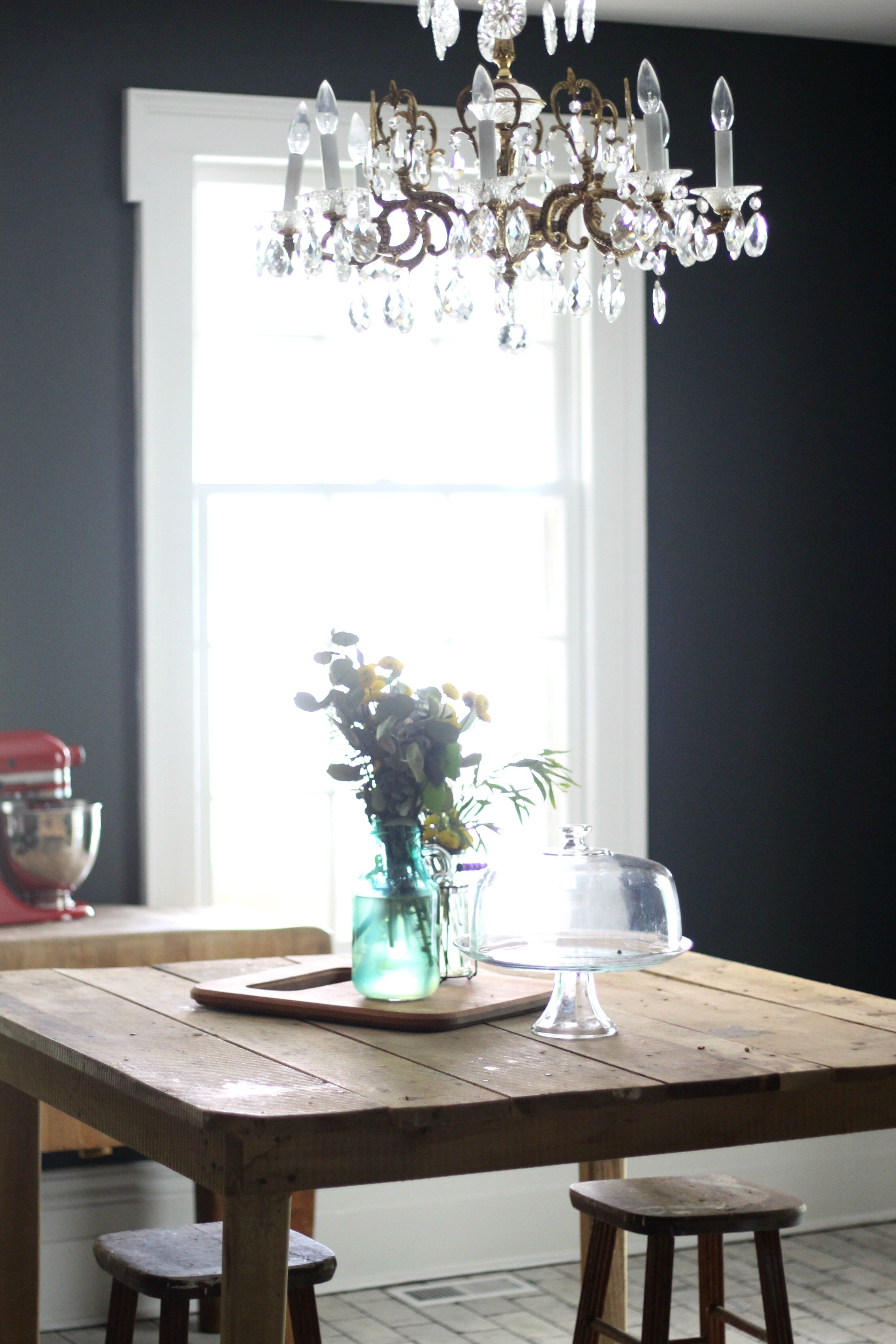 One of the focal points of the room is this beautiful antique chandelier that belonged to Alex's grandparents. We are so thrilled that Alex's family saved this and allowed us to use it in our home. I love the eclectic mix that it adds to the room, a more formal touch in an otherwise industrial, rustic space. The gold also pops perfectly against the dark walls and shelving.