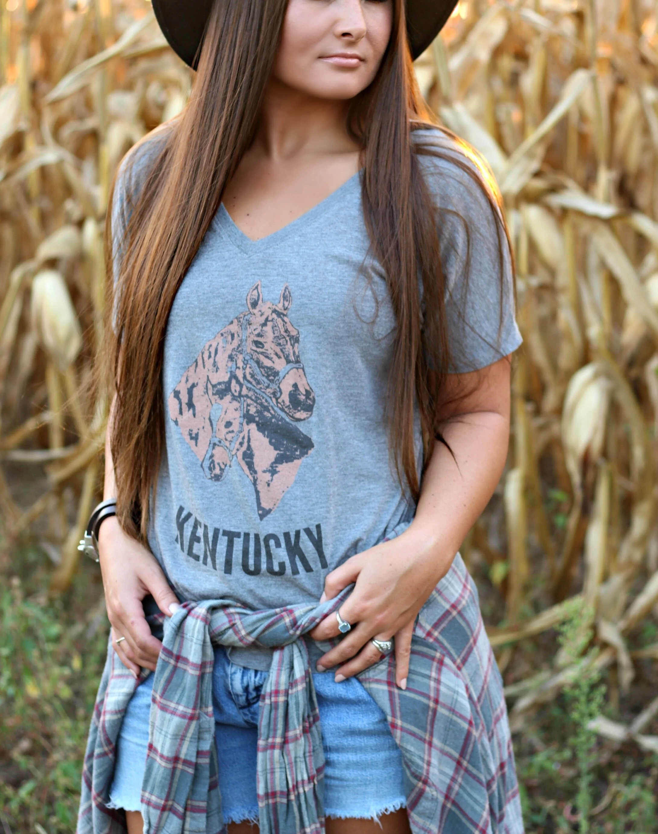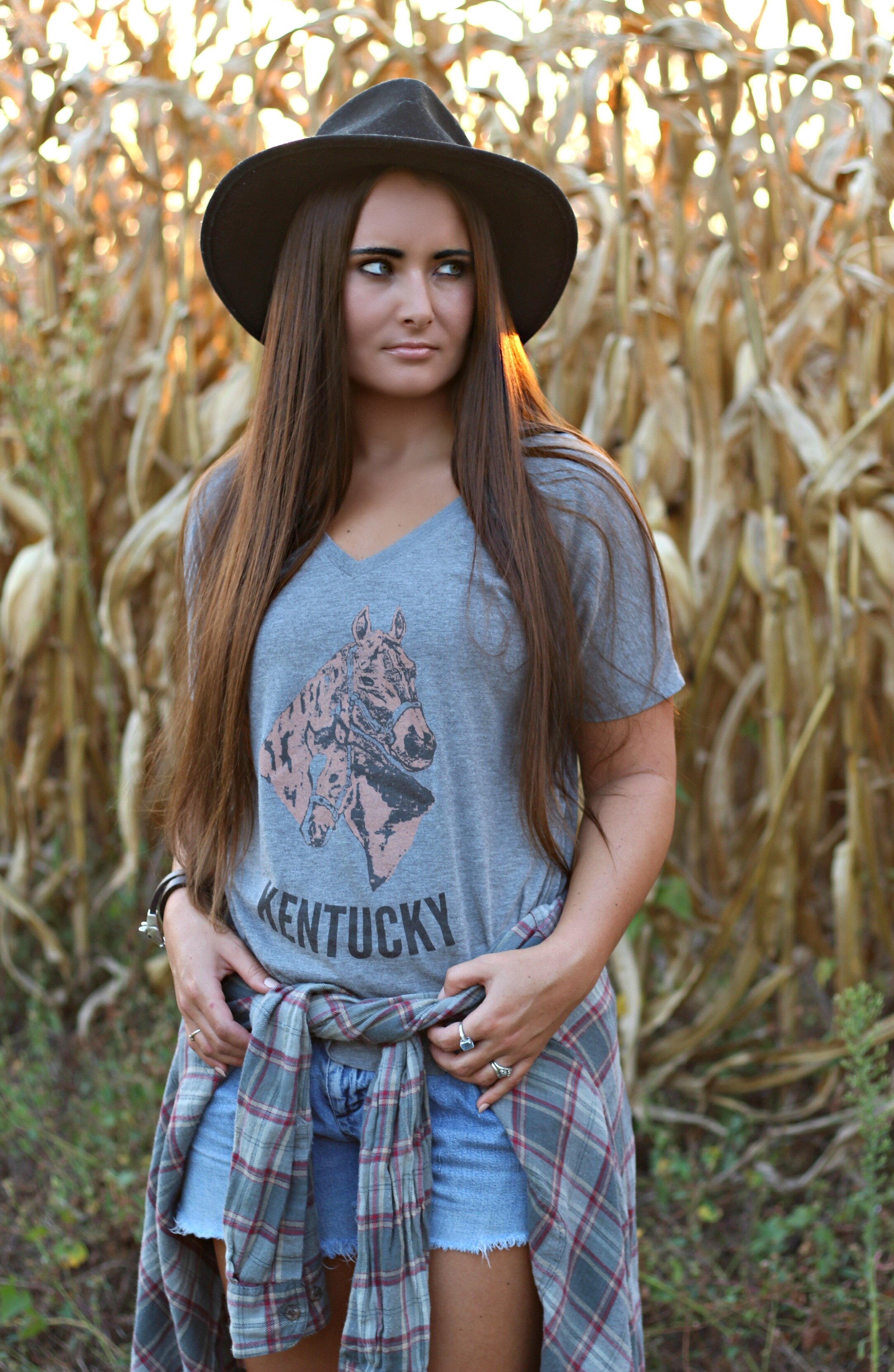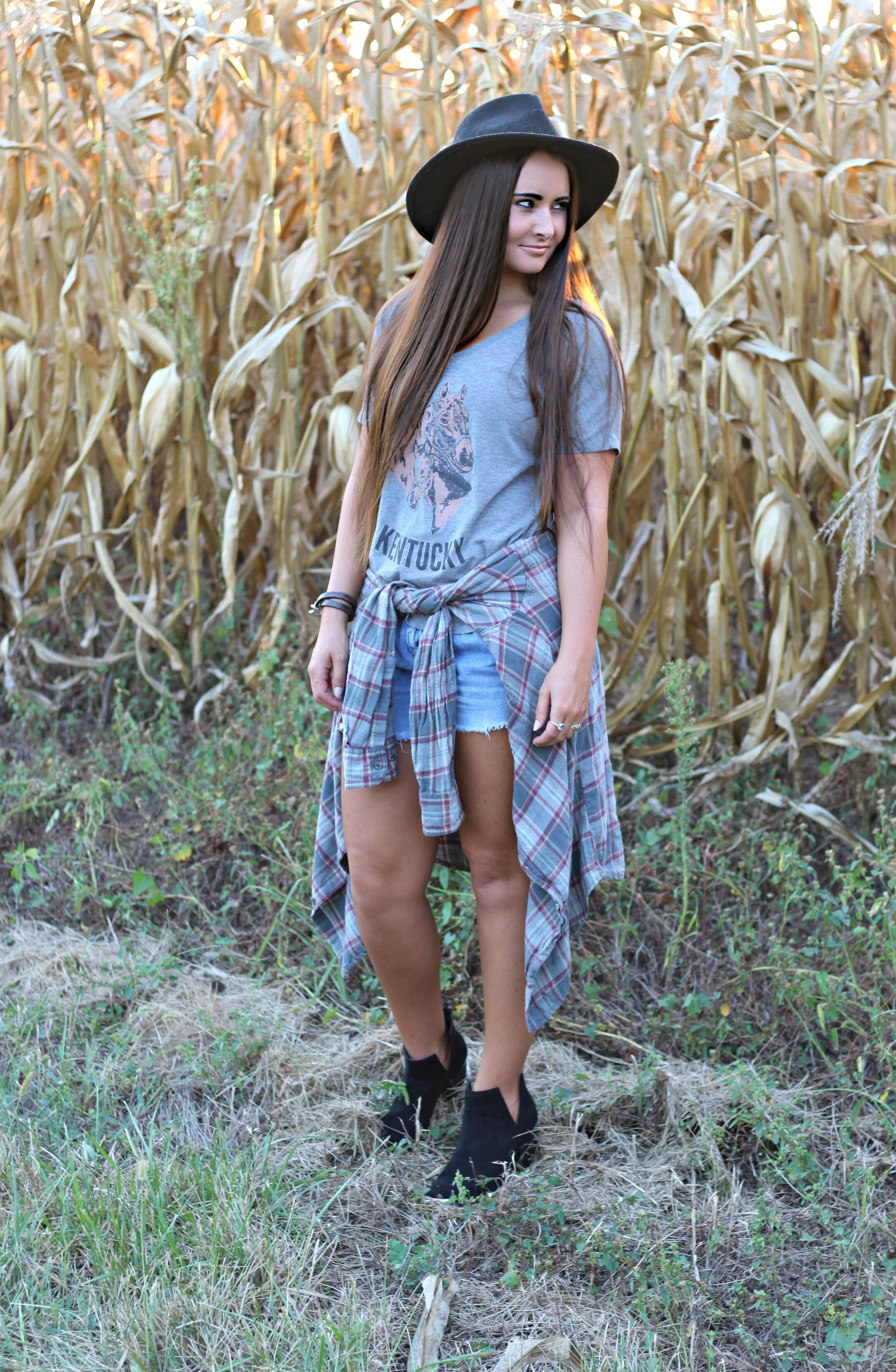 I am very impatiently waiting for chilly autumn weather and just dying to start layering up with fall staples. One of my favorite ways to wear vintage flannels is just simply tied around the waist, and it also just happens to be a perfect way to wear them when it's still a little too warm out to wear them normally. Wearing shorts with booties and a flannel is my favorite way to easily transition outfits from summer to fall, especially when the weather is still in summer mode like today. I'm thrilled that we have our original design "Kentucky Souvenir Tees" back in stock (thanks to My Kentucky Tee for printing these up for us!). These are some of my all-time favorite tees and I seem to be wearing this super comfy slouchy-v-neck + my baseball tee every single week! You won't believe how soft these are and the vintage horse motif is so perfect for fall (a must-have for tailgates + Keeneland season!). I've linked them below so you can shop them as well as the rest of my outfit details!