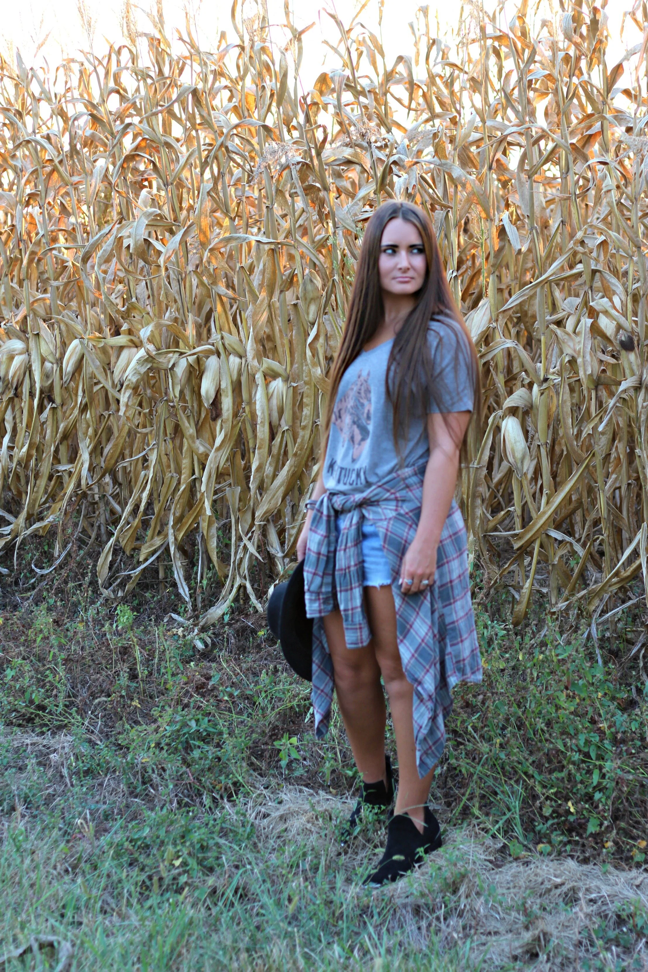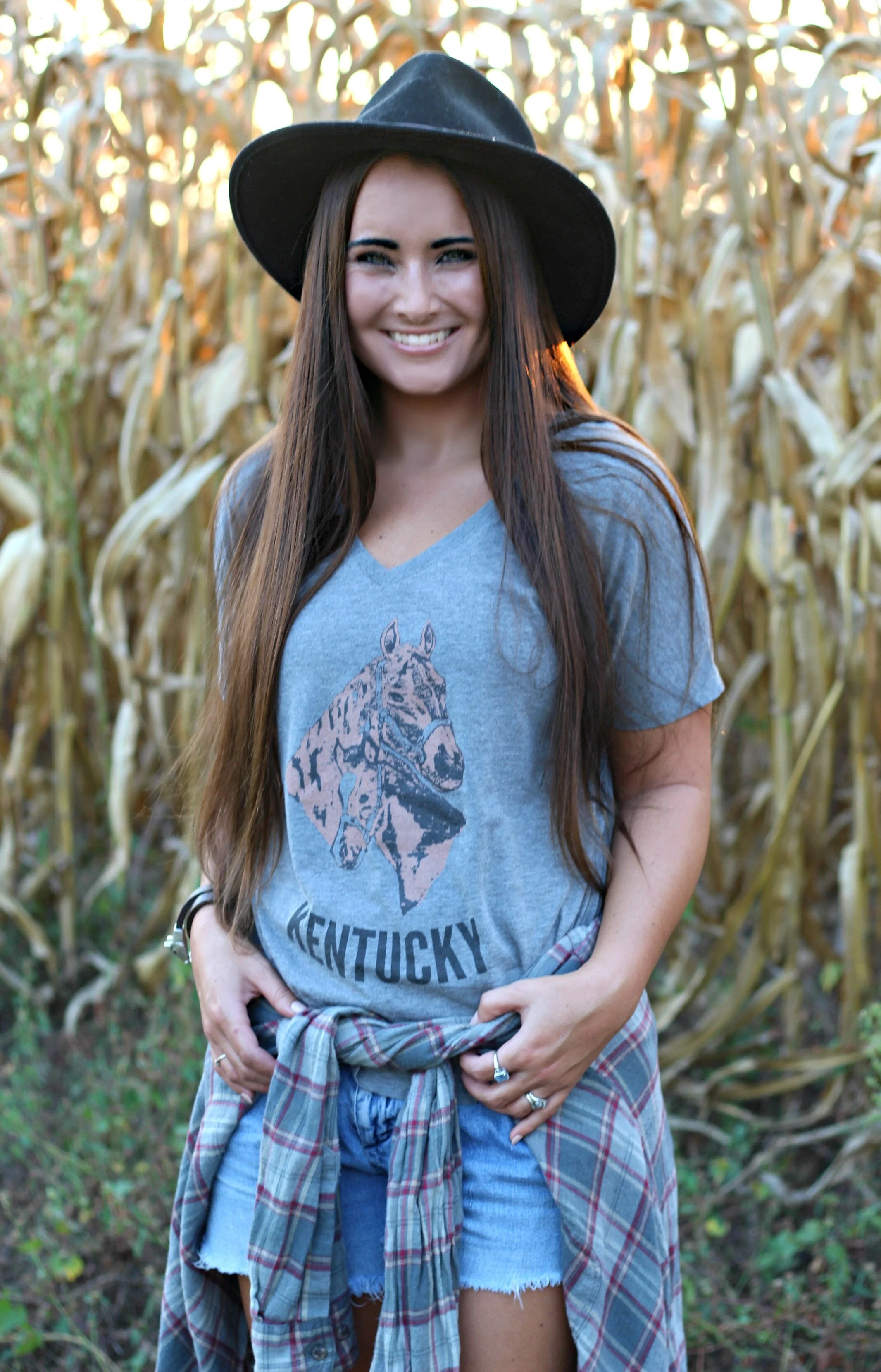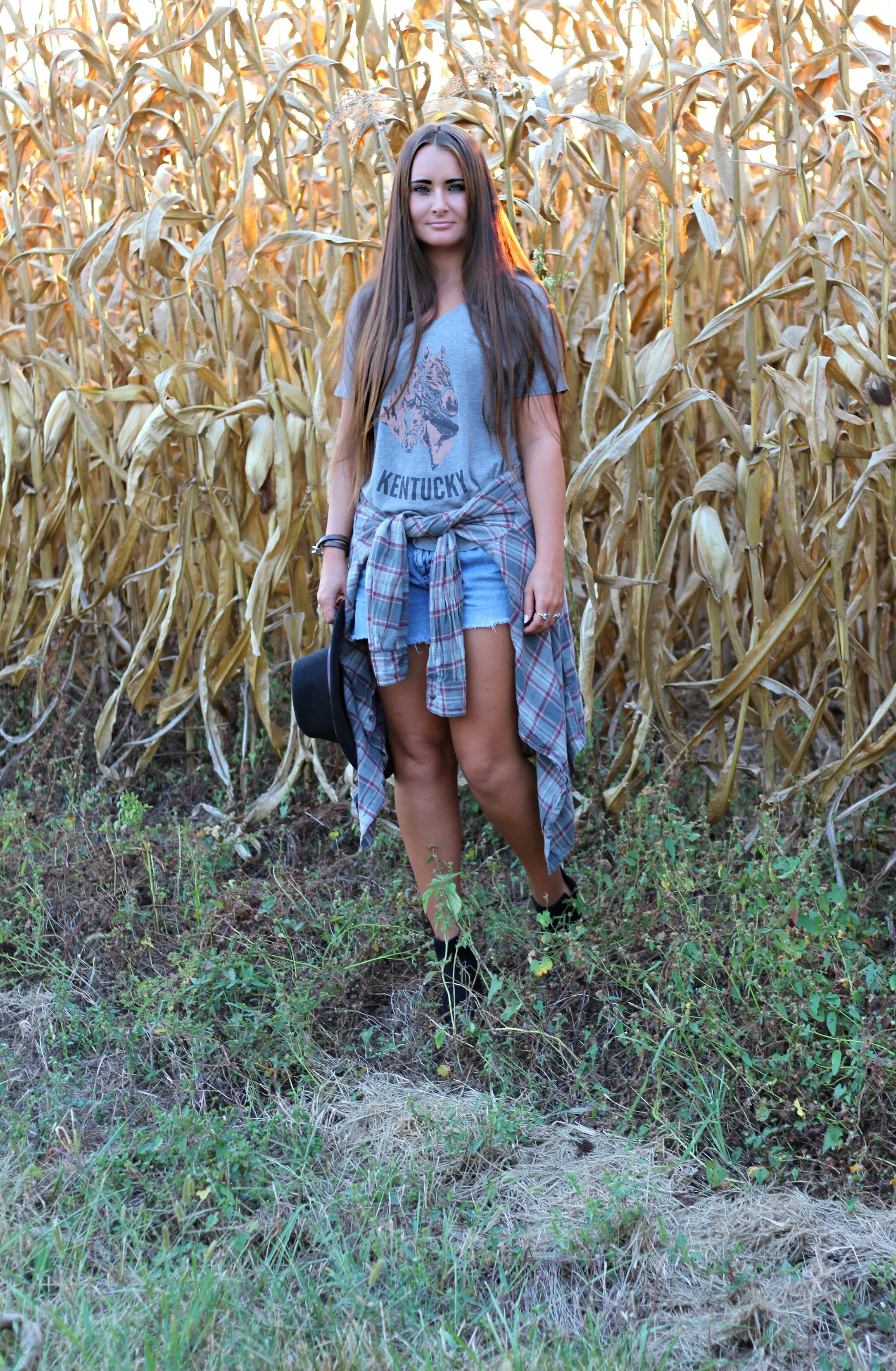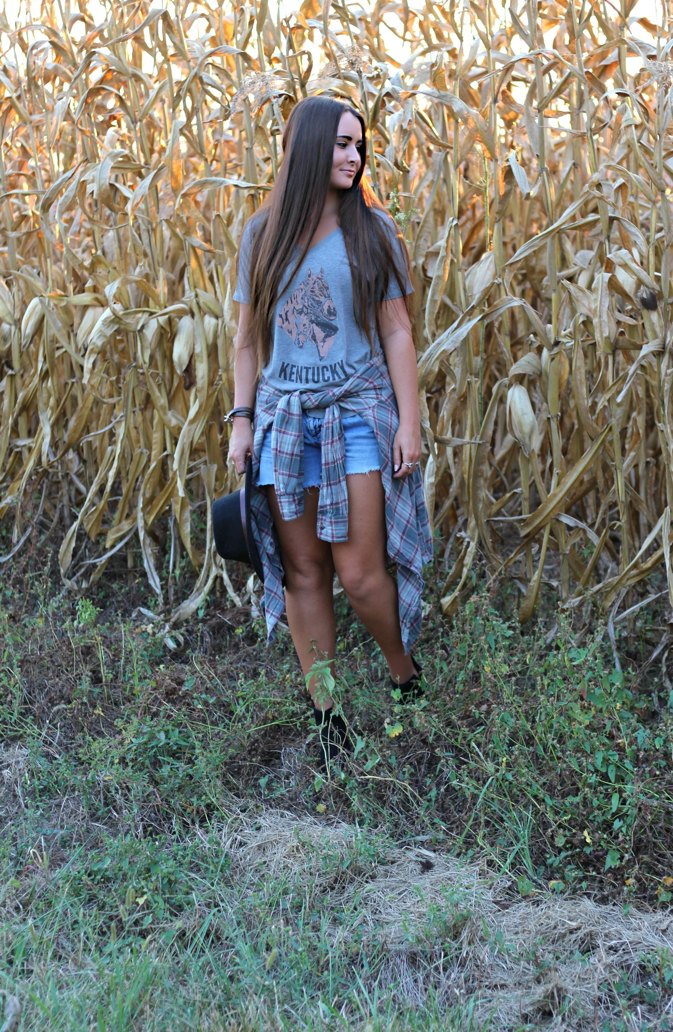 I am very impatiently waiting for chilly autumn weather and just dying to start layering up with fall staples. One of my favorite ways to wear vintage flannels is just simply tied around the waist, and it also just happens to be a perfect way to wear them when it's still a little too warm out to wear them normally. Wearing shorts with booties and a flannel is my favorite way to easily transition outfits from summer to fall, especially when the weather is still in summer mode like today. I'm thrilled that we have our original design "Kentucky Souvenir Tees" back in stock (thanks to My Kentucky Tee for printing these up for us!). These are some of my all-time favorite tees and I seem to be wearing this super comfy slouchy-v-neck + my baseball tee every single week! You won't believe how soft these are and the vintage horse motif is so perfect for fall (a must-have for tailgates + Keeneland season!). I've linked them below so you can shop them as well as the rest of my outfit details!