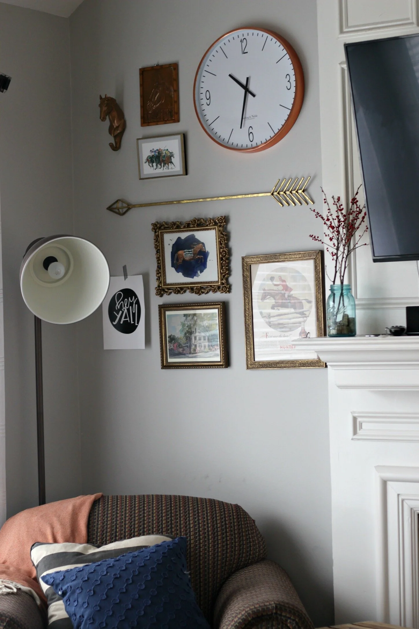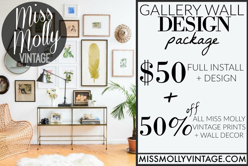 I was thrilled to team up once again with Peddler's Malls Stores for another makeover giveaway! The Peddler's Mall Stores are my go-to spots for finding unique, one-of-a-kind pieces to build my gallery walls. Everything used in this gallery wall giveaway was from our shop or the Georgetown Peddler's Mall location. I went for an equestrian theme because I just can't get enough horse decor in my life and I thought it went perfectly with many of our Kentucky prints! The giveaway winner just happened to have the cutest house and best style, and everything I had chosen for the gallery wall fit in perfectly with her existing decor (she already had the copper clock, arrow, and Thirsty Hearts Design print). I also love this idea of a gallery wall on each side of a television to kind of camouflage the tv and keep your eye moving around the room. If you would like help putting together a similar gallery wall in your own home, don't forget to take advantage of our latest design special (see below). Not only do you get a discounted design fee (just $50 for full design and installation), but you also get 50% off all Miss Molly Vintage prints and wall decor! Get more details and sign up here.