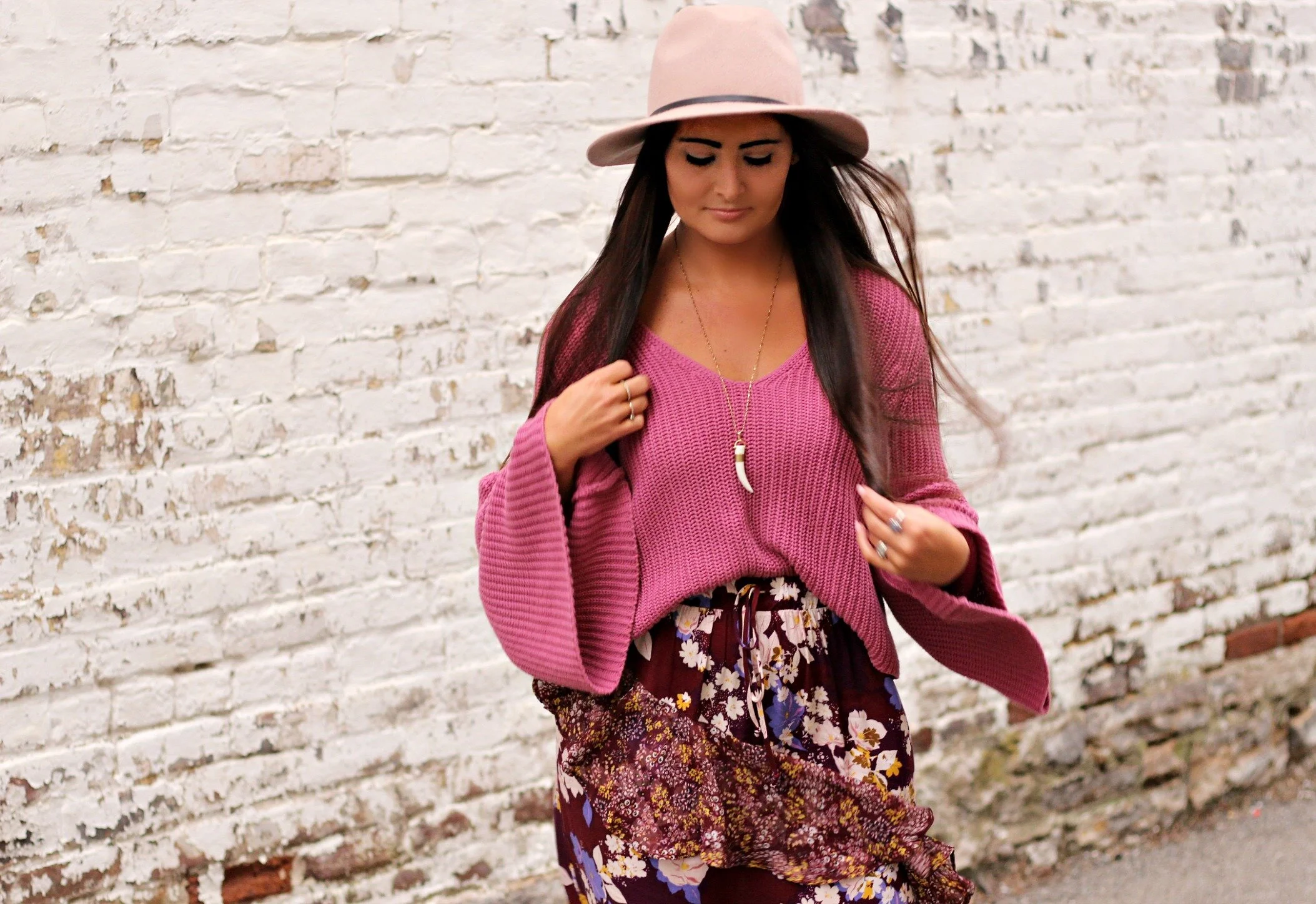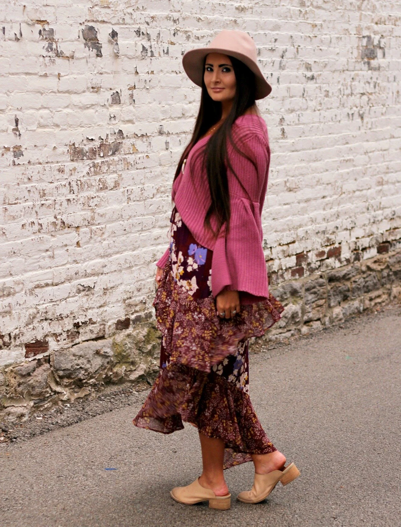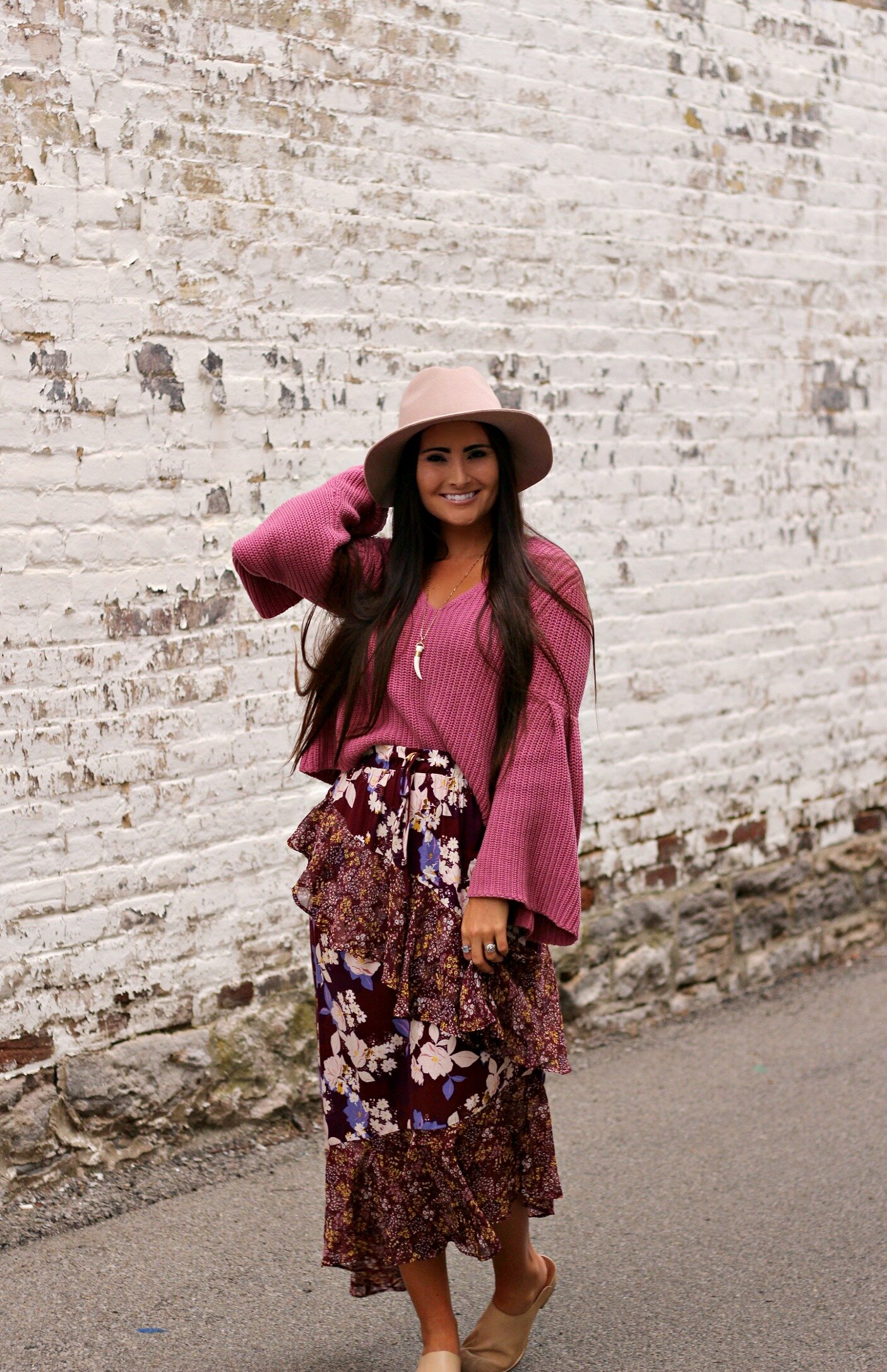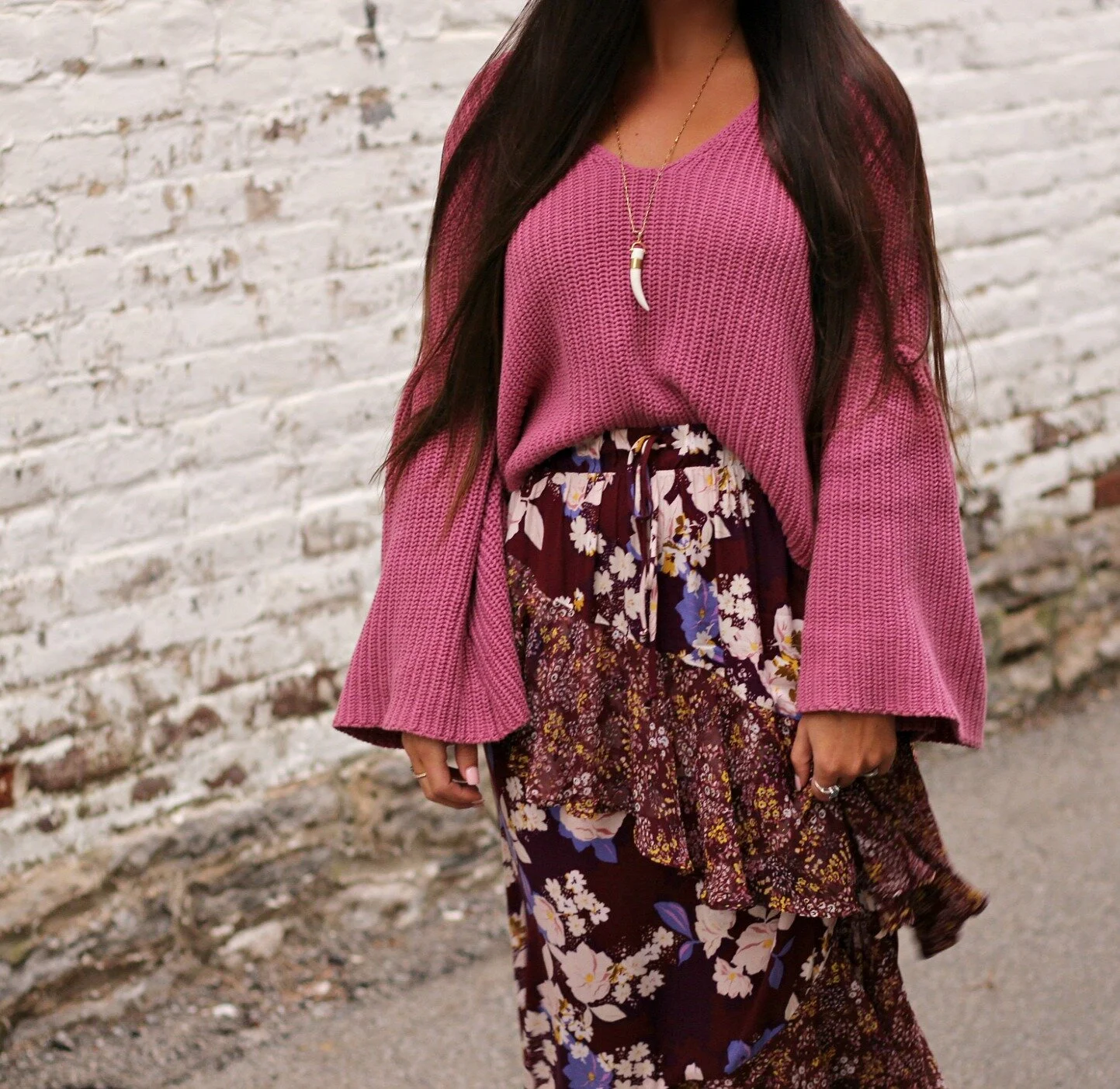 Blush + ruffles + bell-sleeves + florals- these are a few of my favorite things, and this outfit just happens to have all of them! I love all the beautiful pastels and deep jewel-tones that are popping up this fall especially when a floral print is included. This skirt from Target has all that plus the cutest cascading ruffle detail (AND it's under $25!). I paired it with my favorite Free People sweater which I seem to wear with everything because it's just so comfy + flattering! I've linked all my outfit details for you to shop above + below!