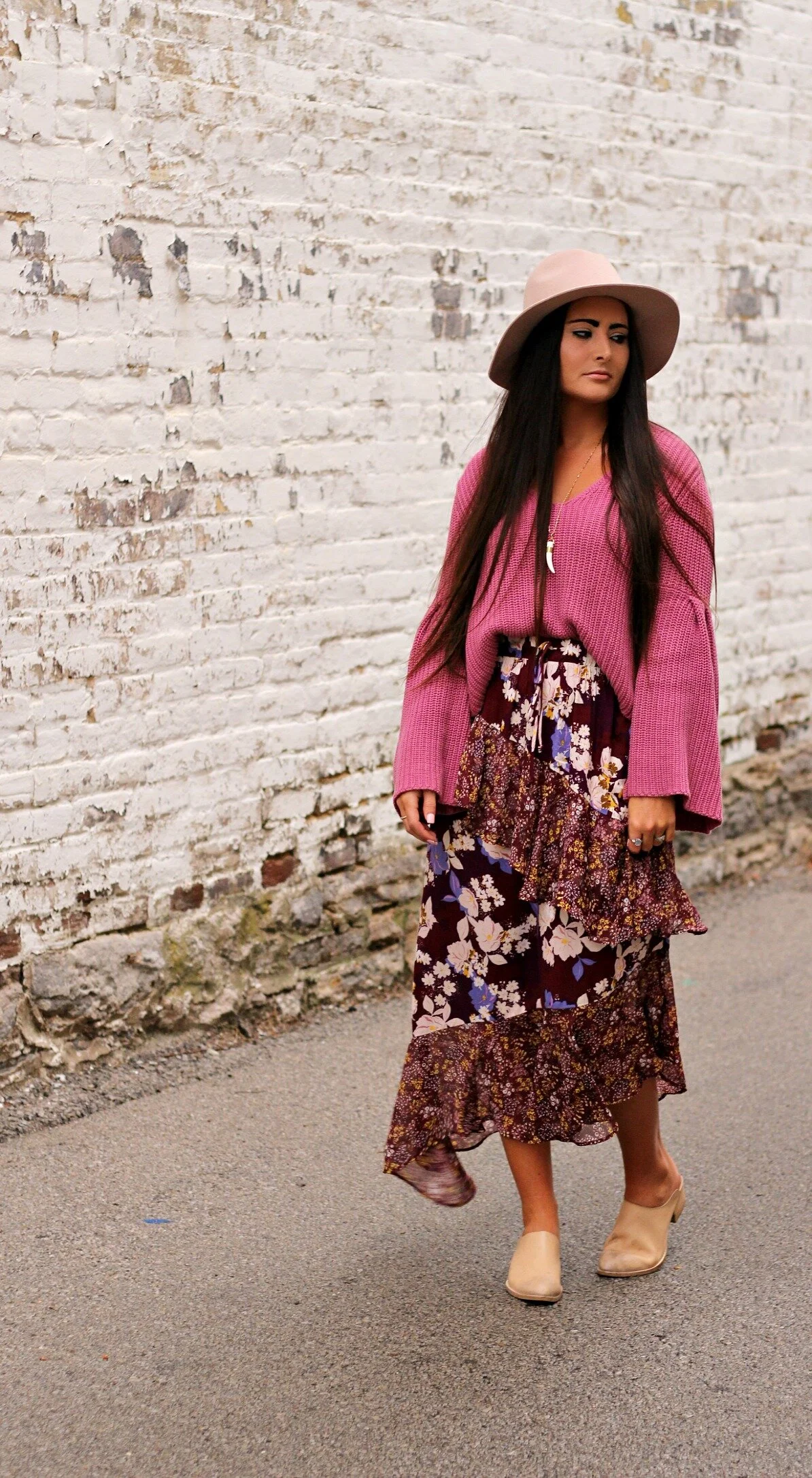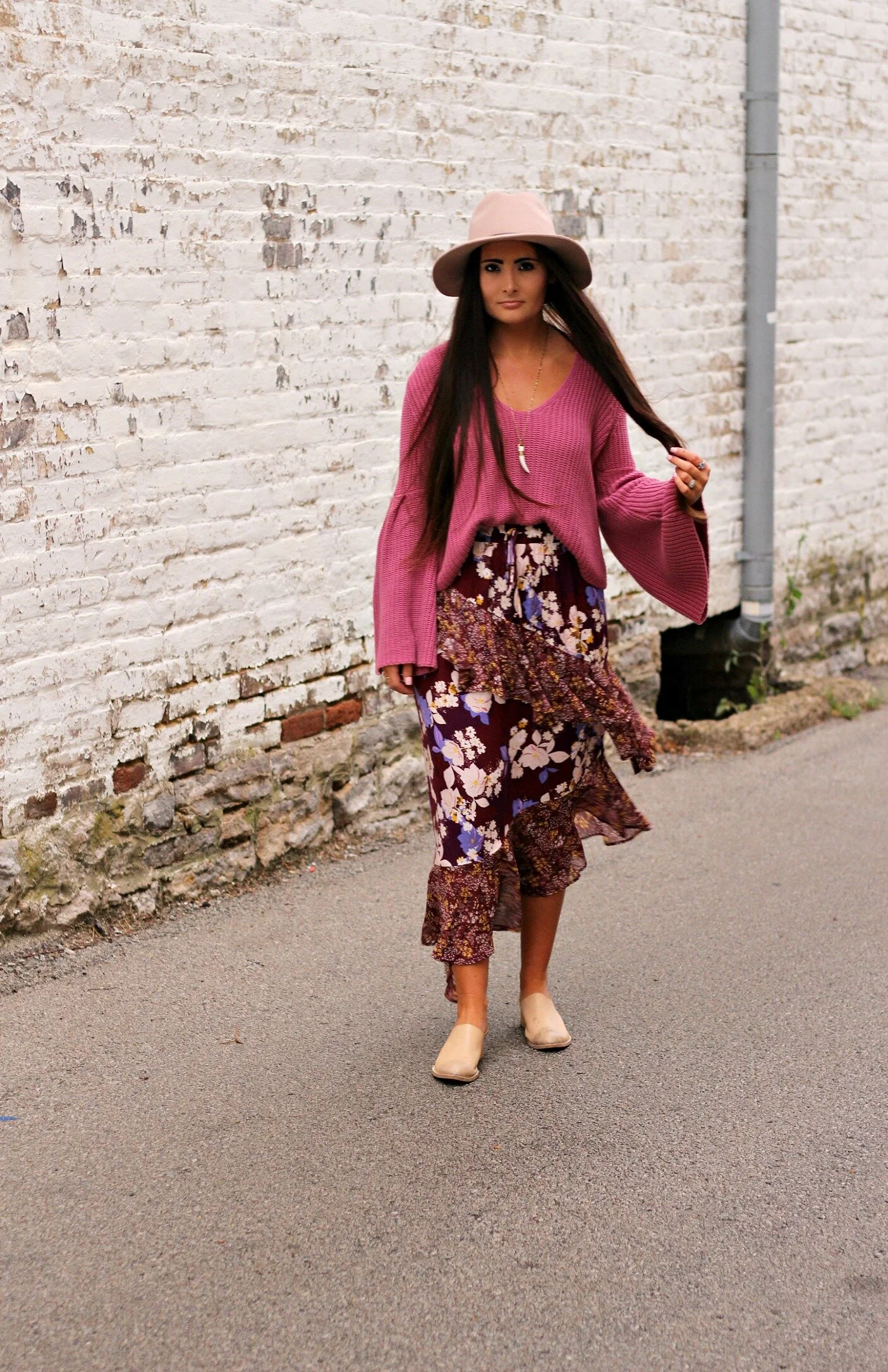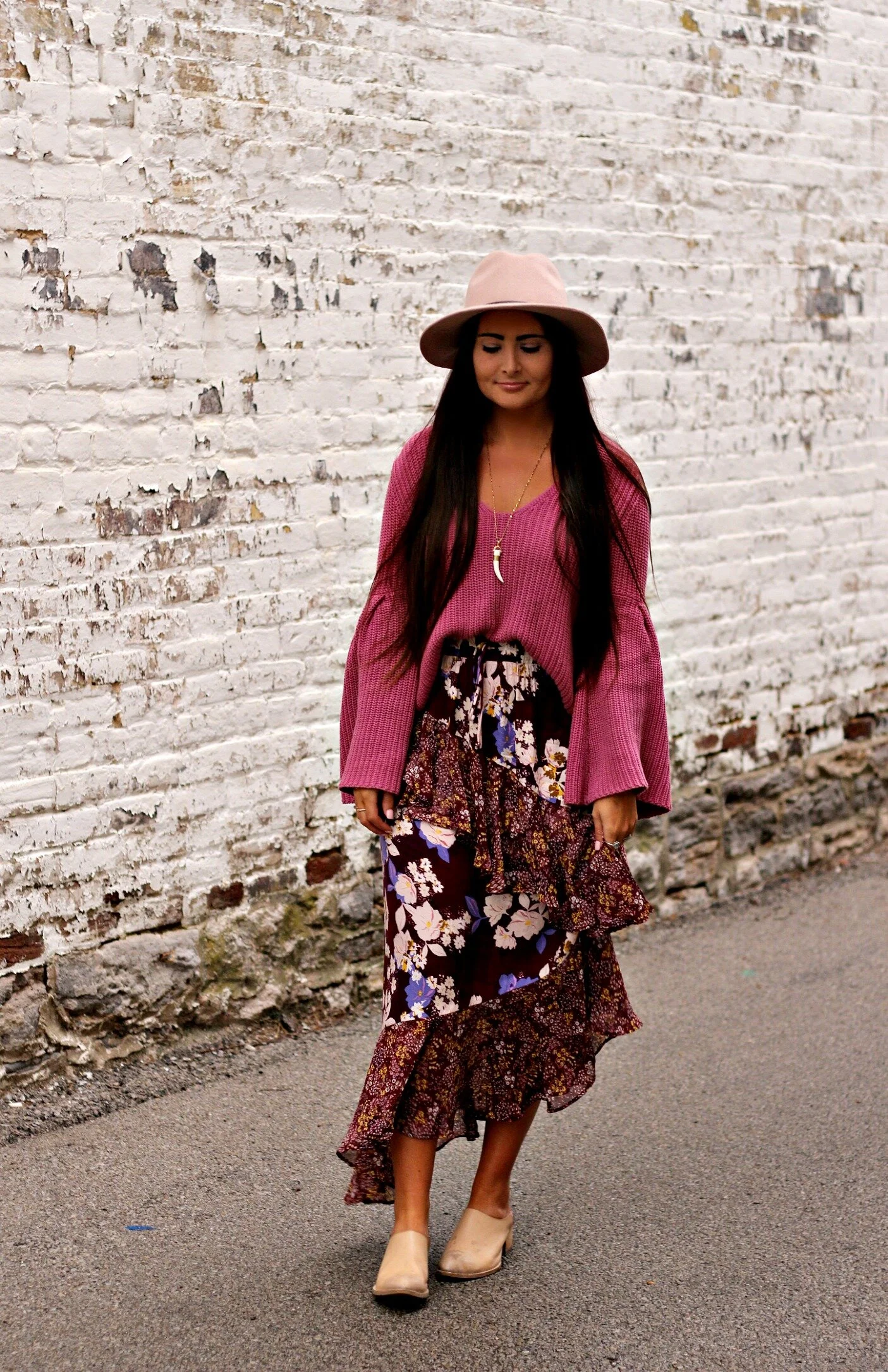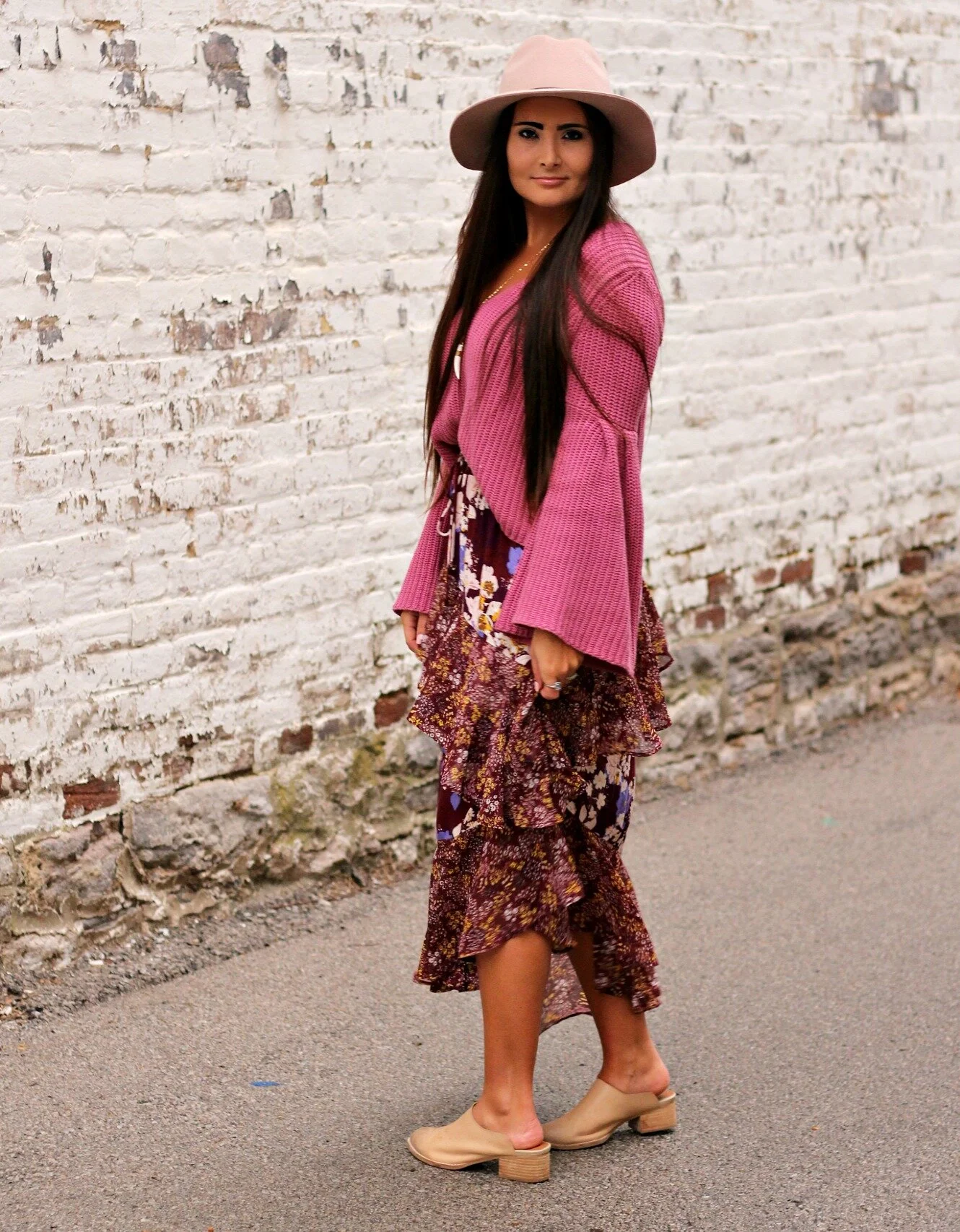 Blush + ruffles + bell-sleeves + florals- these are a few of my favorite things, and this outfit just happens to have all of them! I love all the beautiful pastels and deep jewel-tones that are popping up this fall especially when a floral print is included. This skirt from Target has all that plus the cutest cascading ruffle detail (AND it's under $25!). I paired it with my favorite Free People sweater which I seem to wear with everything because it's just so comfy + flattering! I've linked all my outfit details for you to shop above + below!
