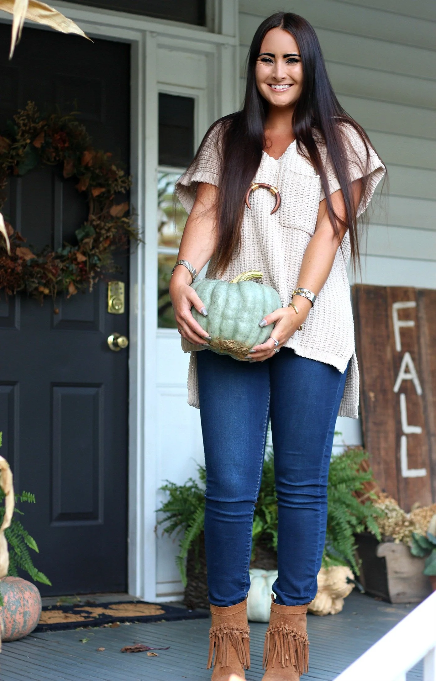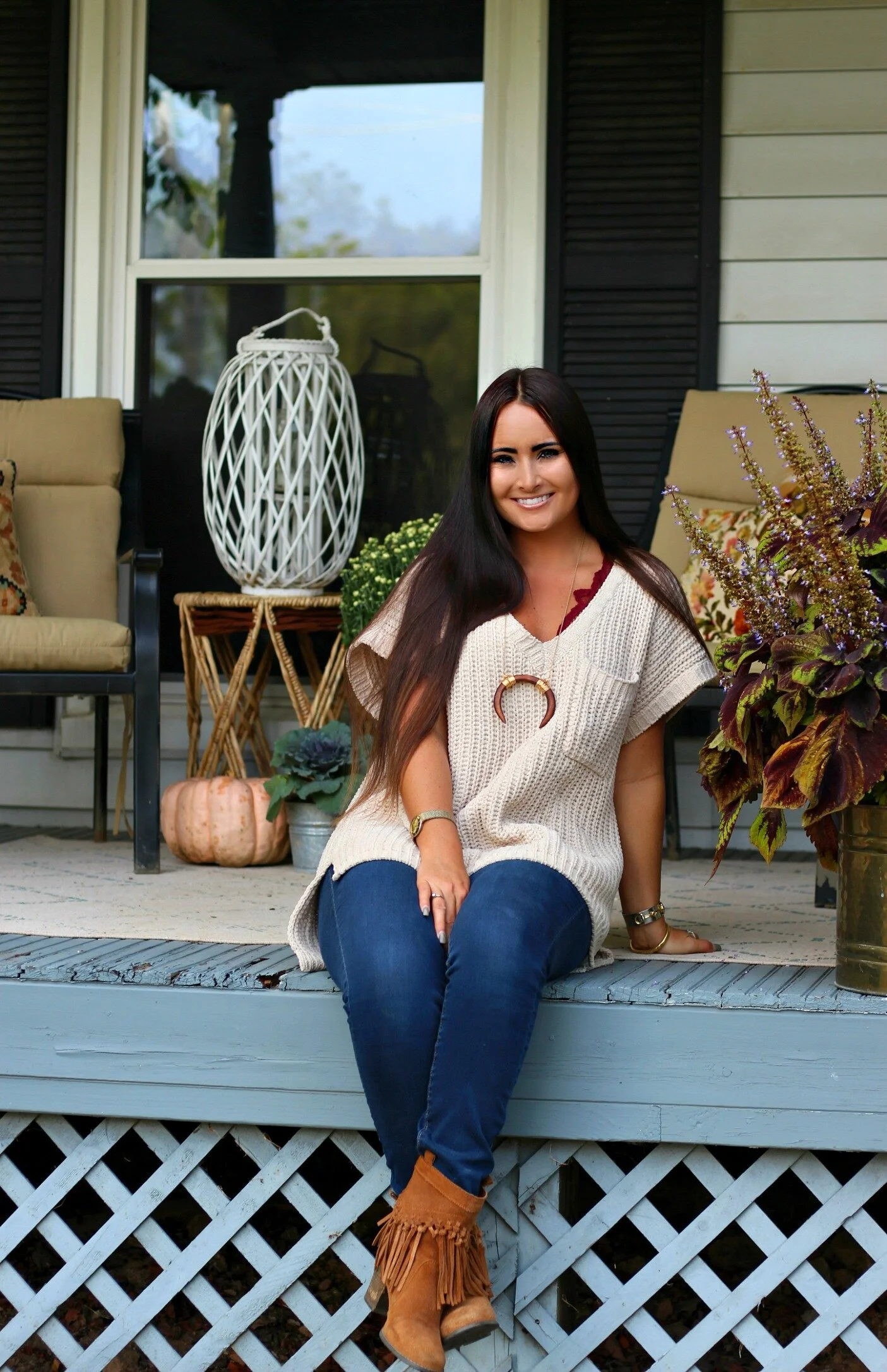 Happy October! Yesterday Alex and I celebrated our 6 year wedding anniversary and took a little day trip to Louisville. We ventured out to Huber's orchard too which is right outside of Louisville in Stalight, Indiana. It is truly like an autumn wonderland with a winery, distillery, ice cream + cheese shop, marketplace, restaurants, and of course apples + pumpkins galore. They even make all kinds of delicious treats like apple cider and pumpkin donuts, fudge, fresh breads, pies, icecream, and more right on sight. Since it was a little chilly in the morning but very sunny in the afternoon, this Calypso sweater was the perfect piece to wear. It has the most perfect slouchy, oversized silhouette and is made of a super-thick and cozy chenille knit. Pair it with your favorite camisole or bralette (this one from Free People is to-die-for!) or layer it over a long-sleeve tee or light-weight turtleneck. It really is the perfect transitional piece to take you into fall!