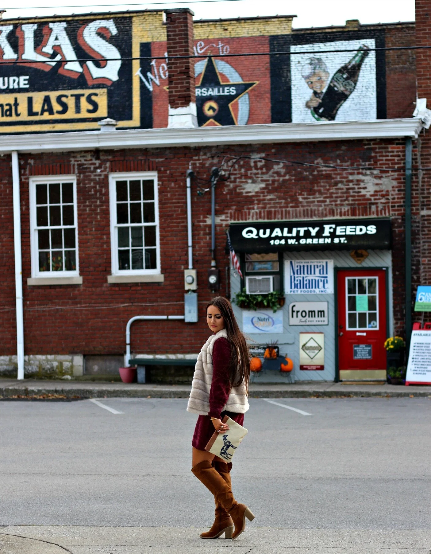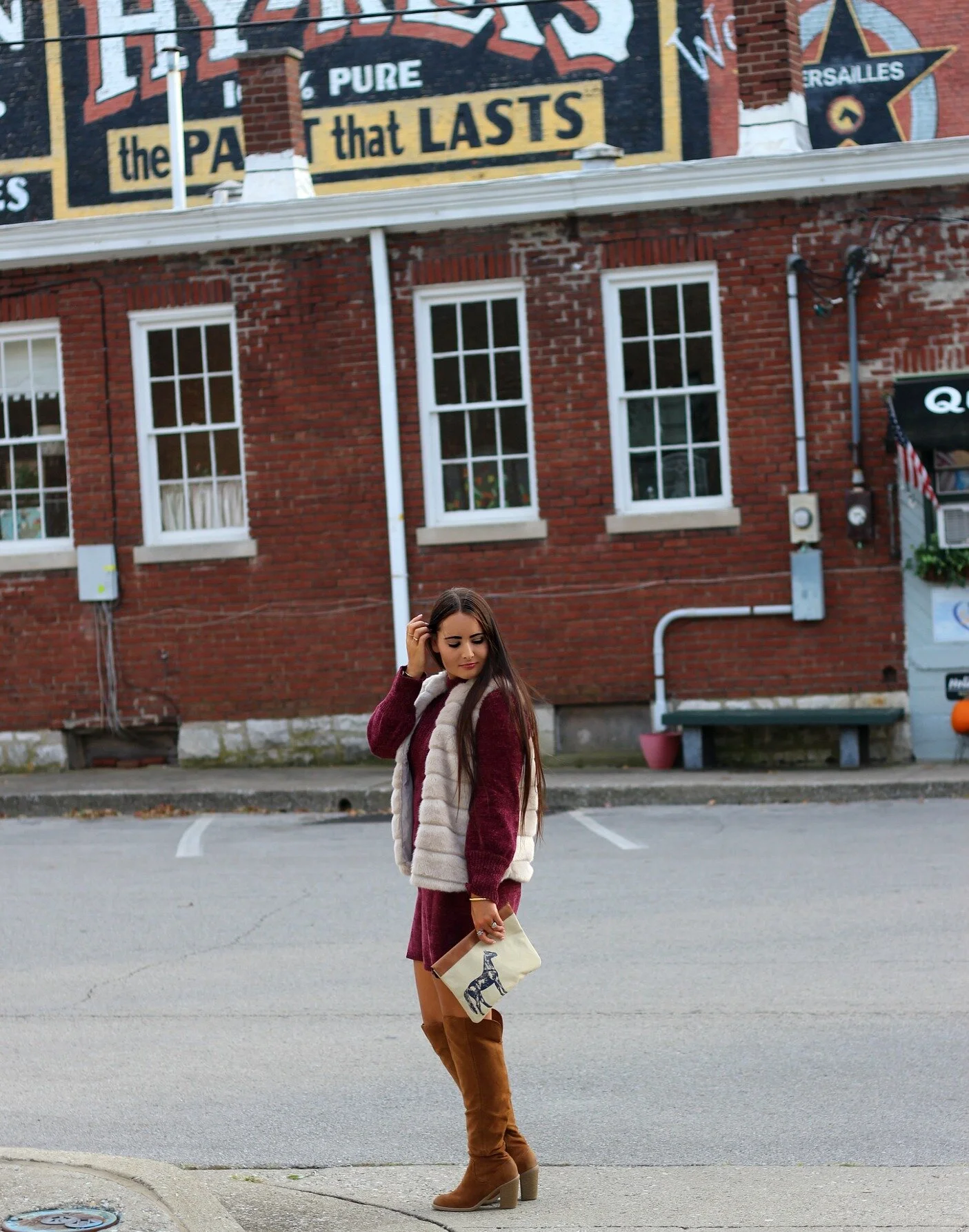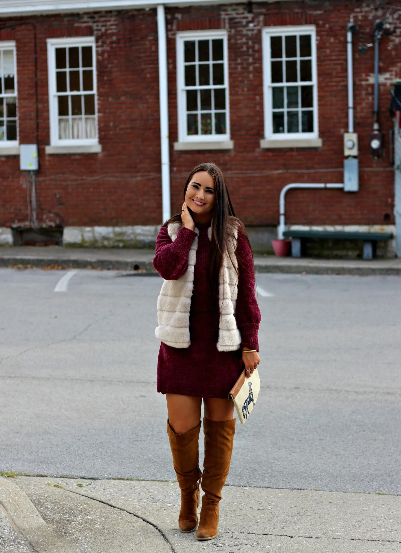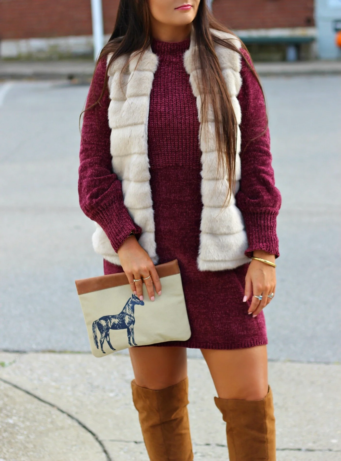 Sweater Dress | Over the Knee Boots (old- similar here) | Faux Fur Vest: Who What Wear for Target (not available yet online but in-stores) | Clutch c/o Pomegranate Inc.