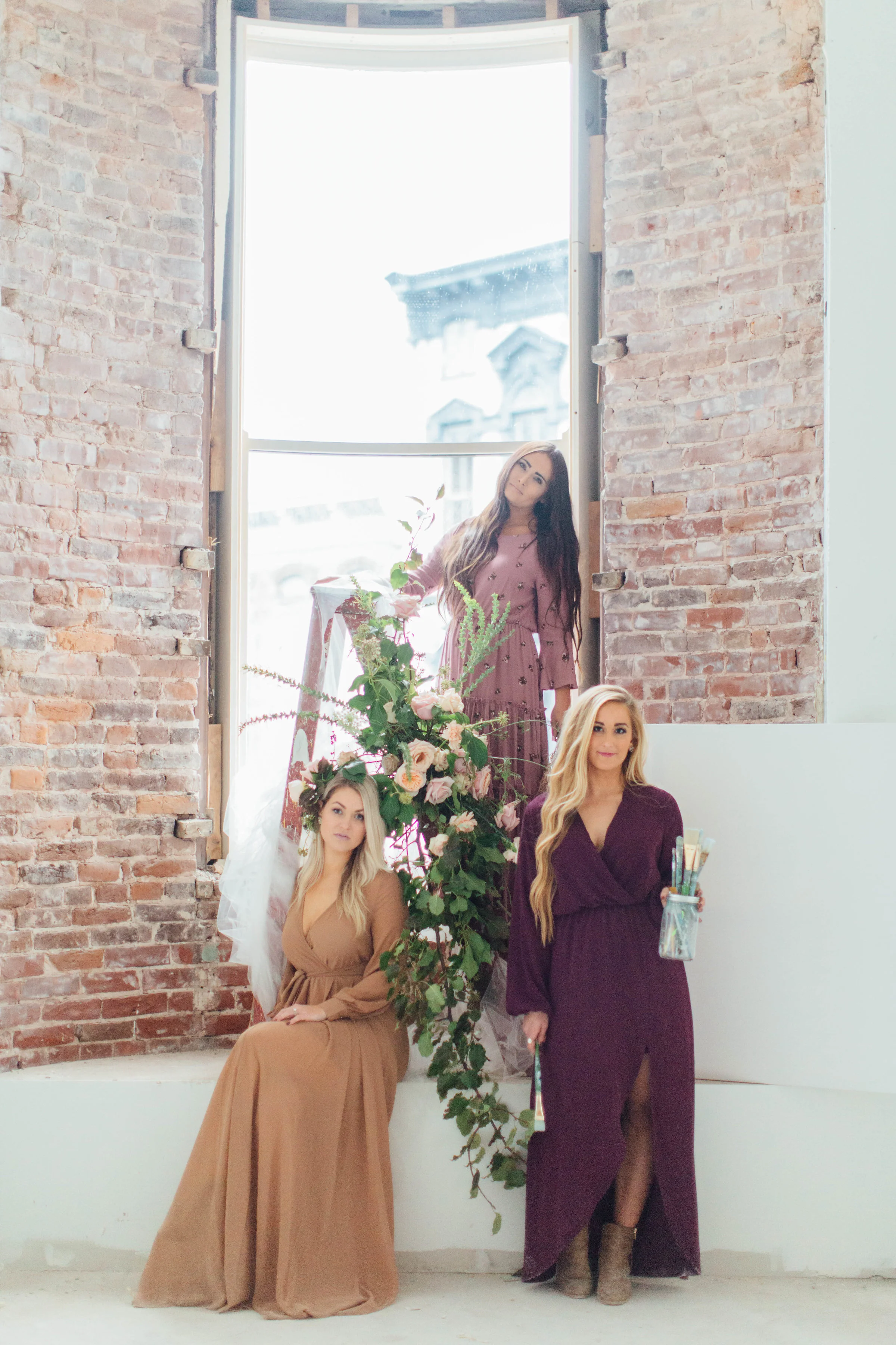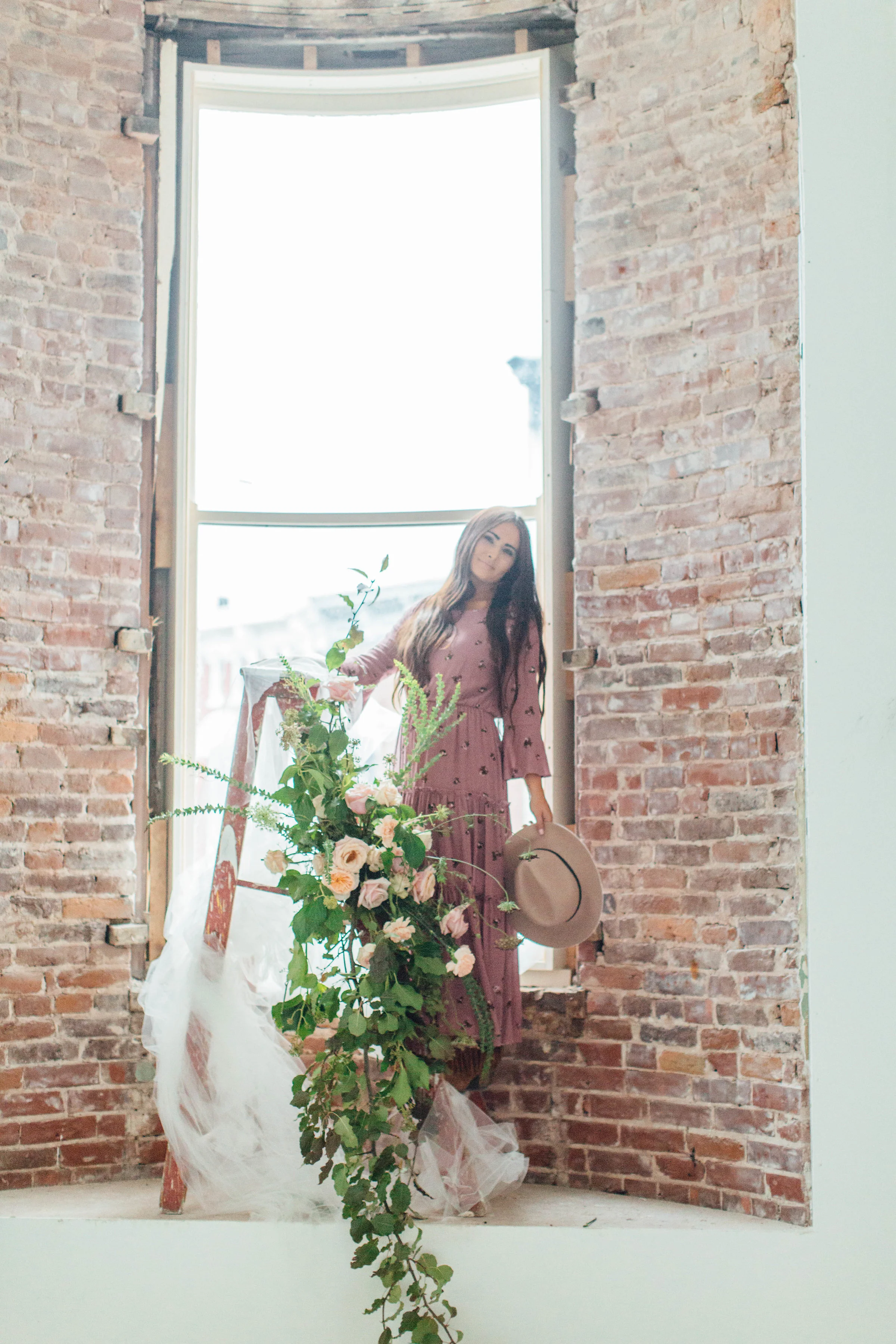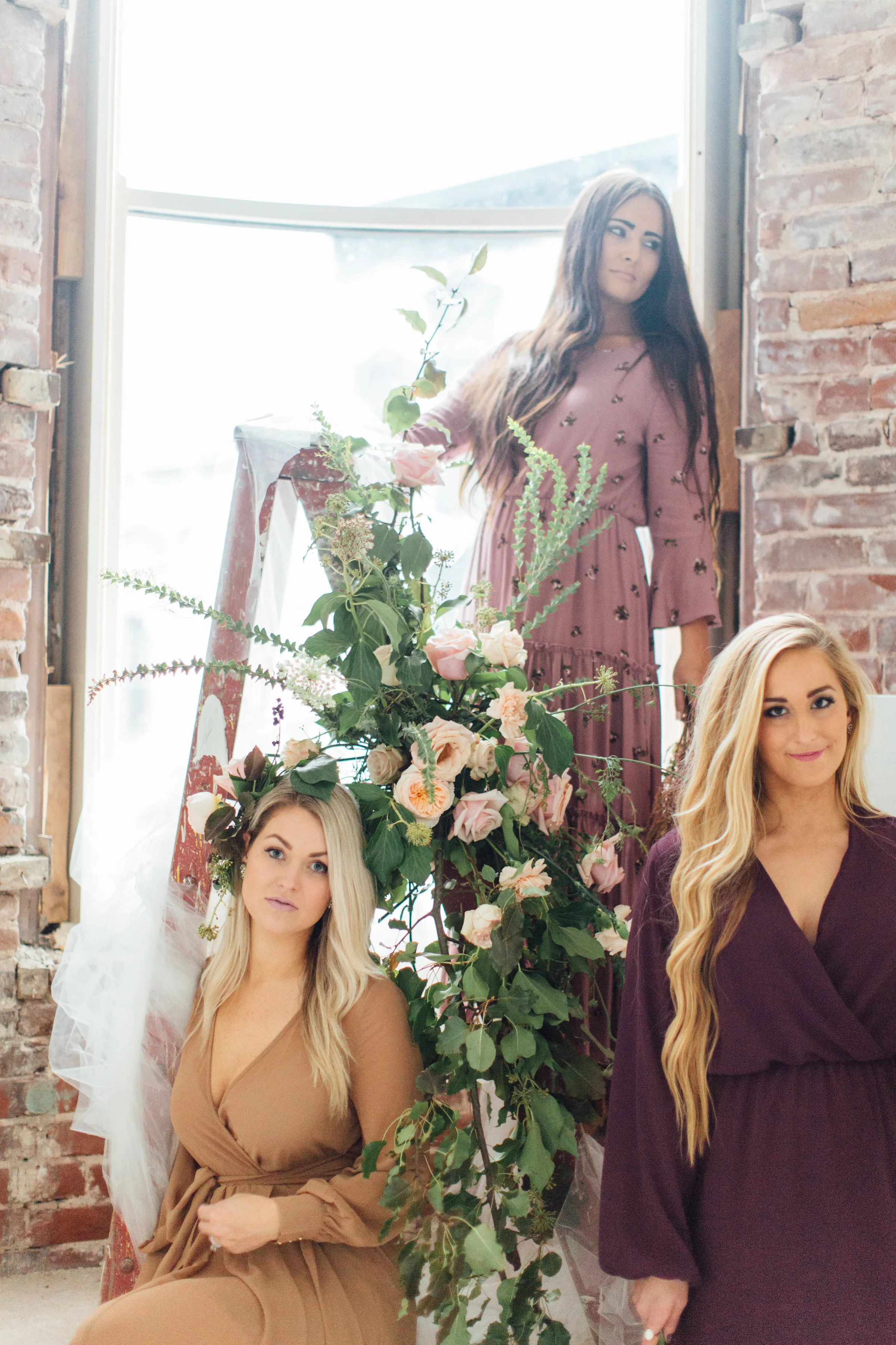 This past week I had the privilege of participating in the most fun styled shoot put together by the ladies of Blush Box + Co. to promote the opening of their new studio space. I'm so excited that they will also be a part of Gathered Mercantile and this shoot is just a small preview of all the gorgeous pieces they have to offer in their boutique! Brooke with On a Whim photography had such an amazing + unique vision for this shoot and the end product was even more beautiful than I imagined. I was thrilled to use the Amsden as the backdrop for these gorgeous photos and loved getting to show everyone the space. We shot everything in the upstairs corner office (soon to be Shop Twenty Something boutique). Zachary Brady Designs provided the most beautiful floral arrangements and even whipped up some stunning custom designs on the spot (like the ladder + fireplace arrangement). I loved getting to shoot with two of my best blogger friends, Kayla Weber + Candice Michelle (both of their blogs are linked below). Both of these ladies inspire me daily and I'm so happy to know them and have their support. Take a look at some of my favorite photos from the shoot below + be sure to check out all the vendors involved (I've linked them all as well).