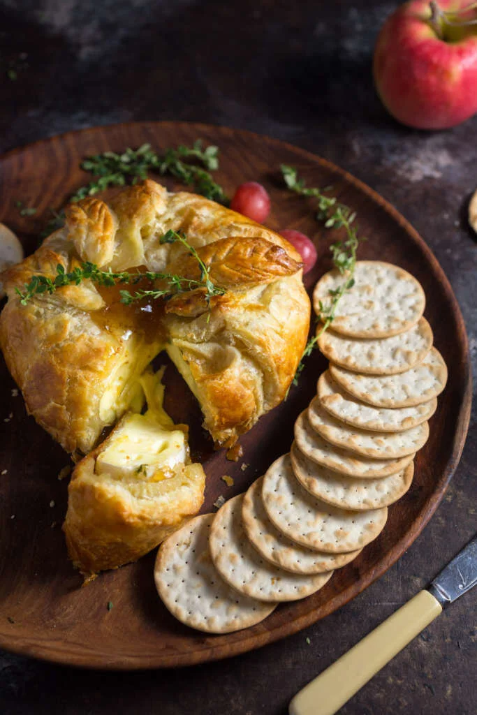A warm, gooey wheel of brie or camembert cheese, topped with sweet fig jam and wrapped in golden brown, flaky puff pastry.
