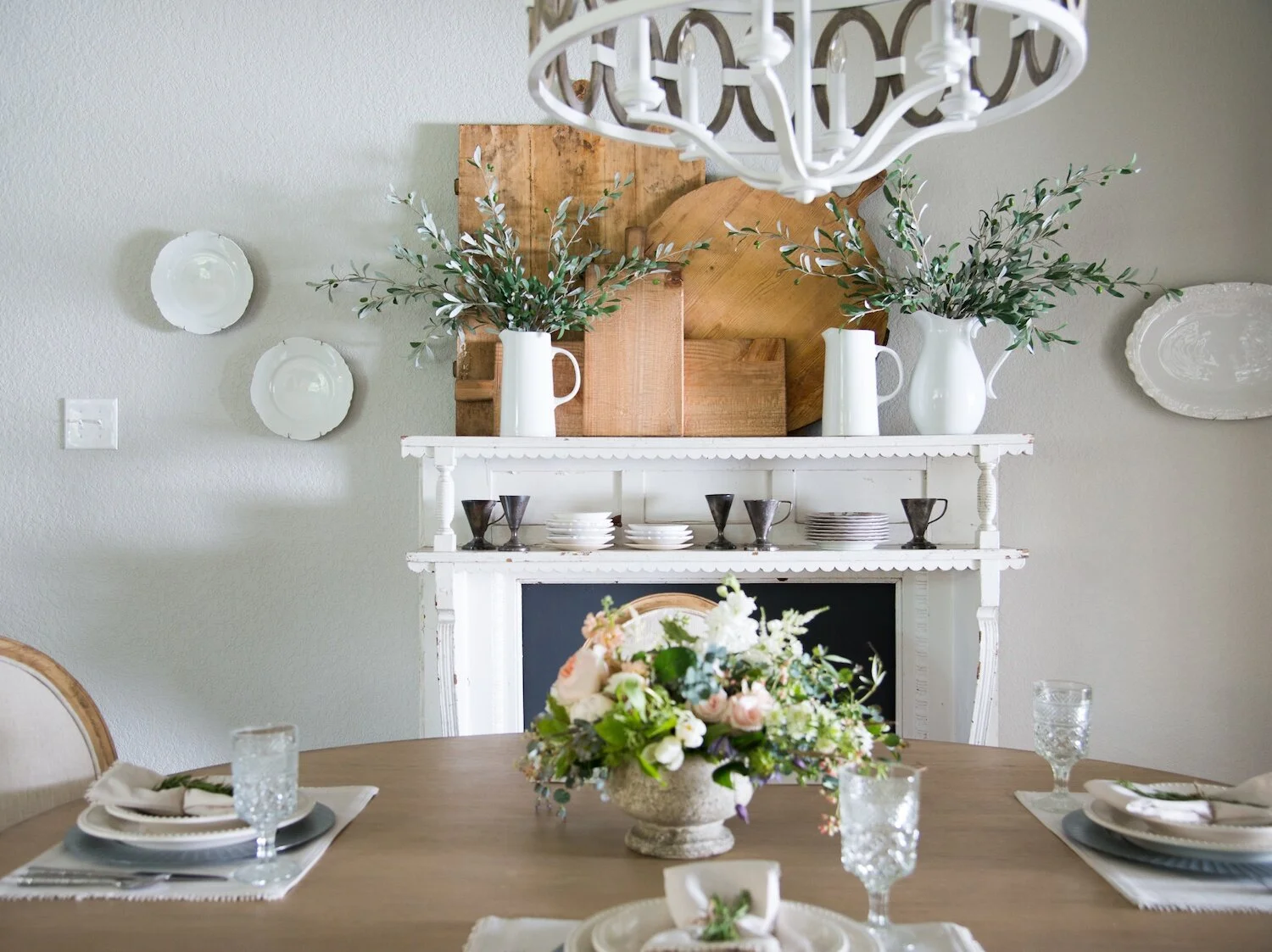 My favorite part of this space is the simple arrangement on the mantle. I love the collection of vintage white plates, pitchers, + silver pieces. These are all things that can easily be found on the cheap at thrift stores, flea markets, or garage sales, but I've also linked some newer options below. The collection of bread boards looks perfect leaned up against the wall + adds a little contrast to all the white.