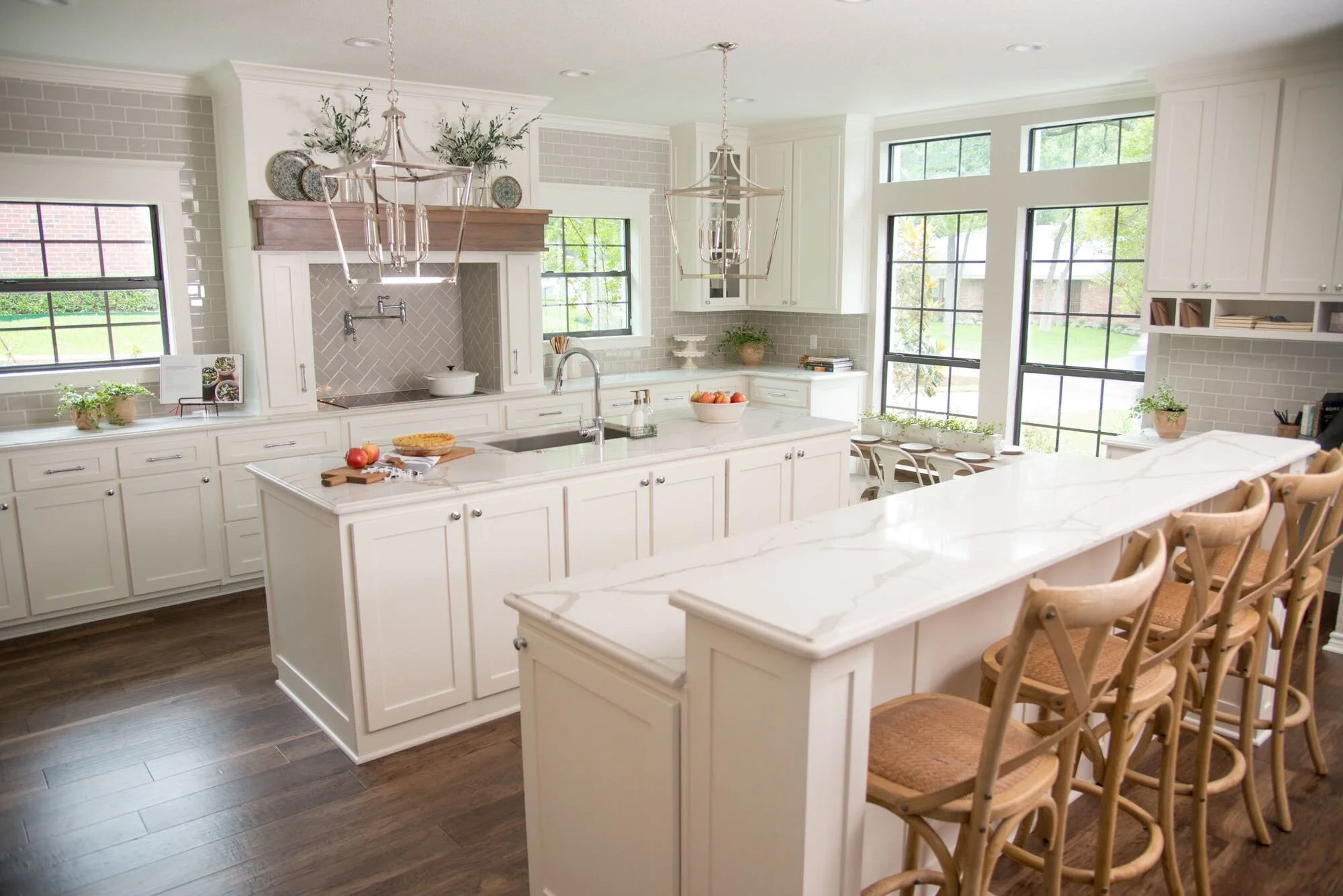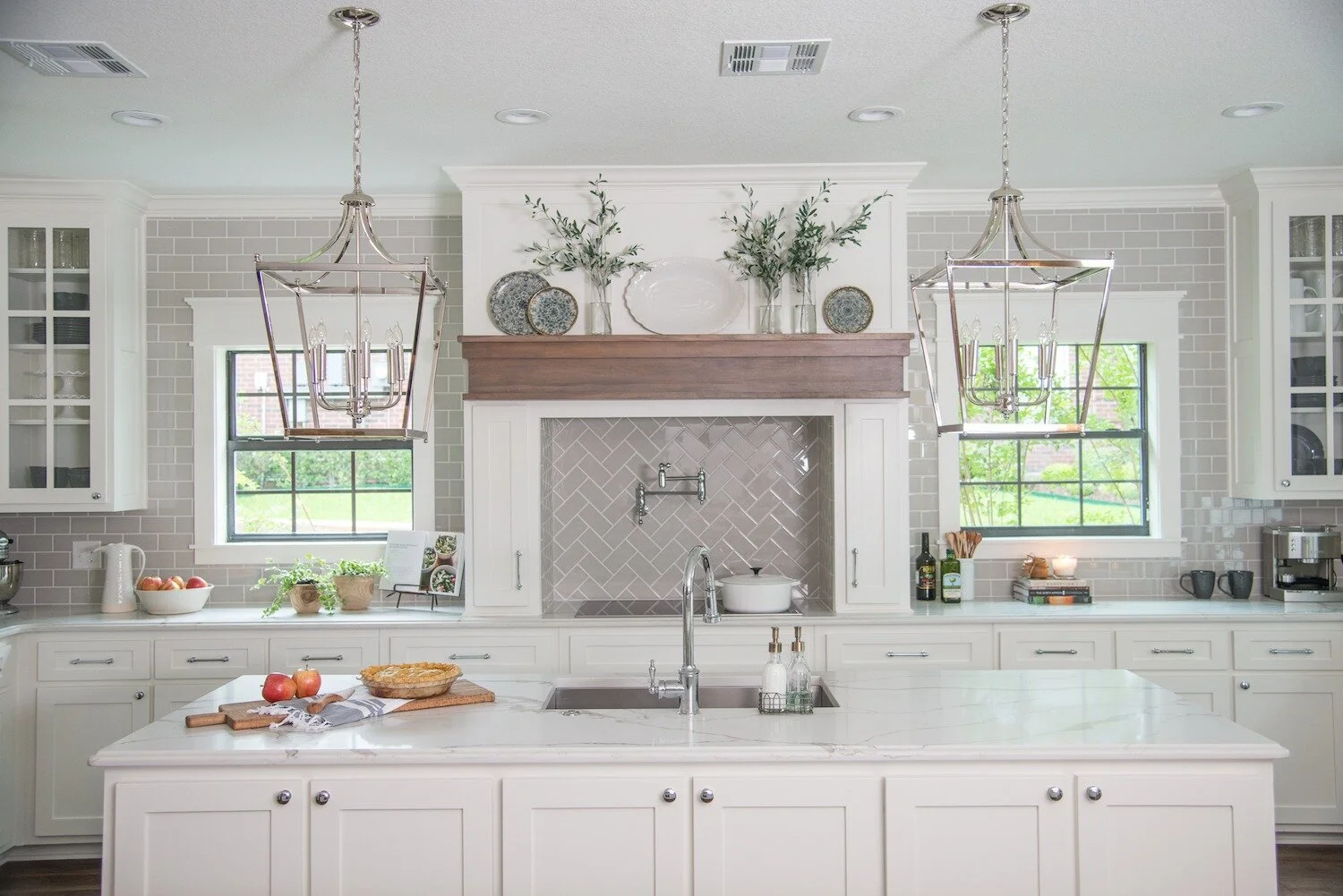 This kitchen is so classic + timeless and I love the bright, clean feel. These open-lantern style pendants have been popping up everywhere and are my favorite type of island lighting lately. I love how Joanna chose a grayish subway tile for a little contrast against all the white cabinets + countertops AND how she did a contrasting chevron pattern above the stove! That little mantle detail on the range hood is also amazing and such a good idea to create a focal point in the room.