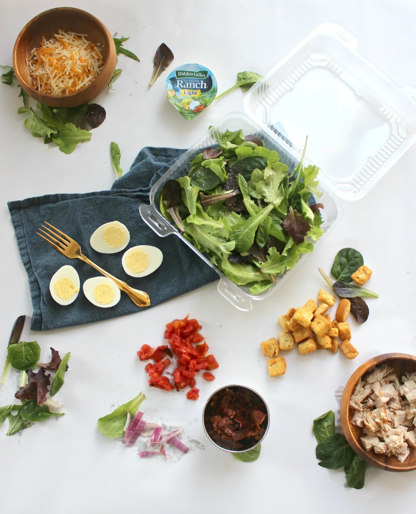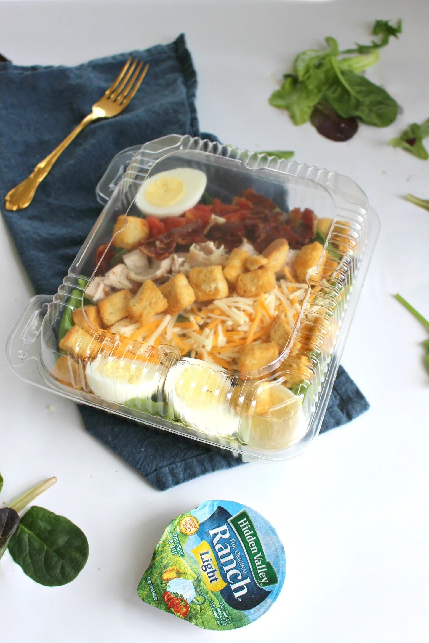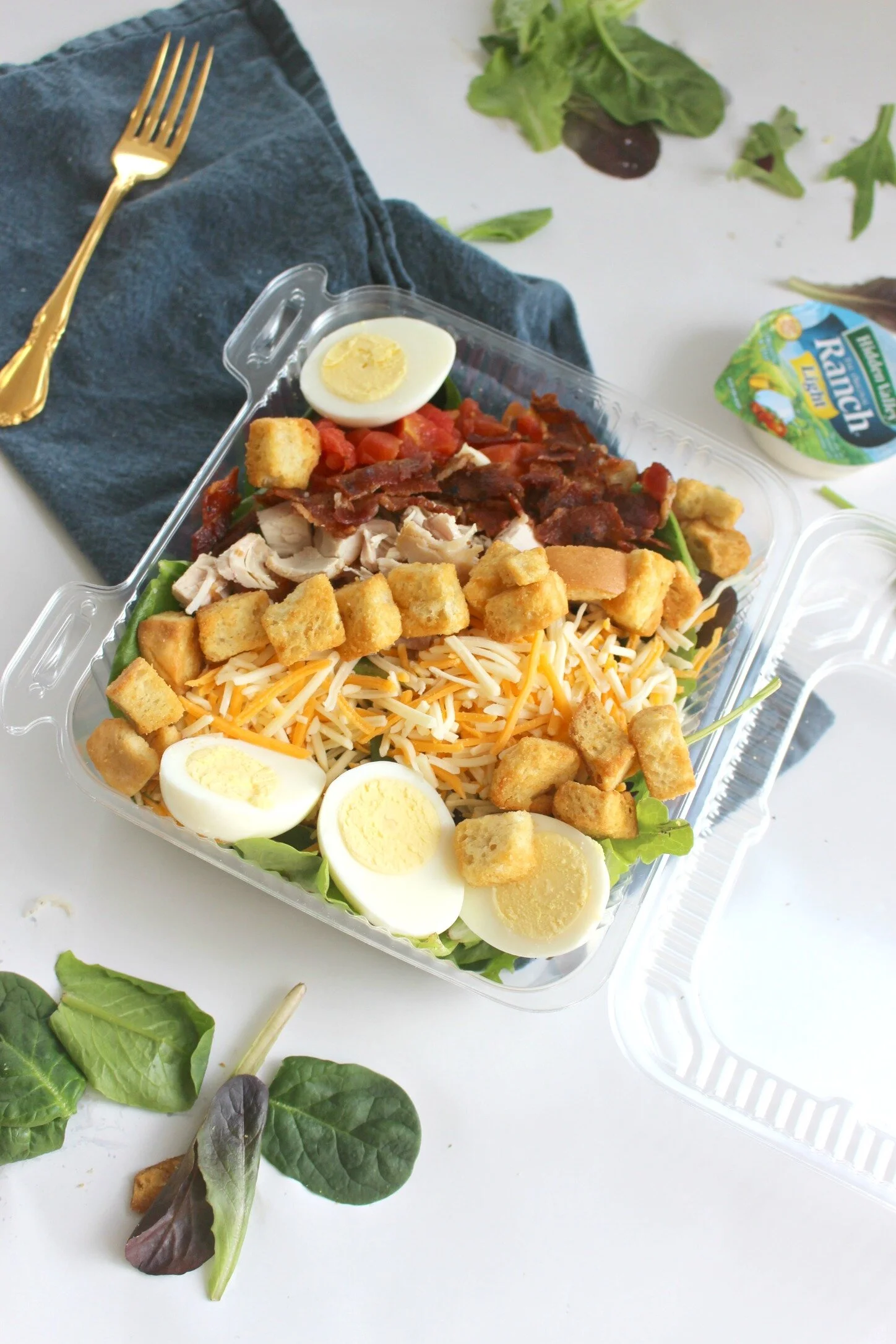 This week's packable salad is sure to be a hit, even with the pickiest of eaters! This chicken cobb combines chicken with cheddar cheese, hard boiled eggs, red onion, fresh chopped tomatoes, croutons, and of course, bacon! It's topped with Ranch which is the perfect cool and zesty dressing to tie together all the ingredients. This salad is super filling and very easy to make too! You can use either chopped grilled chicken or deli chicken breast. For the dressing, I used a pre-packaged Ranch dressing cup, but you can also make your own homemade Ranch, or pour some dressing into a small jar to pack inside your salad. I used my favorite Texas Toast brand "garlic and butter" flavor croutons and I also just grabbed pre-packaged hard boiled eggs at the grocery to cut down on prep time. You can shop my packable salad containers and check out all the ingredients for my chicken cobb salad below!