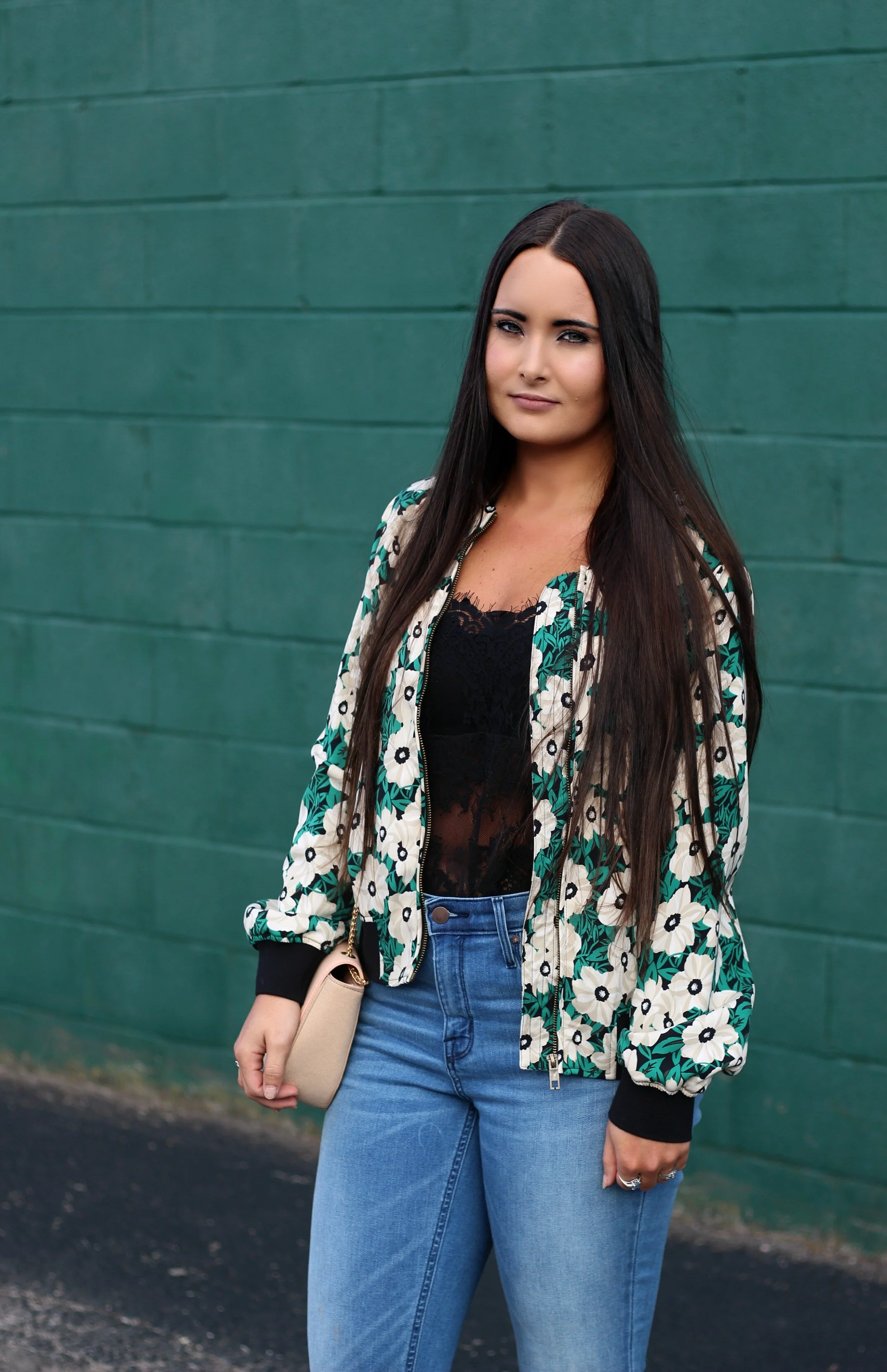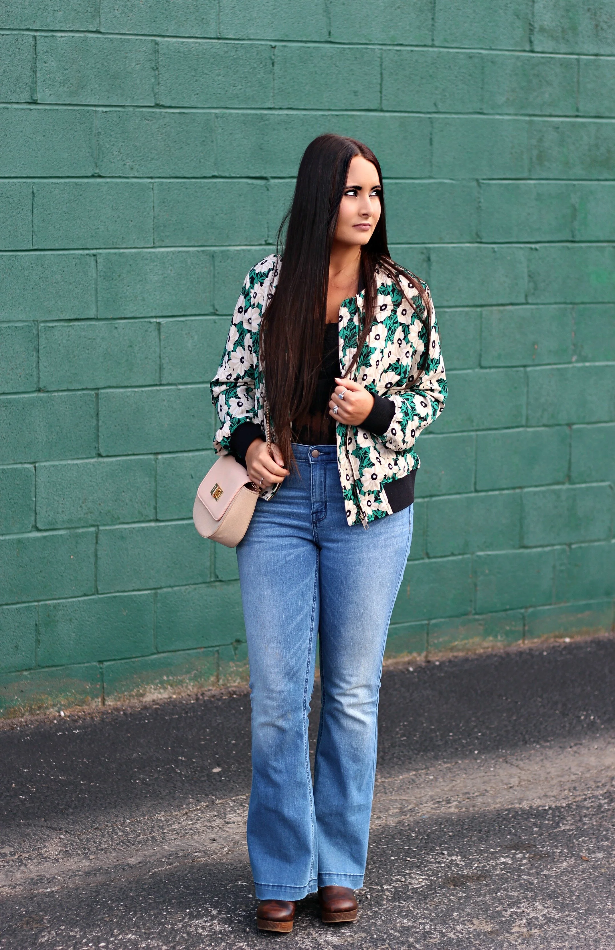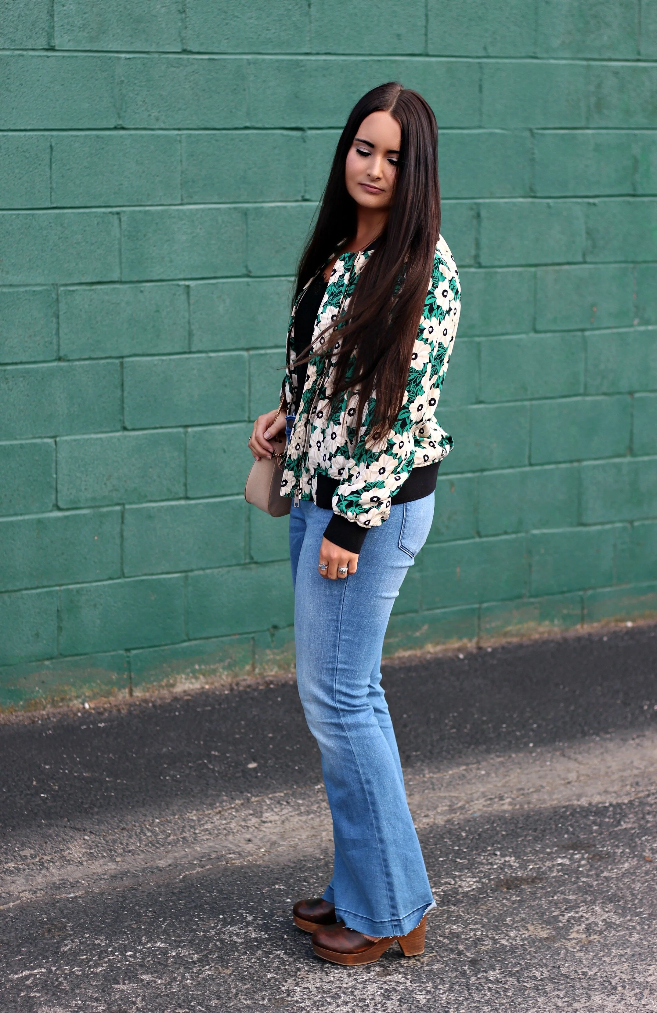 When I spotted Who What Wear's latest spring line at Target, I was instantly mesmerized by all their bright, vintage-style floral prints. This bomber jacket was one piece I just HAD to have- it's the perfect transition piece to brighten up the remainder of you winter wardrobe, then later layer over springy dresses and blouses. I played up the boho vibe of this print by pairing it with some denim flares and clogs, and layering it over a sheer lace camisole. Just looking at this gorgeous floral print brightens my day and this piece is sure to be on repeat over the next month as I'm dreaming of spring!