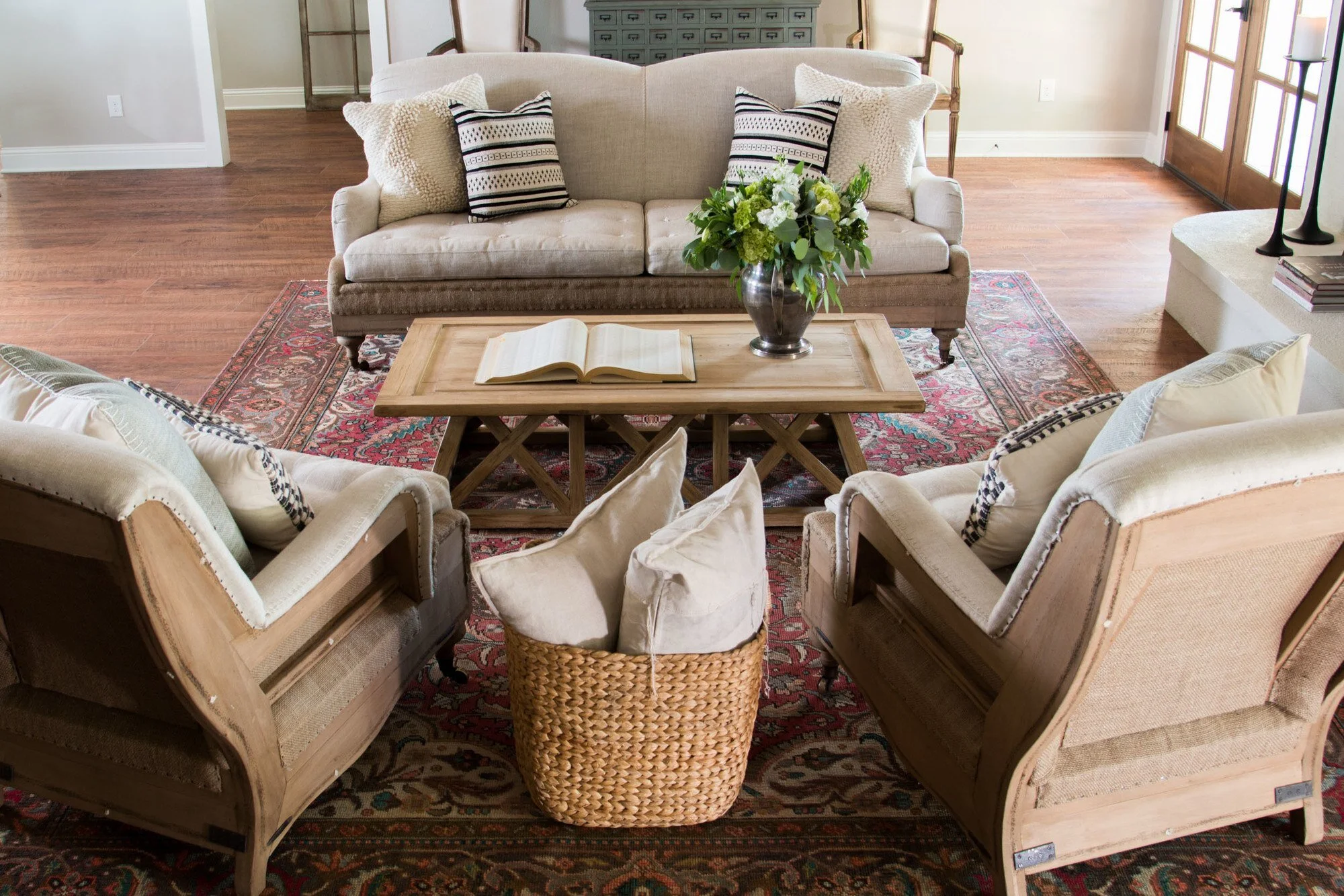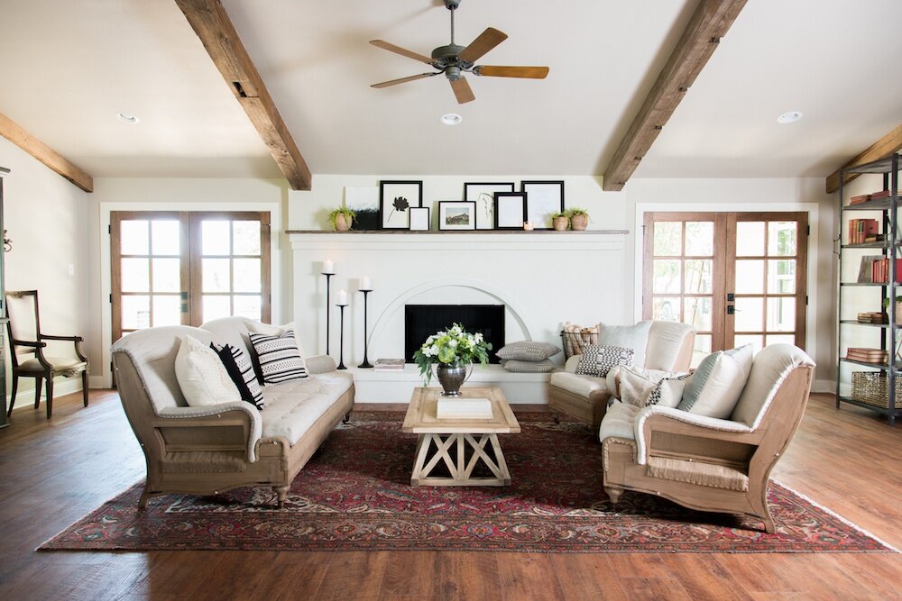 By far my absolute favorite space in this renovation was the gorgeous living room that was the perfect mix of rustic and modern! The space feels so clean + bright, but also has classic farmhouse elements like the distressed beams, linen furniture, and reclaimed coffee table. The entire space is super neutral, except for the printed rug with adds just the right amount of interest and pattern to the design! I've linked similar furniture picks + rugs below to help you achieve this same look: