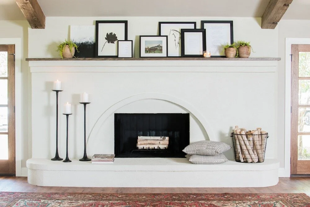 I love the European flair of this room and also the modern touches, like the graphic black and white collection of frames/art on top of the mantle. The giant white arched fireplace definitely has a slightly Spanish, or French countryside feel and I love the character it adds to the room. I've linked similar accessories including frames, planters, baskets, and more below to help you duplicate this same style:
