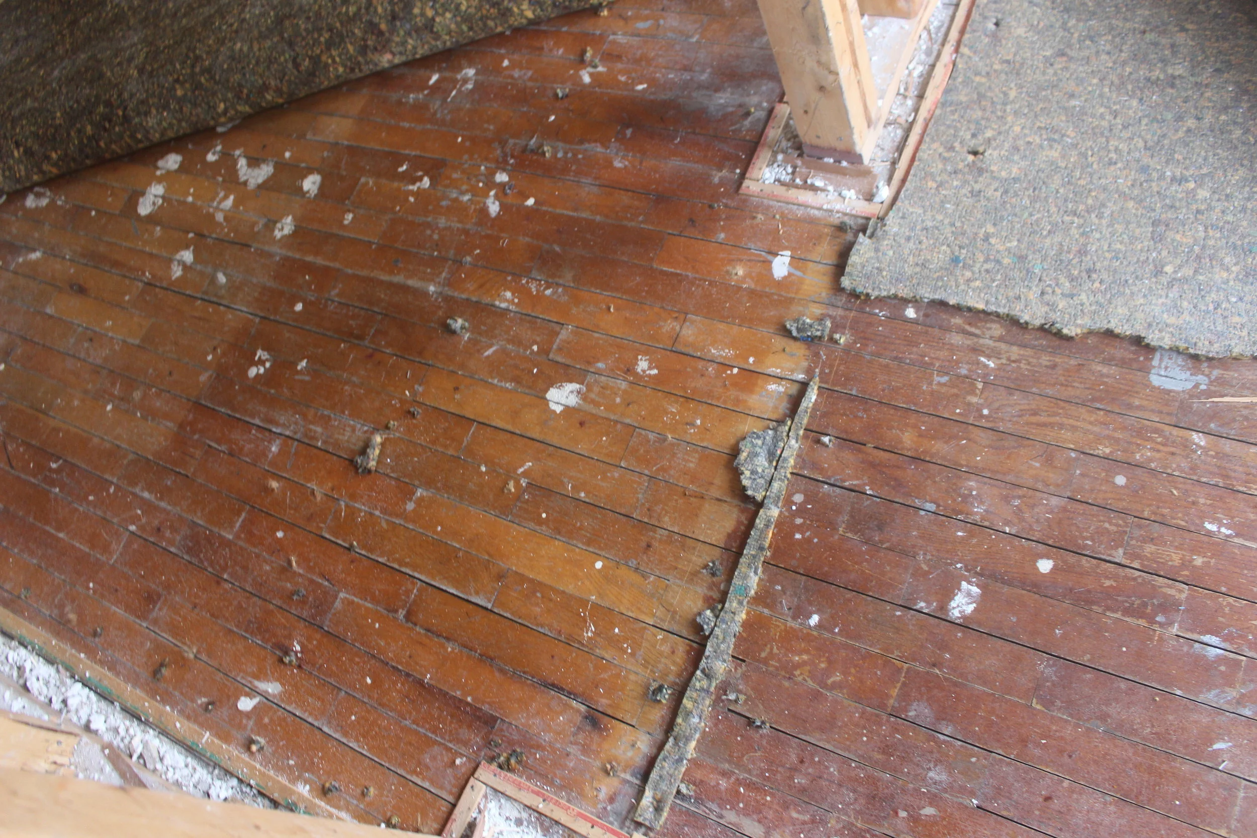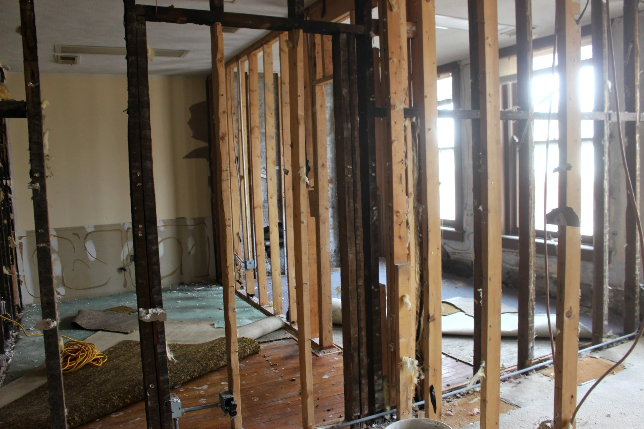 We've had lots of good news so far throughout demo, which is very rare with a building this age! One of the things we were excited to find was some original hardwood floors upstairs (under many layers of carpet!). We should be able to refinish these and patch any missing areas to match. This is a huge find, since we originally budgeted to put down all new floors upstairs.