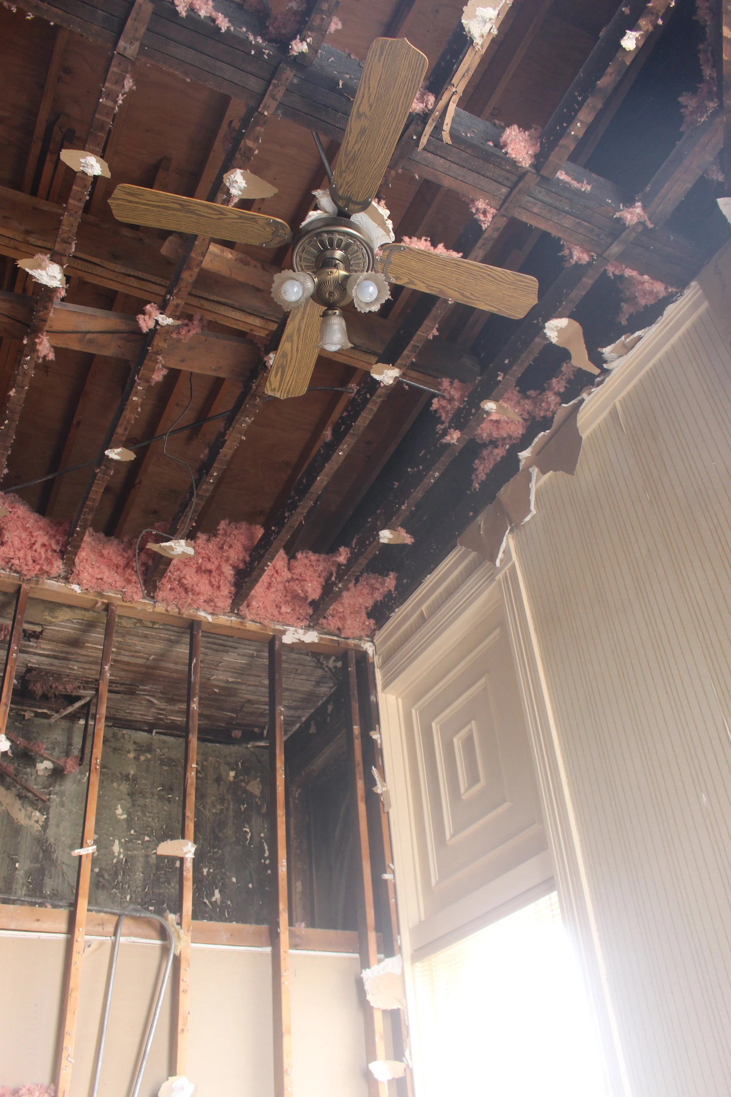 Above is part of the ceiling in the corner office- there are two levels: the beams that that ceiling fan is hanging from which are at 14 feet, and what extends beyond that is the attic area all the way up to the roof. We want to at least get this entire room back up the original 14 feet ceilings, but are hoping to make them even higher into the attic for a super dramatic and open space.