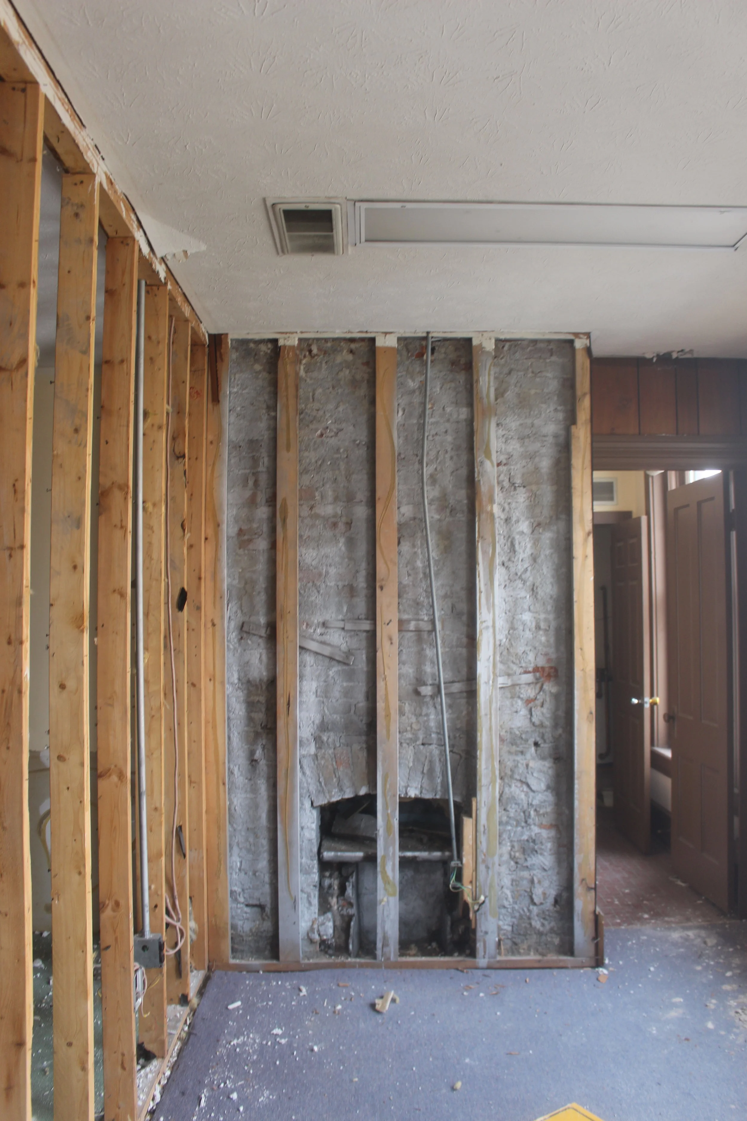 In the same room we uncovered this old fireplace behind the wall (that most likely also extends downstairs too). We also uncovered another fireplace that was covered with old wood panneling in the first office (see below). I'm not sure if we will be able to make these function again, but I still like the idea of having them in the spaces to add the historic feel and original character to the rooms.