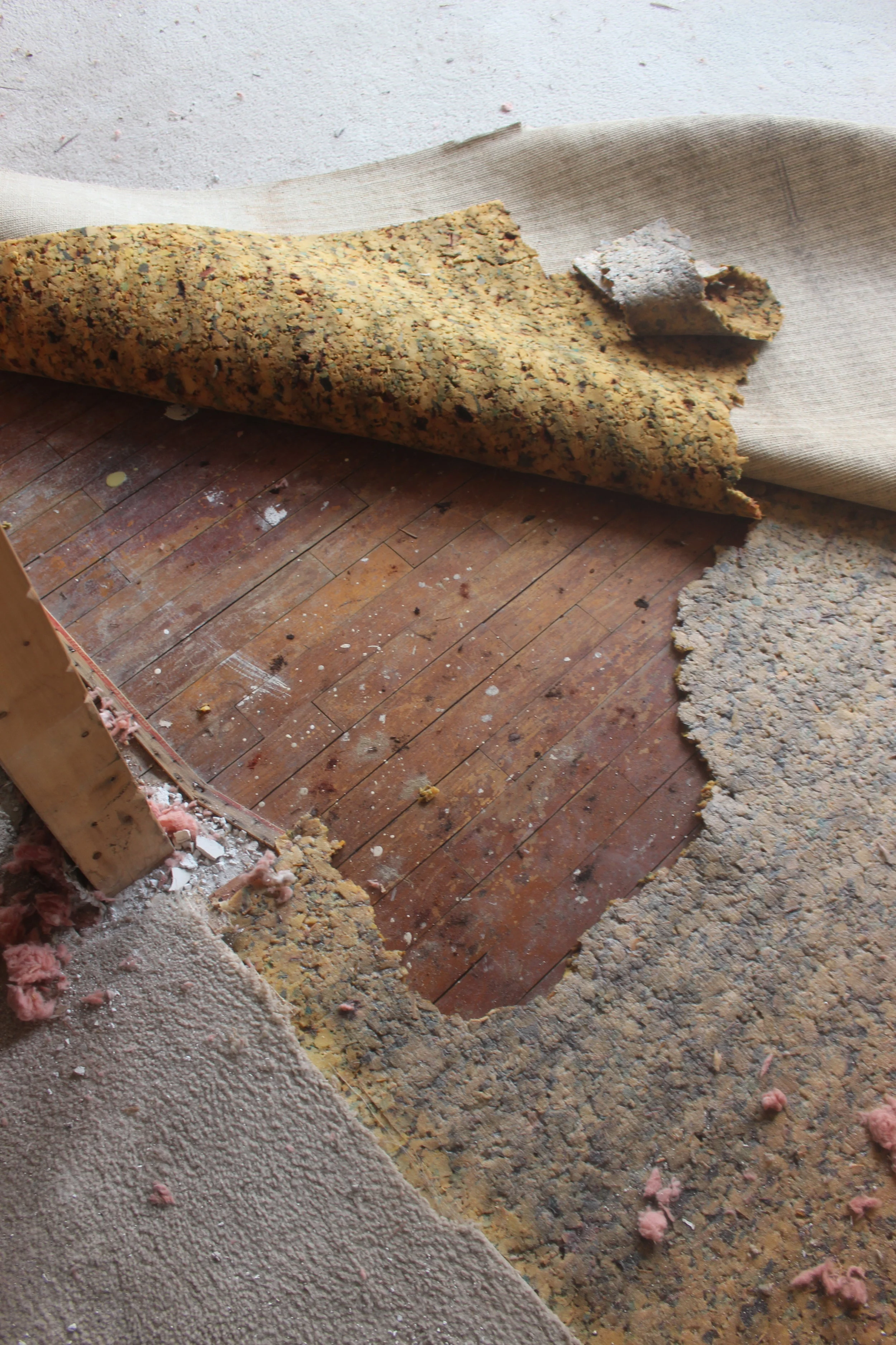 One more look at some of the floors we uncovered- every room of this upstairs had a different color of carpet when we bought the building! We were able to take some video footage of the entire building before demo that I hope to share soon so that you can get a better idea of the overall layout. The downstairs has already been completely cleared out as well and I'll be sharing more details on that next week!