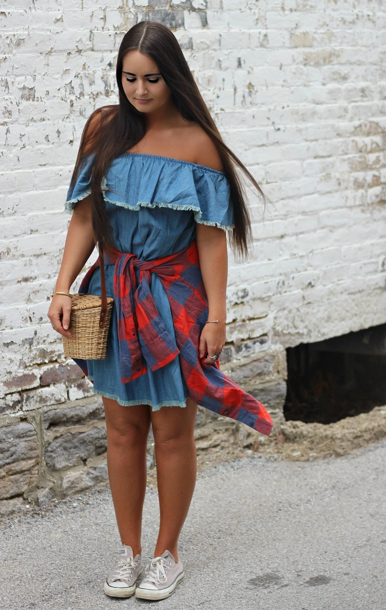 If I had to choose just one thing to wear all spring, it would probably be this chambray dress! I may have a few too many denim dresses but the off the shoulder style and frayed detail of this one makes it extra special! I love the laid-back feel and classic style of denim dresses- you can easily dress them up or down, and wear them year round! If you don't like off-the-shoulder dresses, this can easily be worn with the straps up on the shoulders like a regular dress too! I've linked all of my outfit details for you to shop + some other similar picks (this dress comes in a top version too!) at the end of this post!