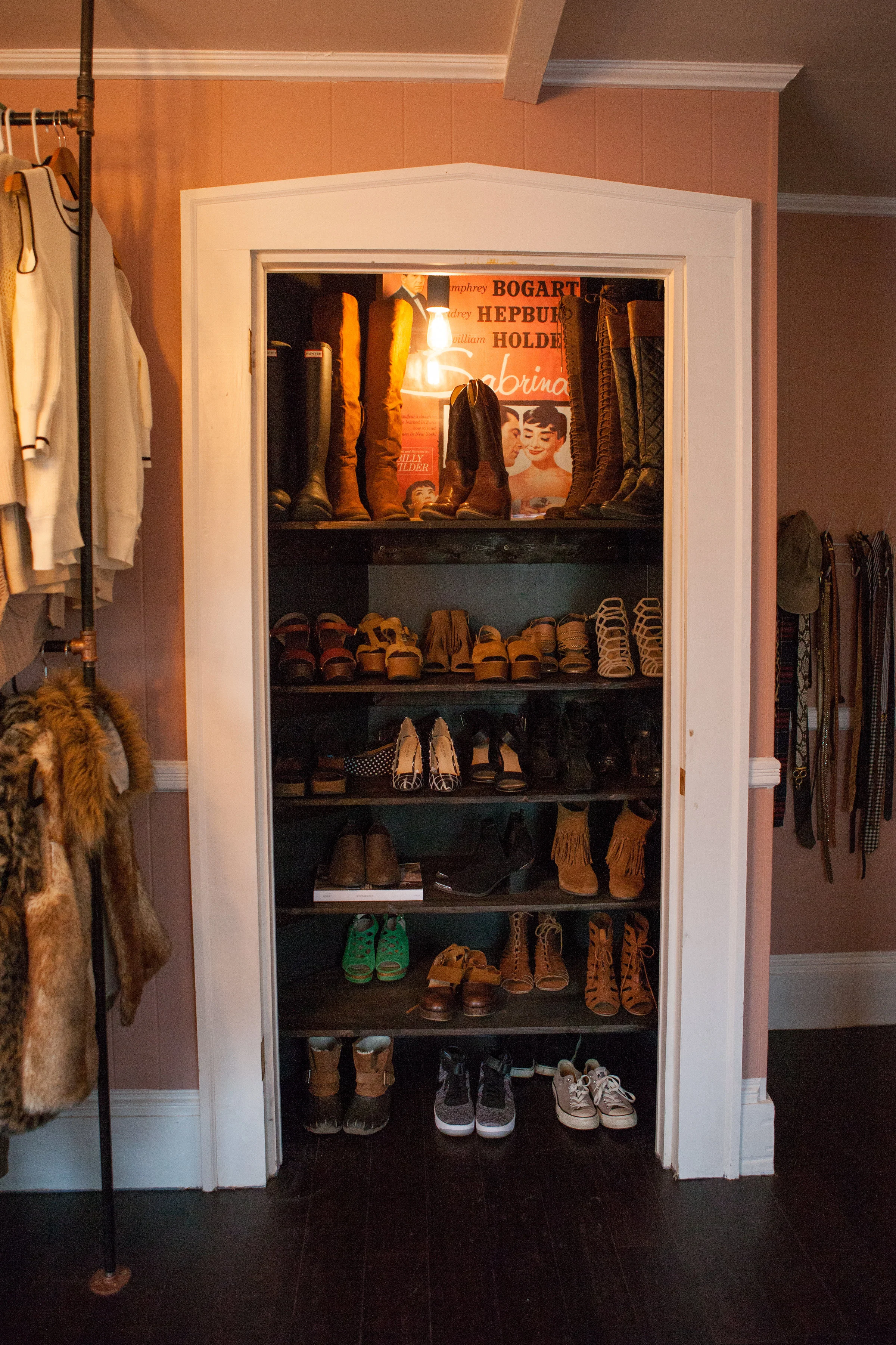 Another addition to the room is my shoe closet! My husband made custom floating shelves to fill the closet perfectly and I stained the wood dark. I also painted the inside of the closet a dark charcoal gray (with leftover paint from our entryway- Iron Ore by Sherwin Williams). We also switched out the pull-cord closet light for a small industrial look pendant that hangs down slightly above the shelving. I'd love to eventually get a cool old glass door to add to the front of the closet, but for now I will leave it open.