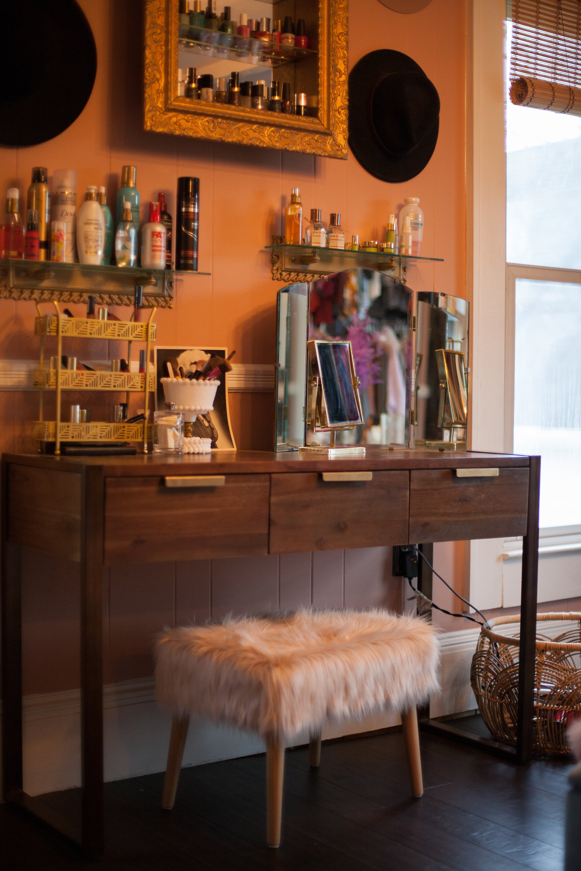 After finishing the clothing racks, I began choosing some furniture pieces that I actually loved to replace all the leftover random furniture I was using in here. The velvet bench, vanity stool, and glass side table were Homegoods finds and the rug is a $5 steal from an estate sale. I also found this desk that I am using as a vanity at Homegoods and I just spray painted the handles gold so that it would match the rest of the gold finishes in the room. I grabbed lots of acrylic organizers and mini wire baskets at Homegoods too to organize all my makeup inside these giant drawers. The shelves that I have above the vanity are all thrifting finds that I painted gold.