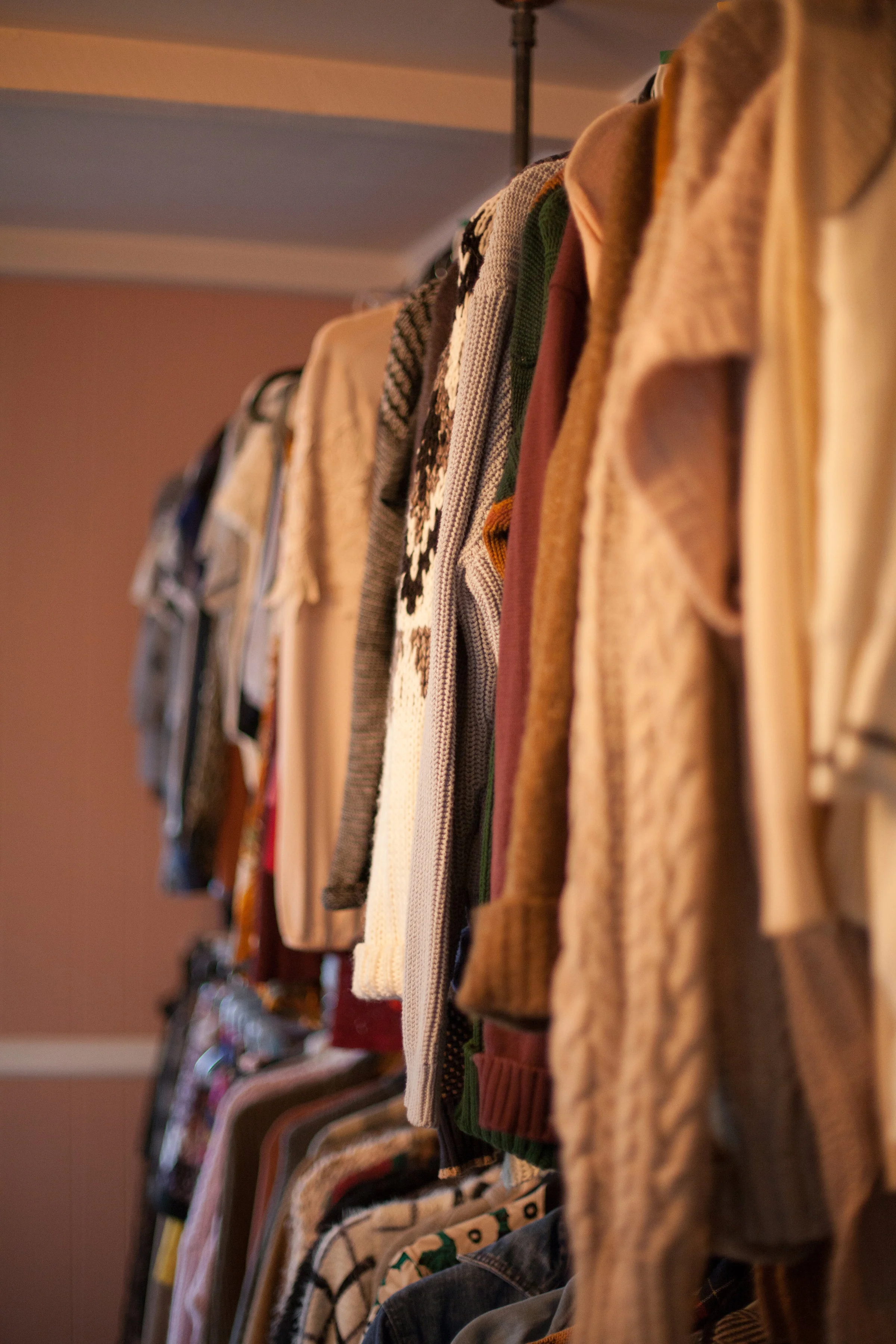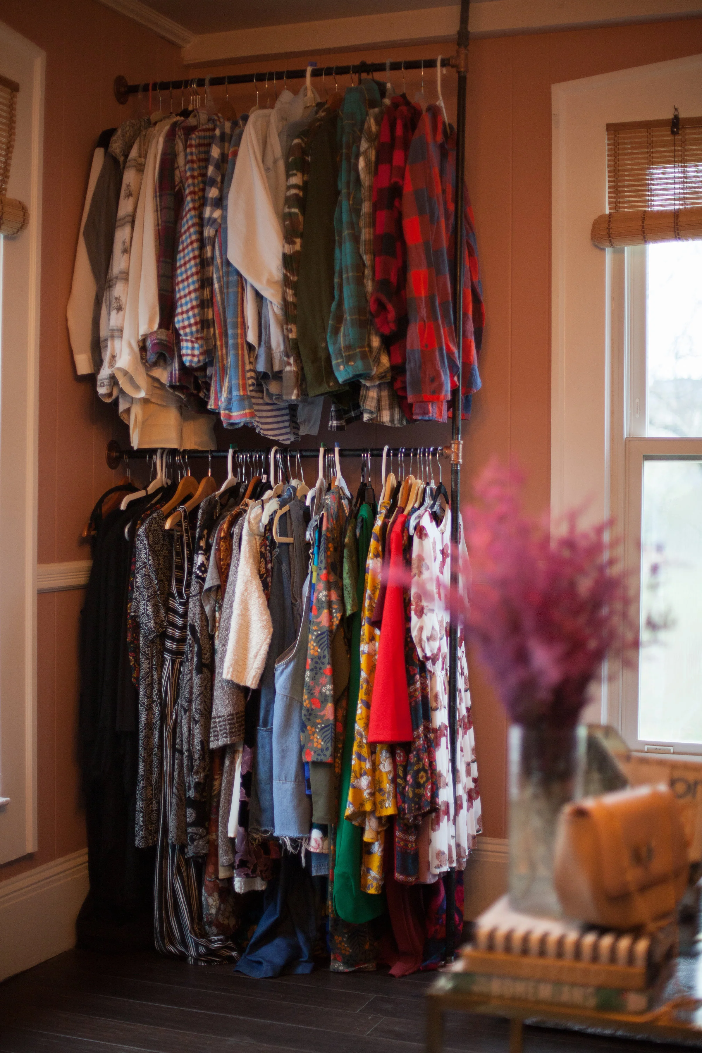 The first step in moving forward with this space was finally convincing my husband to help me build these pipe clothing racks. They were definitely not as easy as they looked, but I love the way they turned out and I have more than enough hanging space in here now. I shared some more details on these racks and the assembly in my progress post here.