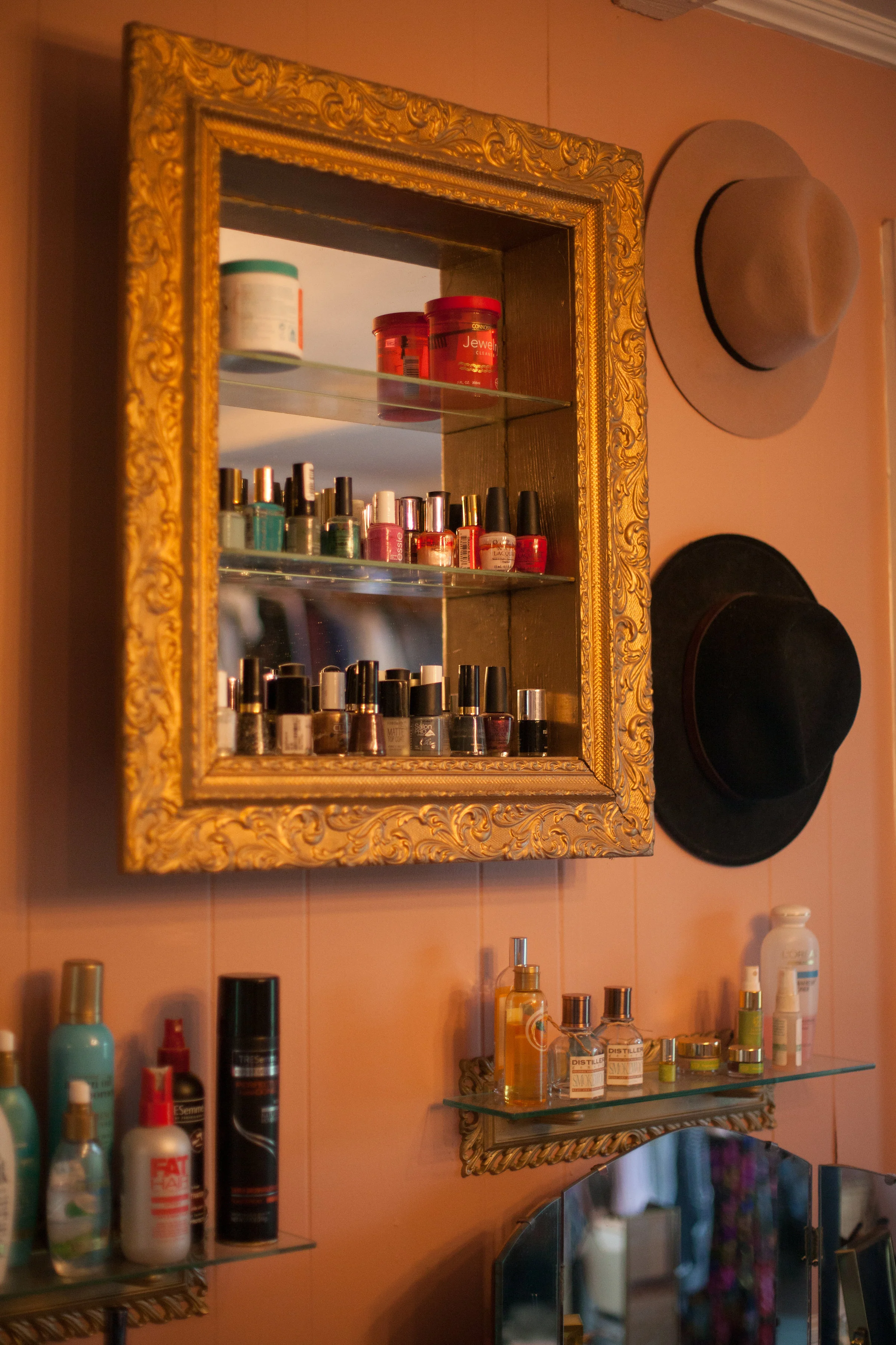 I ran out of shelf space for my hats so I used the blank spots above my vanity to just hang them on hooks! I love the way it looks and it keeps them from ever getting smooshed too!