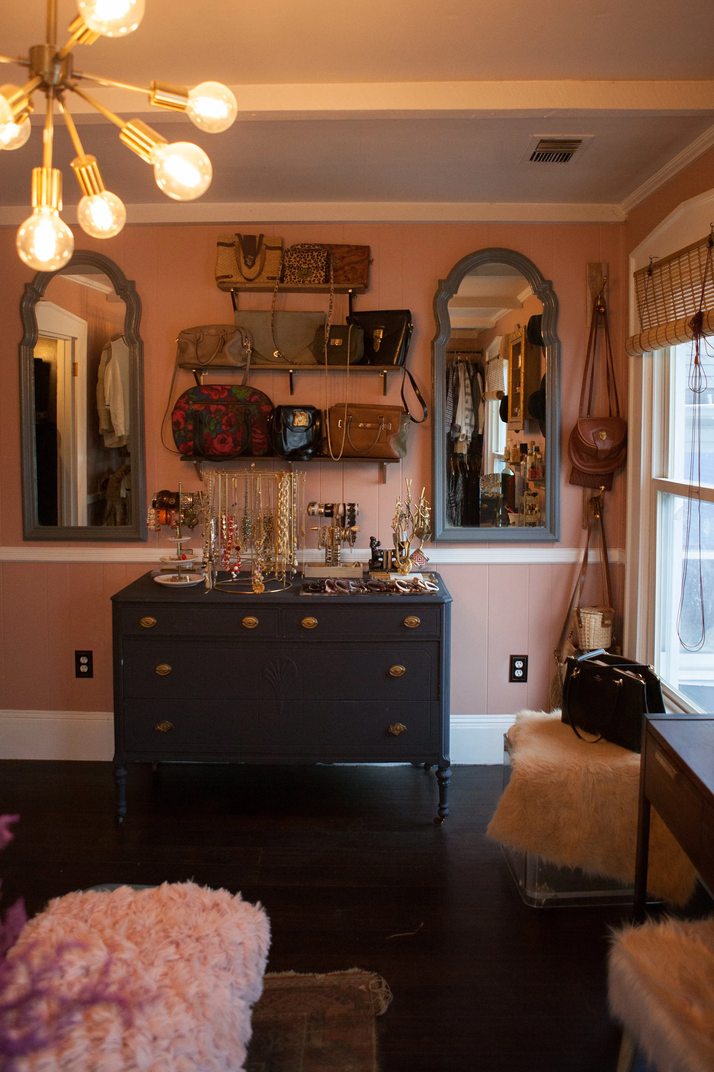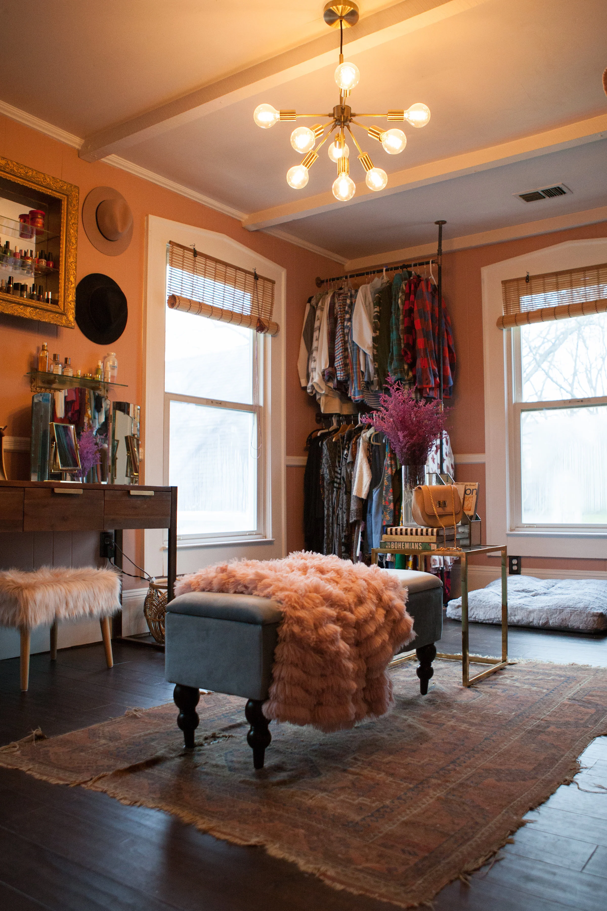 My latest focus at the house has been finally finishing up my dressing room! This space was not at all a priority when we first moved in and kind of became a hodge podge of temporary fixtures and furniture. We painted the walls (Art Deco Pink by Behr), put down the new laminate flooring (from Lumber Liquidators), and changed the light fixture during our renovation but besides that, not much decorating had happened in here until recently. You can see more before photos + my original plans for this space here.