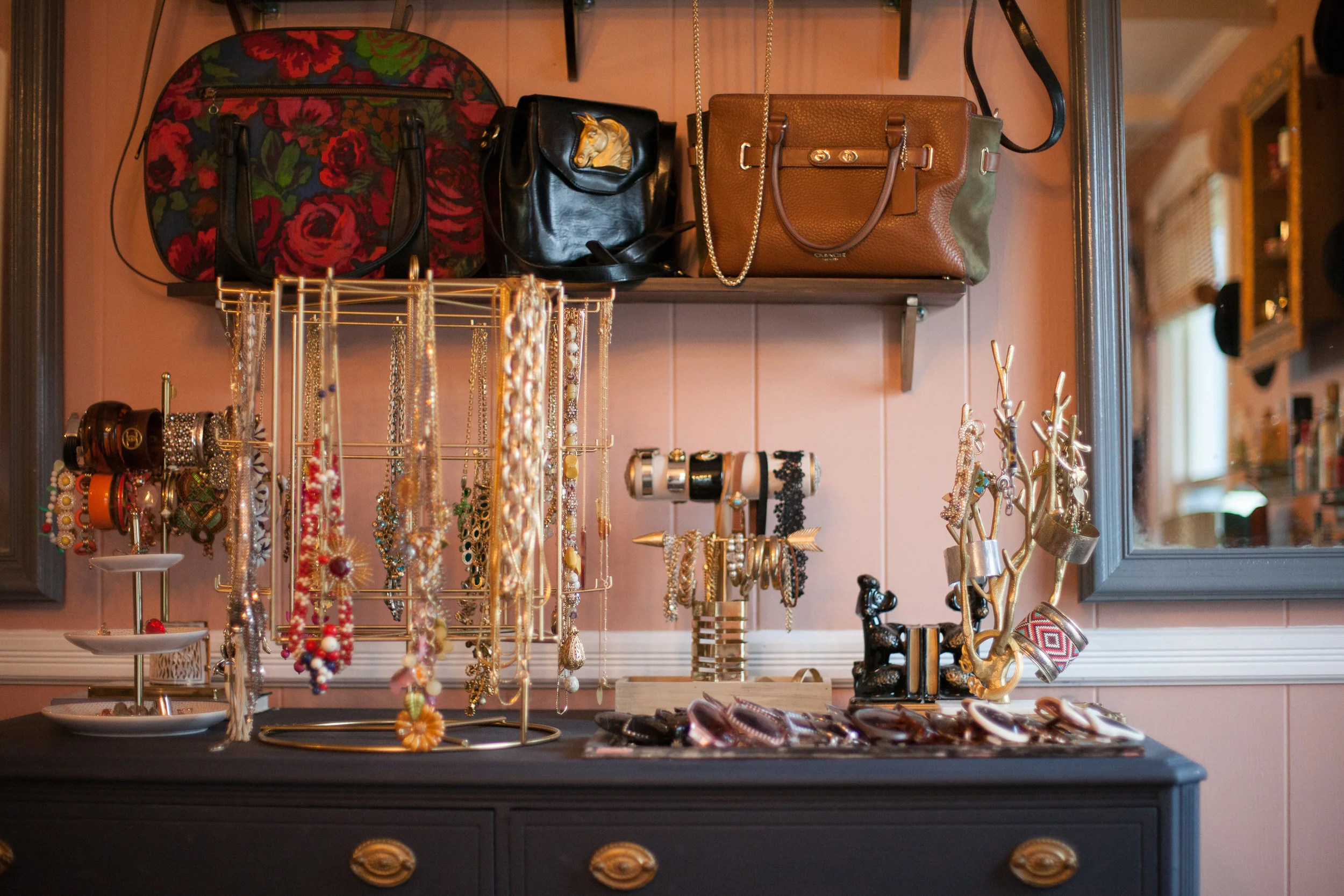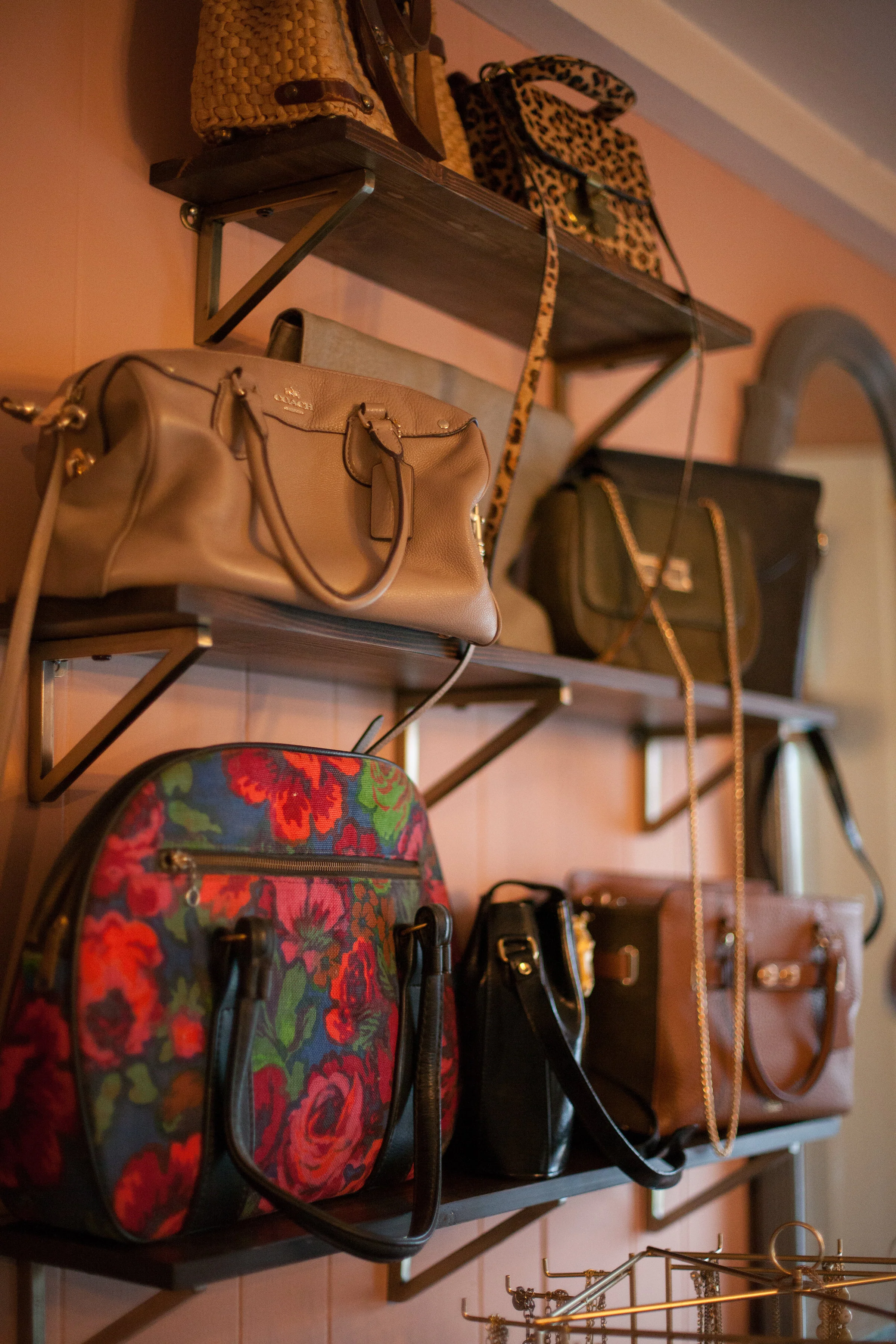 I am using the one open wall without clothing racks for my jewelry and accessory storage. I've used this antique dresser in several different rooms in our old house and I chalk painted it dark navy to use in here (you can find the chalk paint I used here). I placed all my jewelry displays on top of it- these are a mixture of vintage displays and new from Target (linked above). I can also use the drawers of the dresser for more jewelry trays and organizers as well as for jeans, shorts, scarves, etc. I added these beautiful wood + brass shelves from Target for purses above the jewelry table. I love the clean + modern mid-century look of these shelves and the pops of gold. The matching mirrors on each side of the dresser are vintage that I have painted quite a few times over the years, but I repainted them a medium gray for this room.
