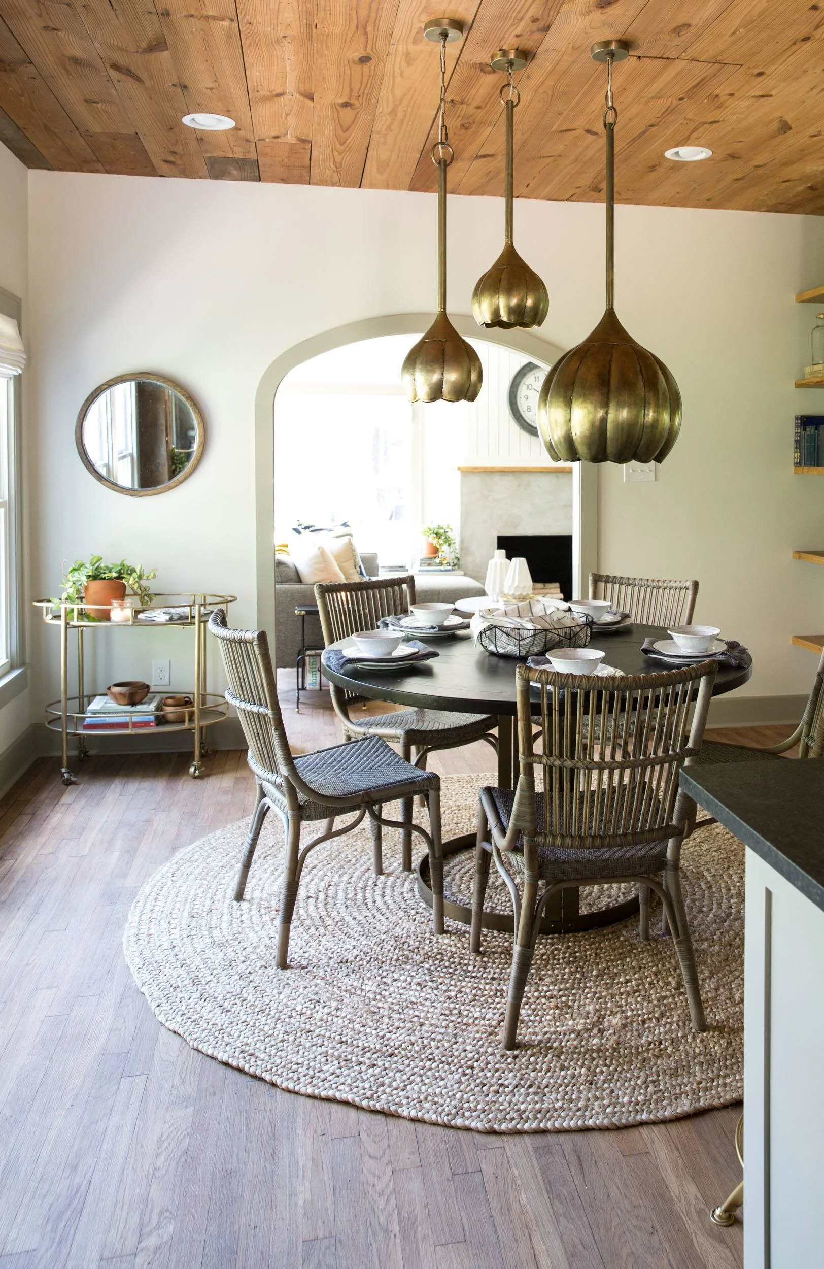 It was so hard for me to pick just one favorite space in this house, but the one that most stood out to me was this stunning dining area. Those brass pendants alone are enough to make me swoon, but the addition of the jute rug, rattan dining chairs, and round dining table make this room over the top amazing! I love the ship-lap ceiling too and how it contrasts with the metals and more modern elements. I've rounded up lots of similar light fixtures, rugs, + dining tables for you to shop below: