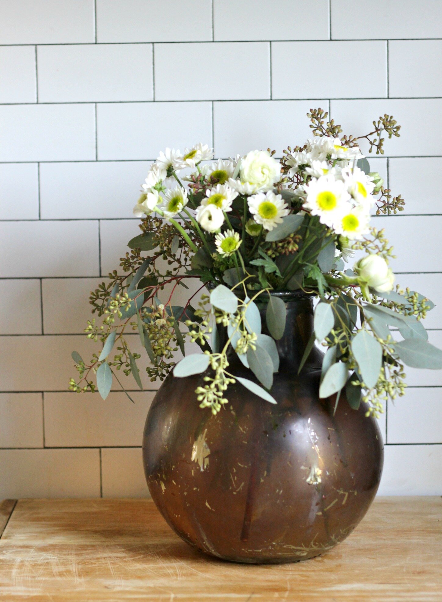 If you buy one thing from the floral section it should be eucalyptus! I grab a bunch or two of this every time I'm shopping for flowers. It lasts for weeks, dries beautifully, and is the perfect filler for just about any arrangement (and it also looks amazing on its own). There are several different varieties, and I like them all, but this seeded type is my favorite. You can find it at both Kroger and Trader Joe's usually and it is pretty inexpensive (usually well under $5 for a bunch). I paired it with some cut daisies (also from Trader Joe's) in a vintage jar for a classic springy arrangement. Add your eucalyptus to the jar first, trimming it so it doesn't droop too much, then fill in with your daisies (also trimming them so they are just long enough to poke out above the eucalyptus).