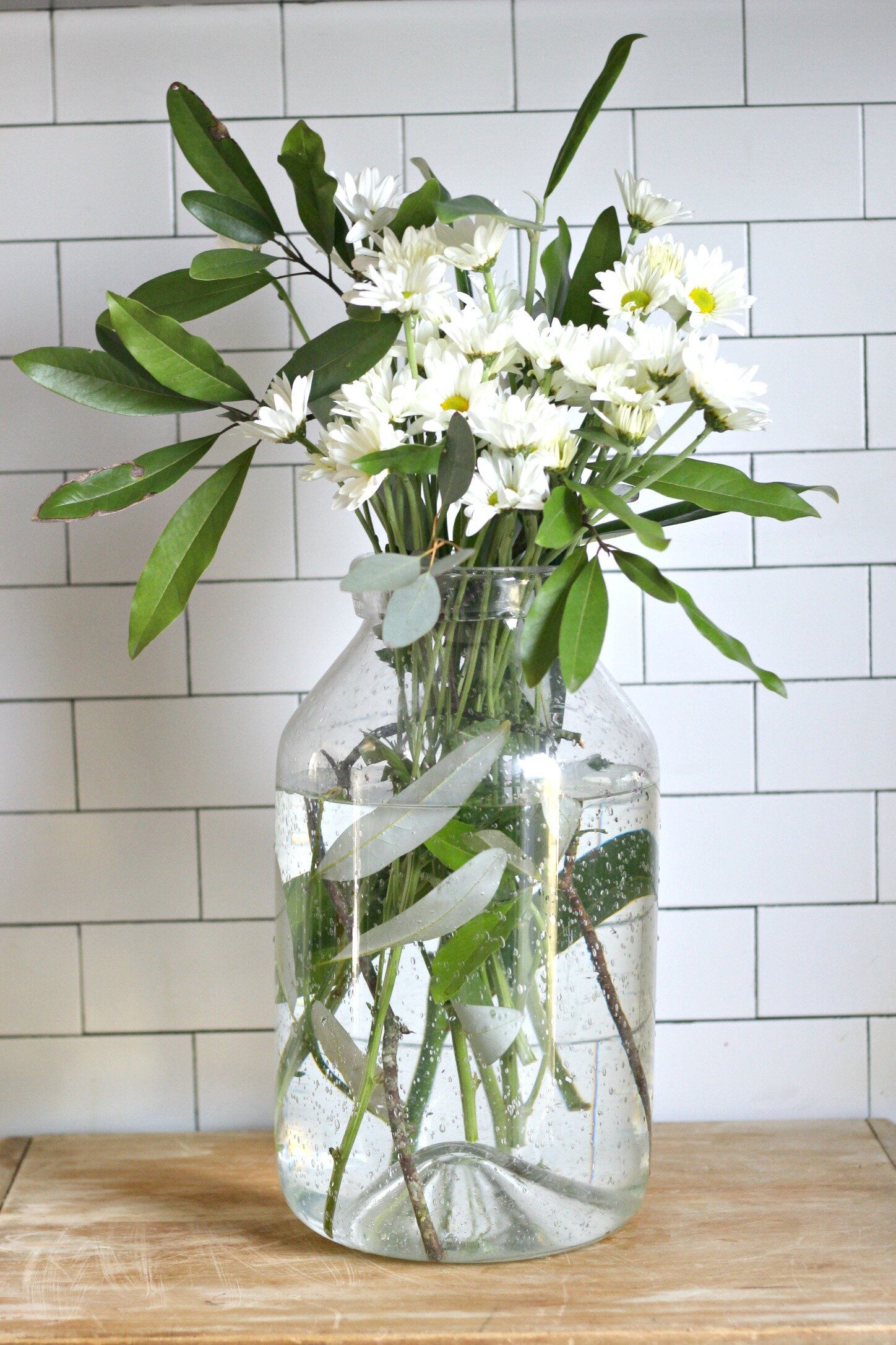 Whenever you don't have enough filler for your arrangement, just grab something out of your yard or off a tree or bush outside! That is what I did with this arrangement which is full of tree branches and daisies. Add the tree branches first and trim so that they are just the right height (they should last for several weeks too!). Next add the daisies into the branches so that they fill in the arrangement at different heights (trim them one at a time as you add). For a clear glass jar like this one, add just a capful of bleach to your water. It won't kill your flowers and it will keep your water clear and fresh looking (and smelling!). You can actually use this trick for any jar/vase of flowers and it keeps the water from getting yellow and gross.