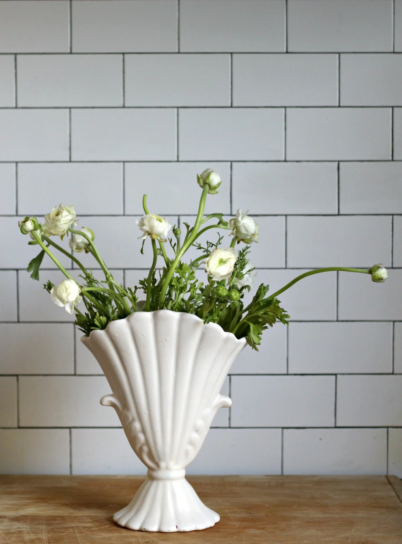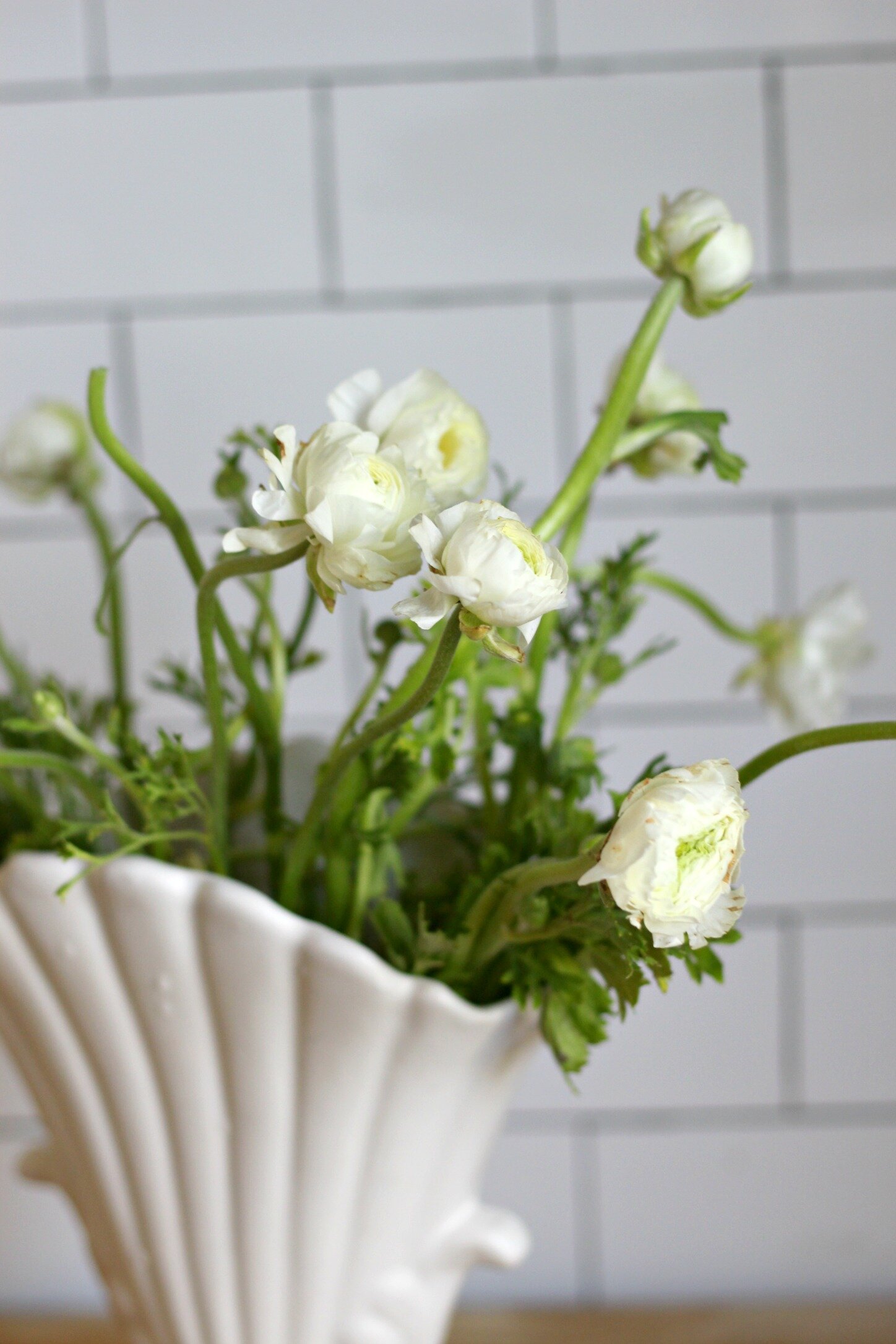 One more arrangement for my favorite flower! Some white Ranunculus in a vintage white vase- super simple + springy! I love how clean all the white looks against the bright green stems. Start looking for Ranunculus blooms at Trader Joe's in early March- they only have them for a few weeks, so take advantage while they do! It is hard to find anywhere else!