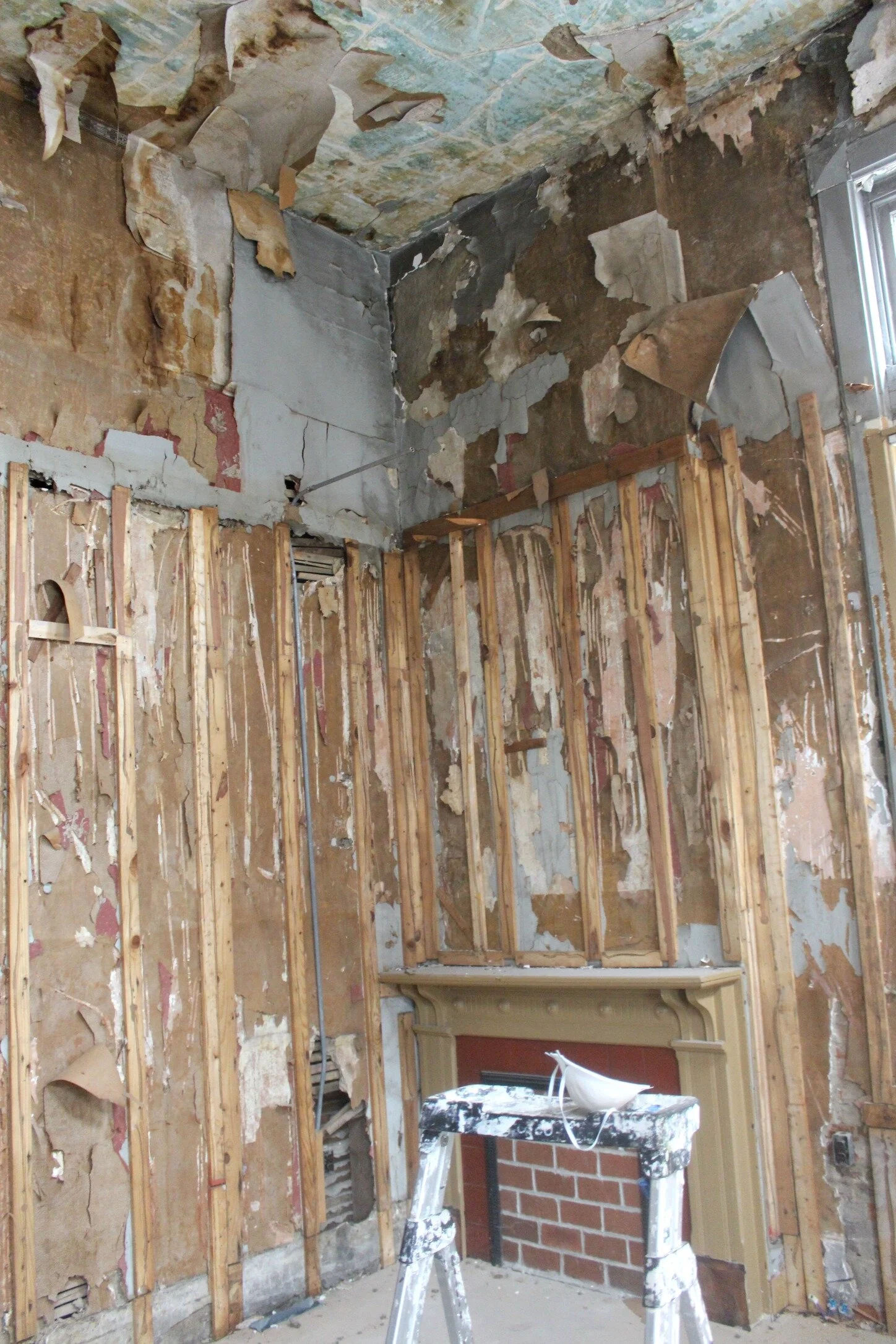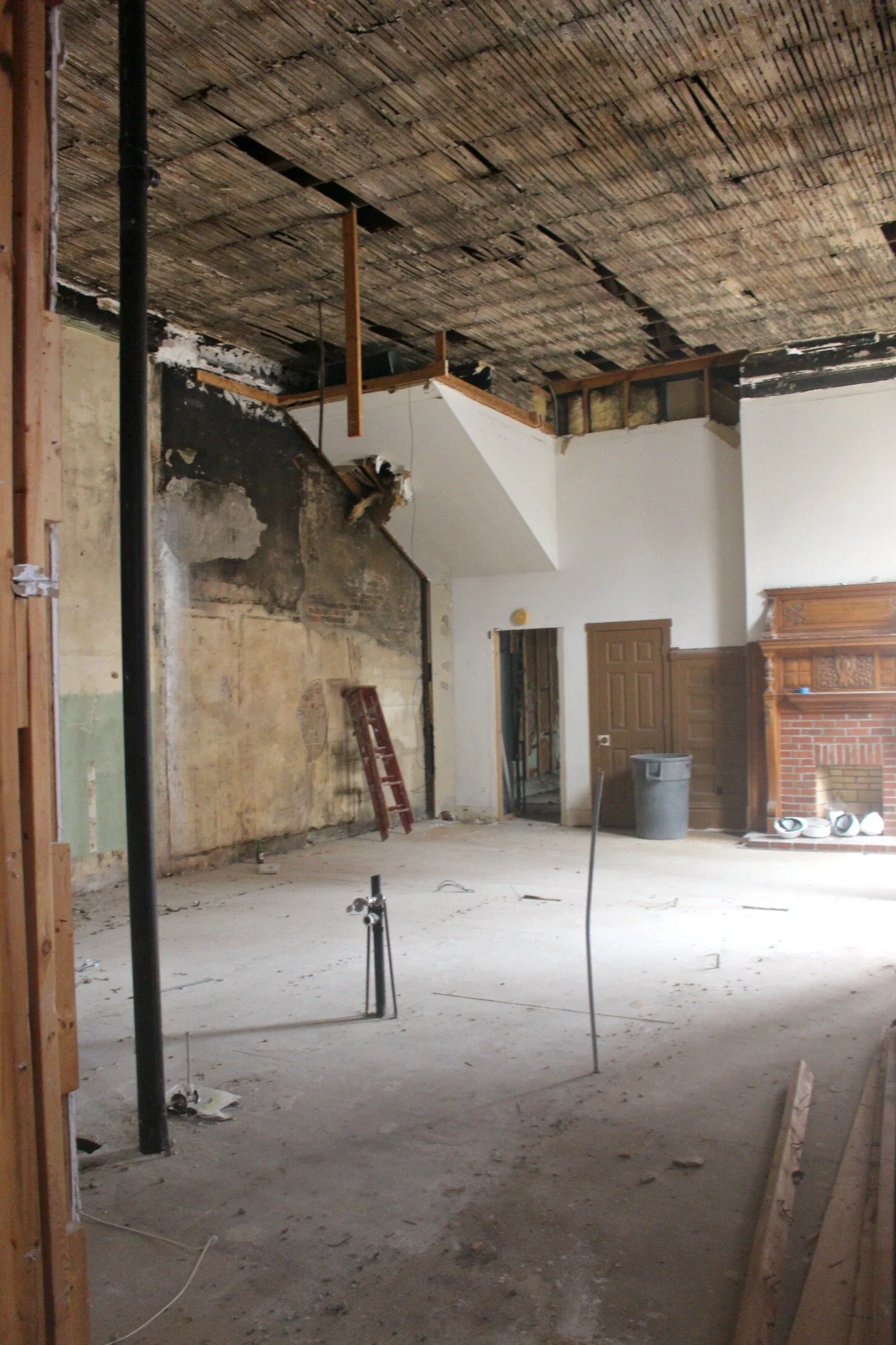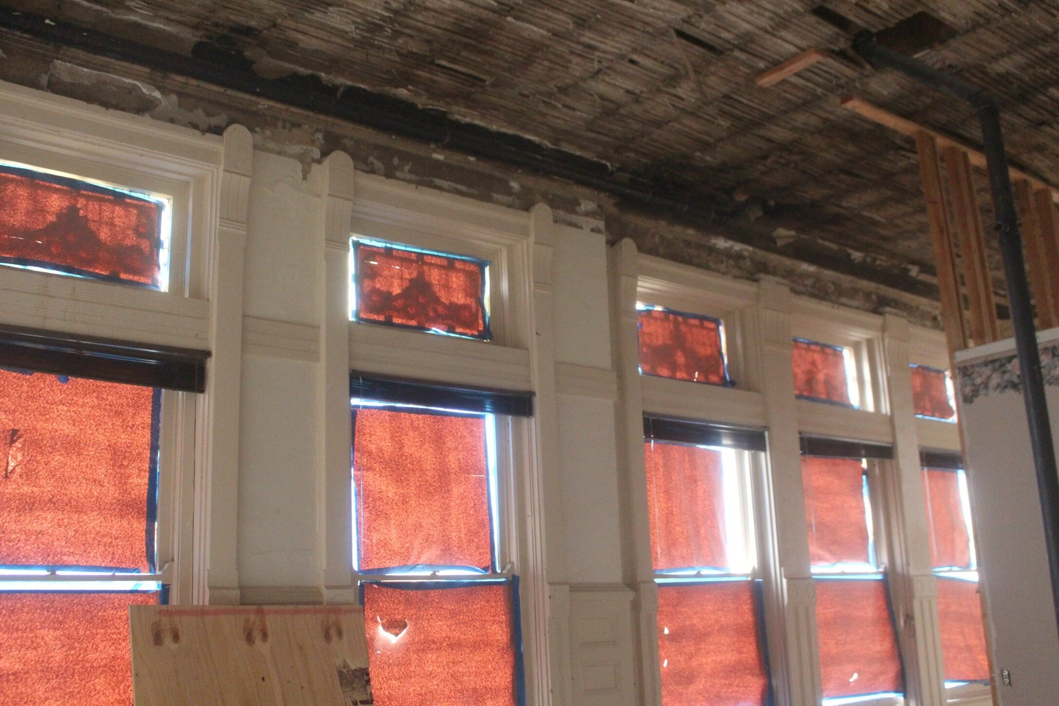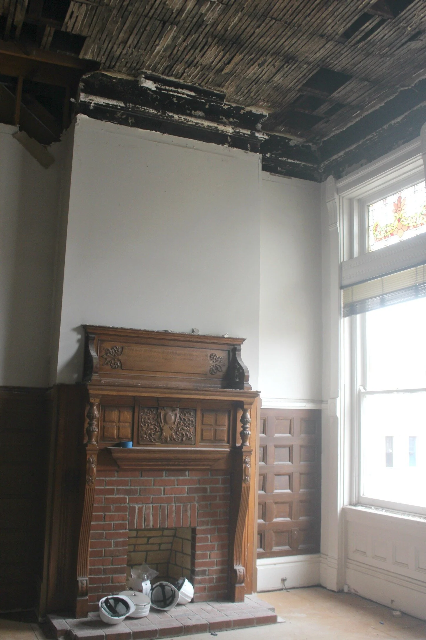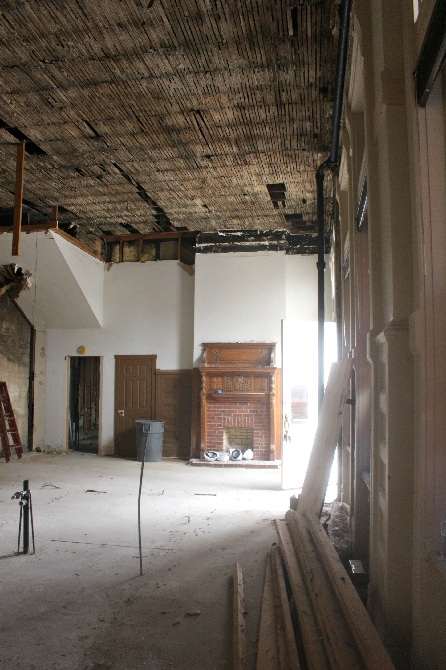There's also a fireplace in this area which we will try to restore so that it's not just filled in with brick! The ceilings used to be much lower in here and actually covered up that top smaller window that is above the larger windows, but that has now been removed and we are raising the ceiling back up to the original 14 foot height.