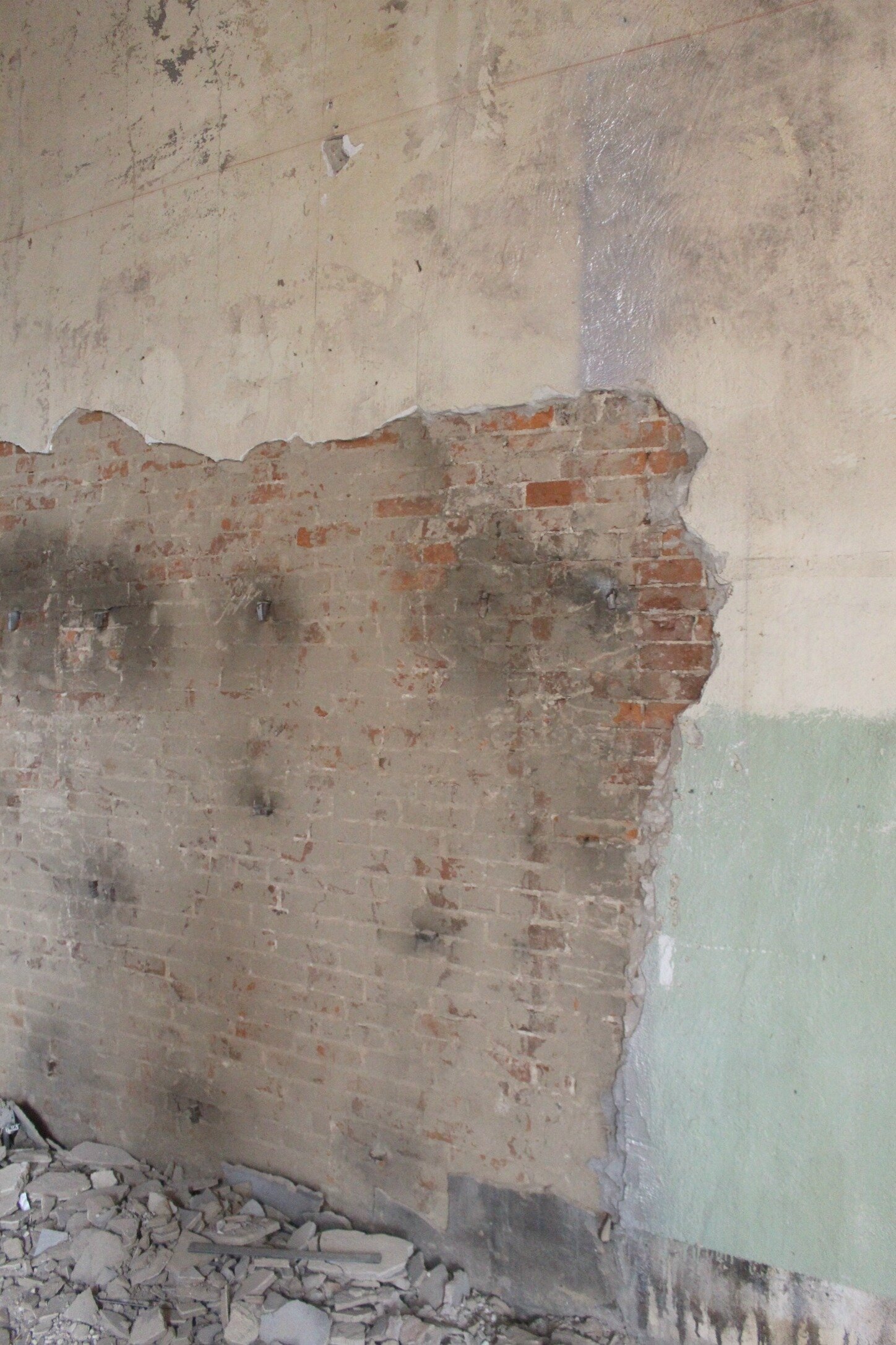 Lots of layers of insulation, plaster, paneling, wallpaper, and more in here that all have to be peeled back to get to the original brick. We want to expose as much of the original brick as we can on all the walls. They also have been saving any and all original trim, doors, etc. that they have removed so that we can repurpose and reuse as much of it as possible, even if it's in different areas.
