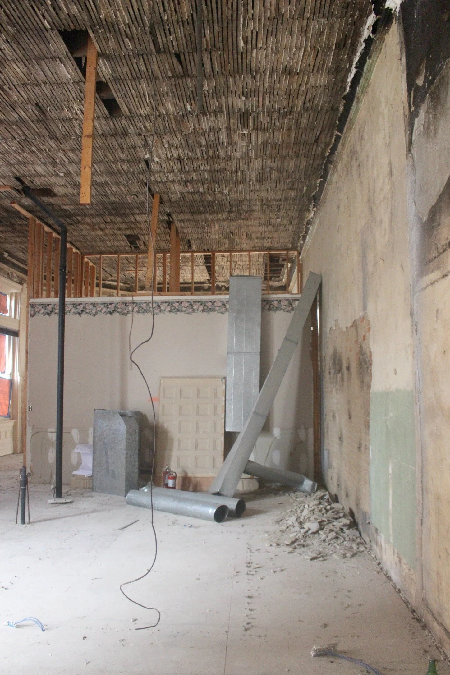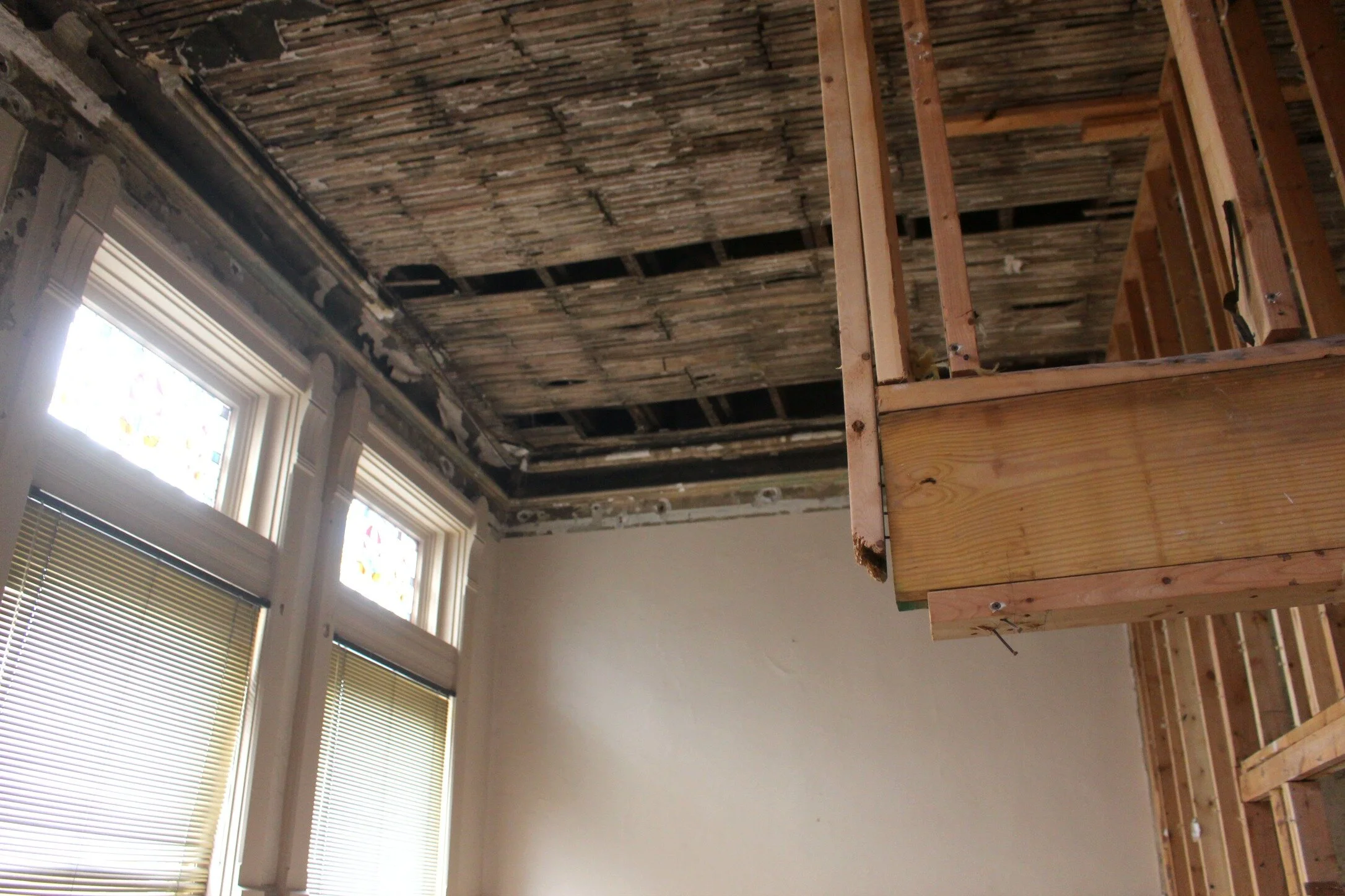 Unfortunately the original ceilings which probably featured some type of beautiful tiling was removed completely during one of the past renovations. You can see the original lath that the ceiling has been stripped down to, and we are considering keeping that as a unique element throughout the space if we can figure out how to clean it up a bit and fill in the missing areas.