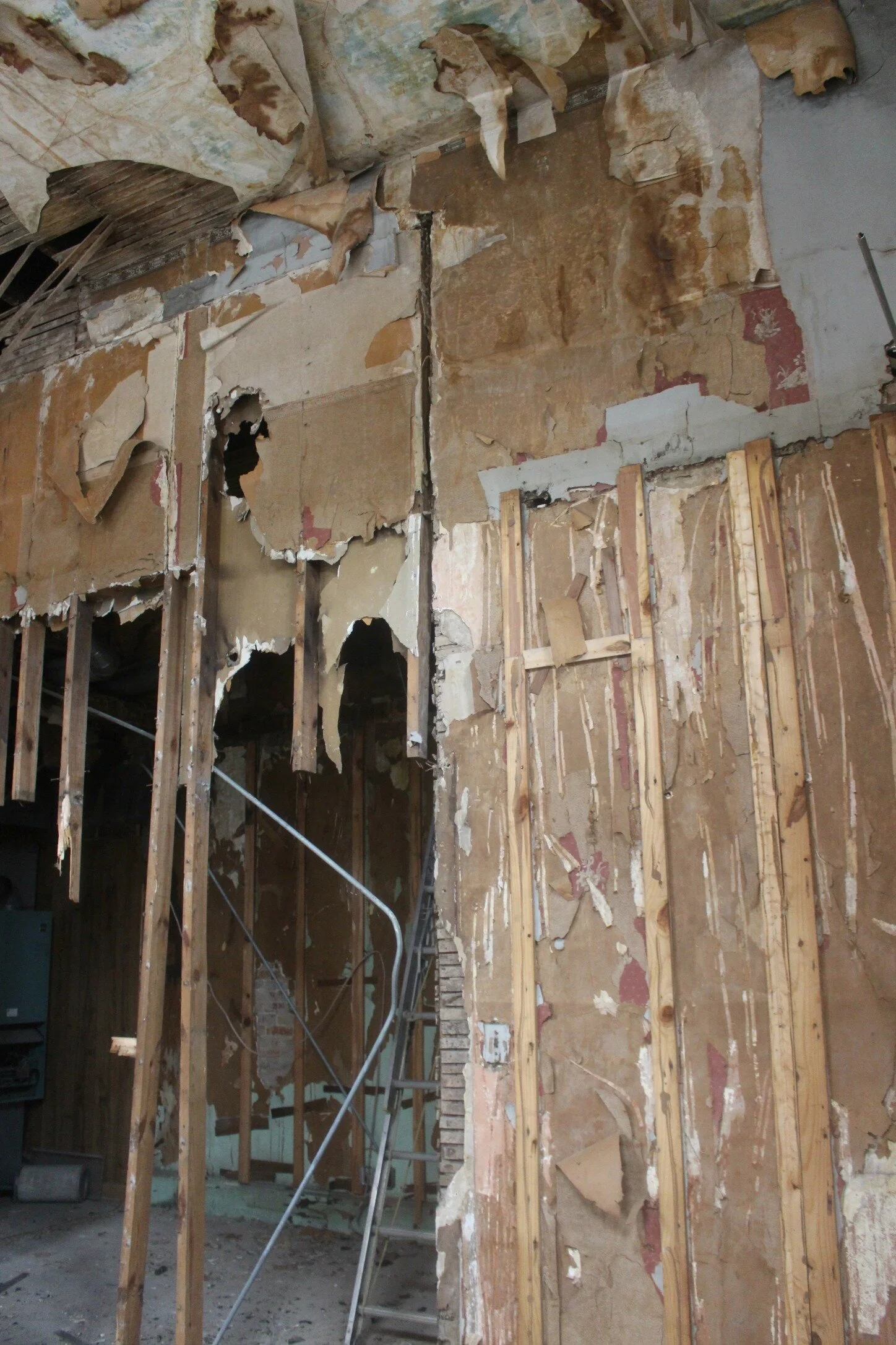 Above is a look at the wall that originally divided the space which they are still working on getting down. Luckily all the walls were added in later renovations so none of them have been load bearing so far.